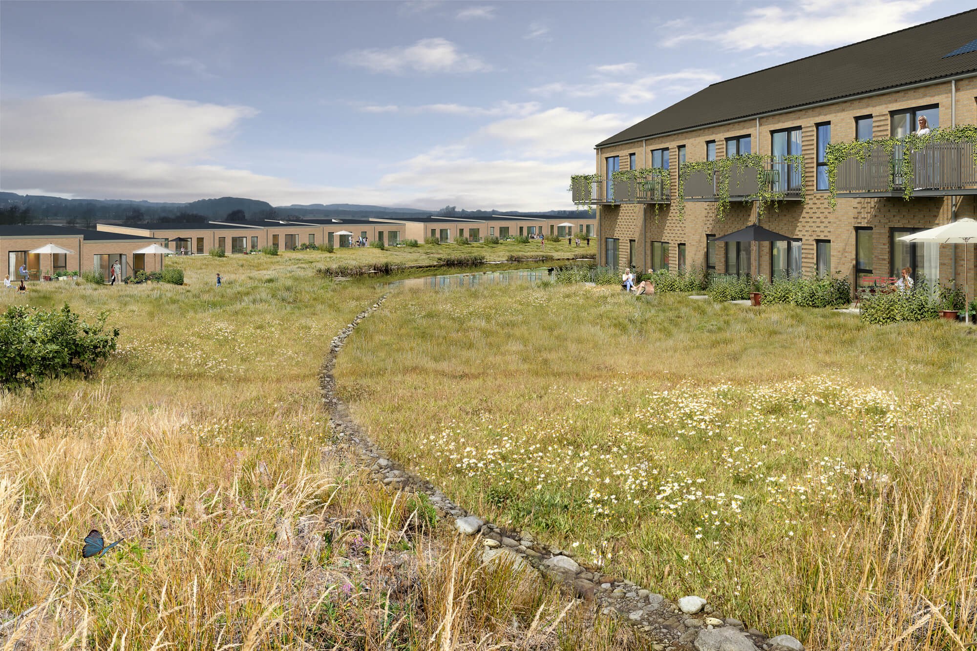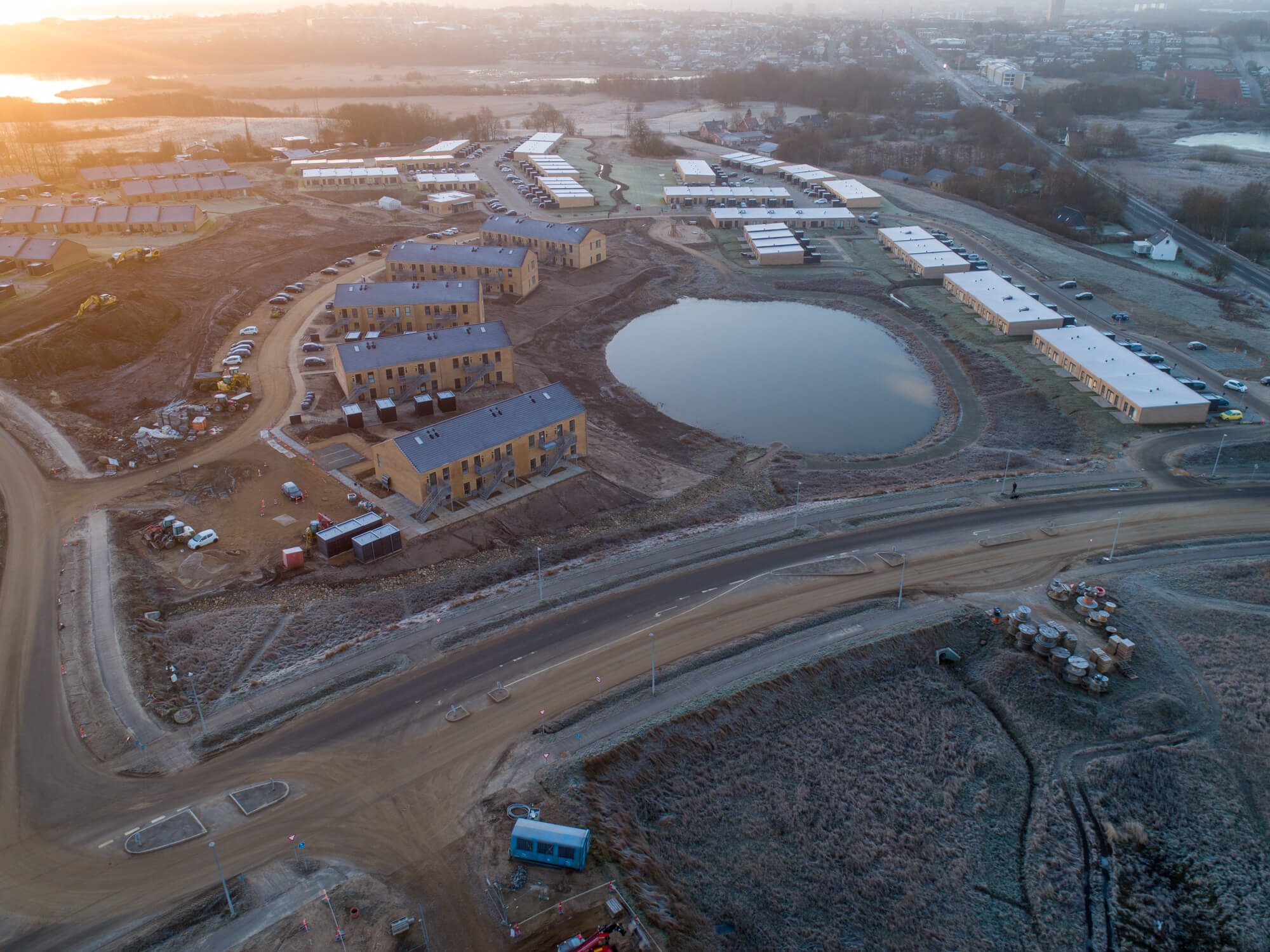 Naturbyen Nørrestrand i Horsens er en helt ny type bydel – en naturby. Her indtænkes den vilde, omkringliggende natur i byggeriet, som trækkes ind mellem boligerne i form af synlig regnvandshåndtering og grønne engarealer.