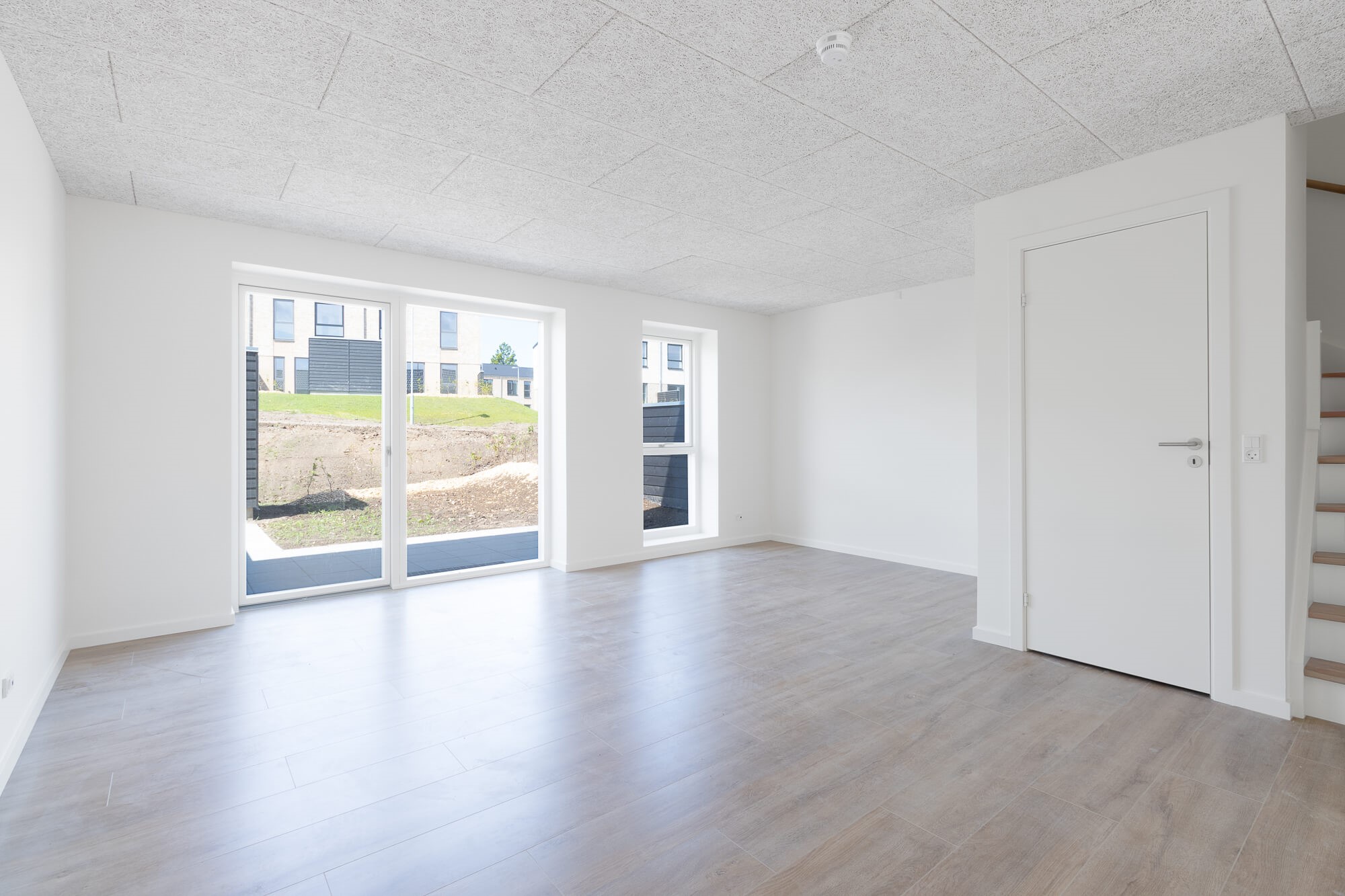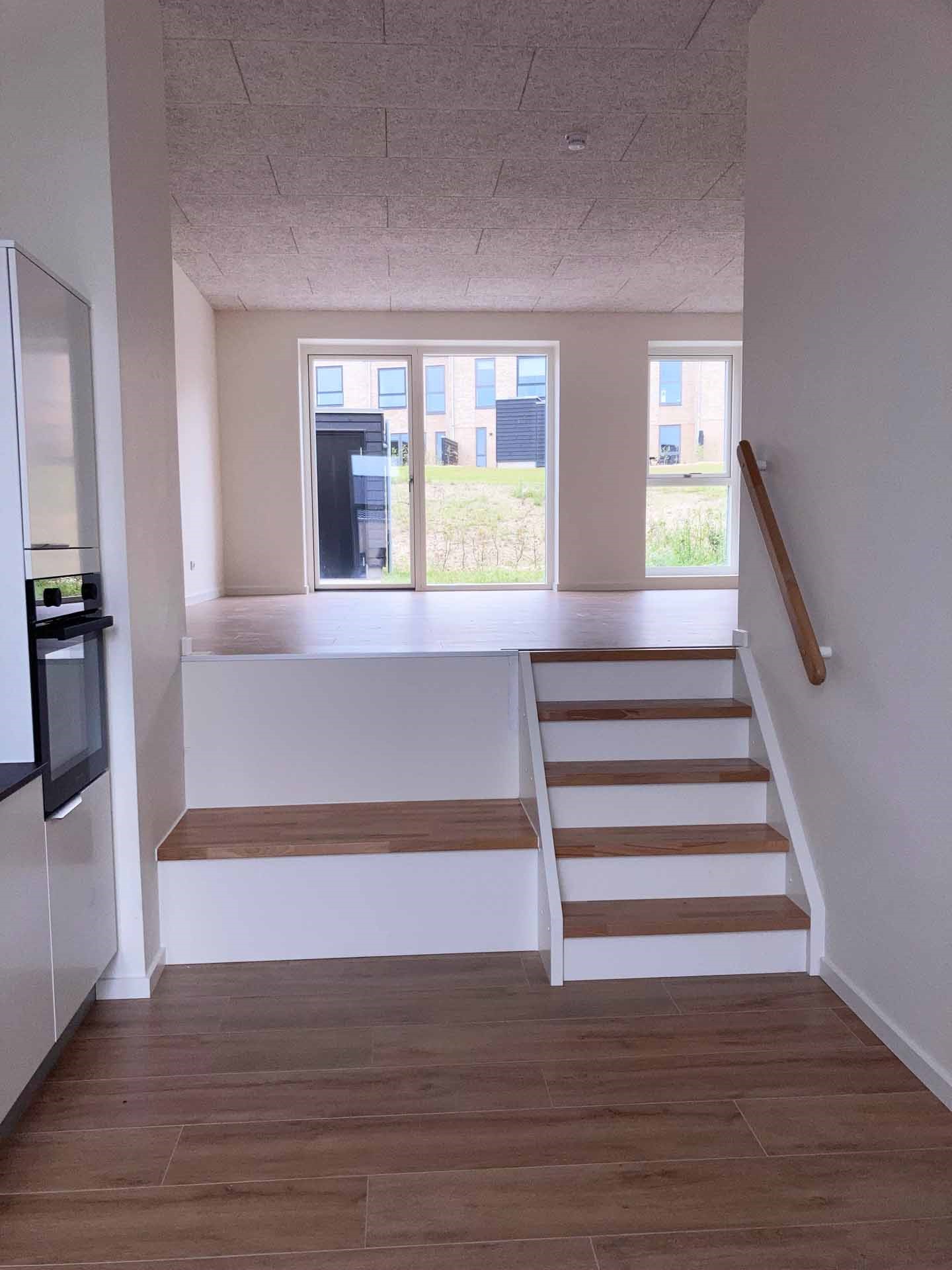 I denne femværelses bolig, finder du på stueetagen et dejligt køkken-alrum. Køkkenet er placeret i den ene ende af etagen og indeholder alt i hårde hvidevarer. Der sker en naturlig inddeling mellem køkken og stue gennem et mindre niveauspring udført med en trappe og en tilhørende lille siddeplint. Stue og spiseområde ligger placeret i modsatte ende og her er der god plads til at indrette sig som man ønsker. Fra stuen kan du hurtigt træde ud på den fine tilhørende terrasse.