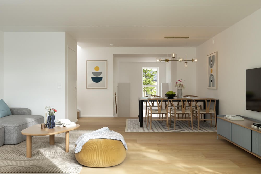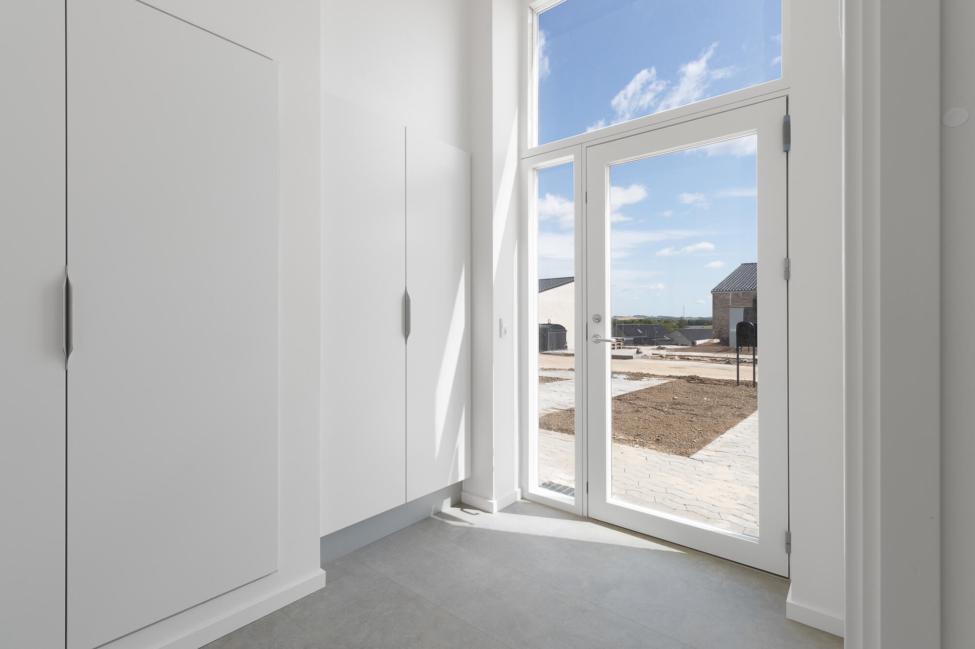 Når du træder ind i boligen, bliver du mødt af den indbydende entré. Her er der gode opbevaringsmuligheder, og ønsker du yderligere opbevaring, er der også plads til dette. Fra entreen er der direkte adgang til køkken-alrum og badeværelse.