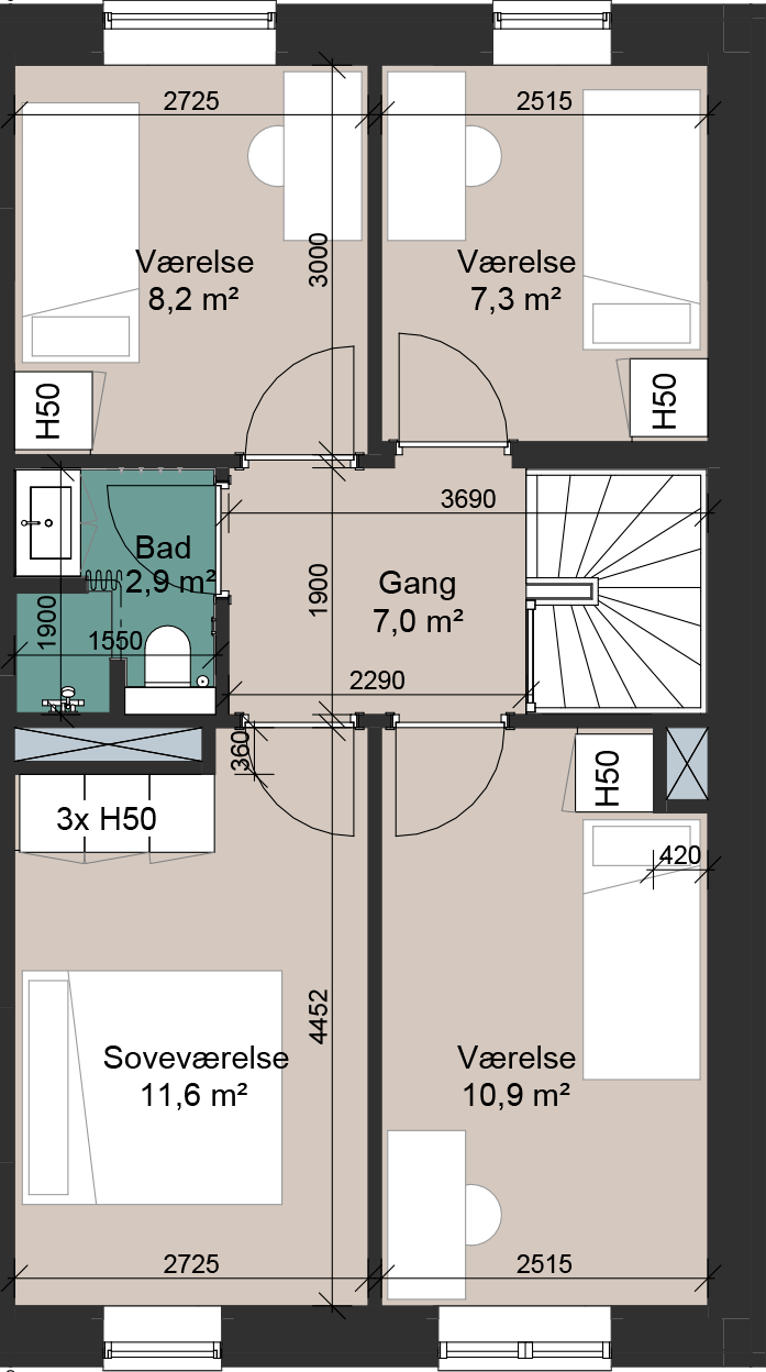 På boligens 1. sal er de fire værelser placeret. Soveværelset, som er boligens største værelse, er indrettet med 3 fastmonterede højskabe, hvor der er god plads til tøj og andet. De resterende tre værelser har hver et opbevaringsskab med plads til flere. Værelserne har en fin størrelse og kan dermed fungere som både børneværelse, kontor og gæsteværelse.