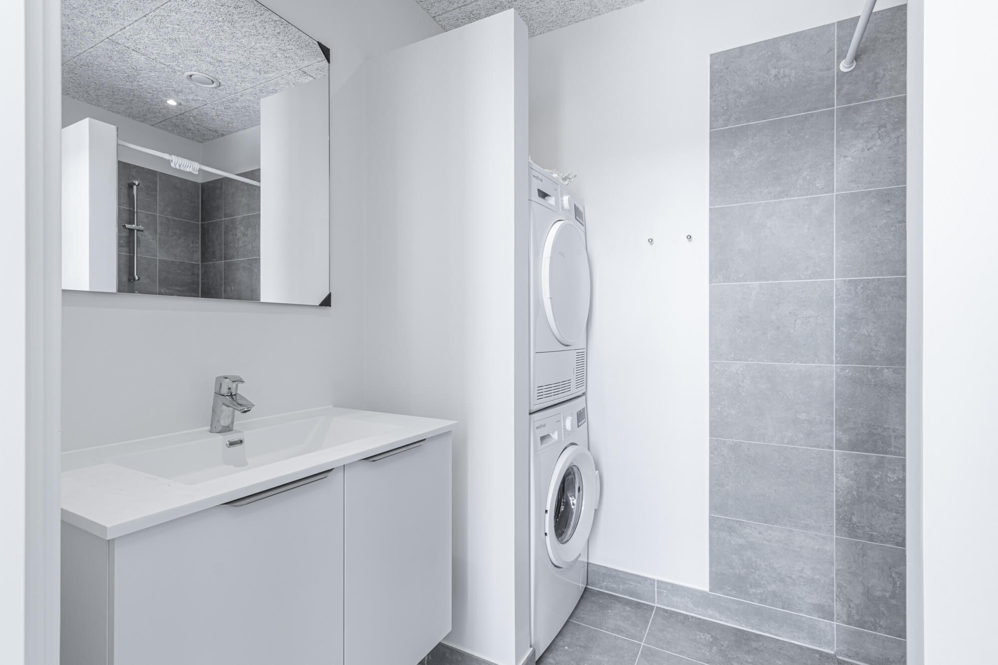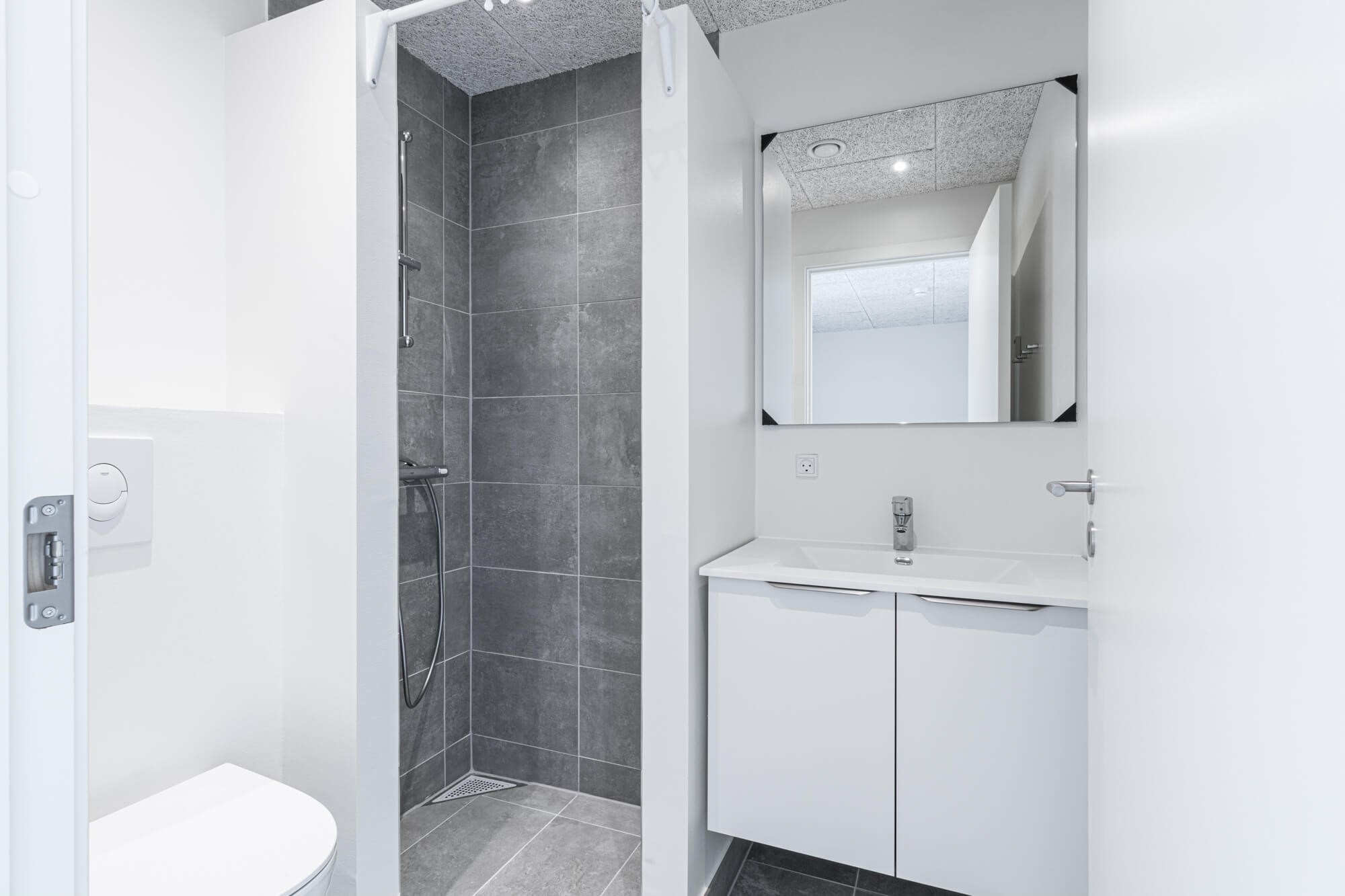 Til denne skønne bolig hører til funktionelle badeværelser. Hvert bad er opført med bruseniche, toilet, og en håndvask med plads til opbevaring under. Badeværelset på stueetagen har yderligere en vaskesøjle med både vaskemaskine og tørretumbler.