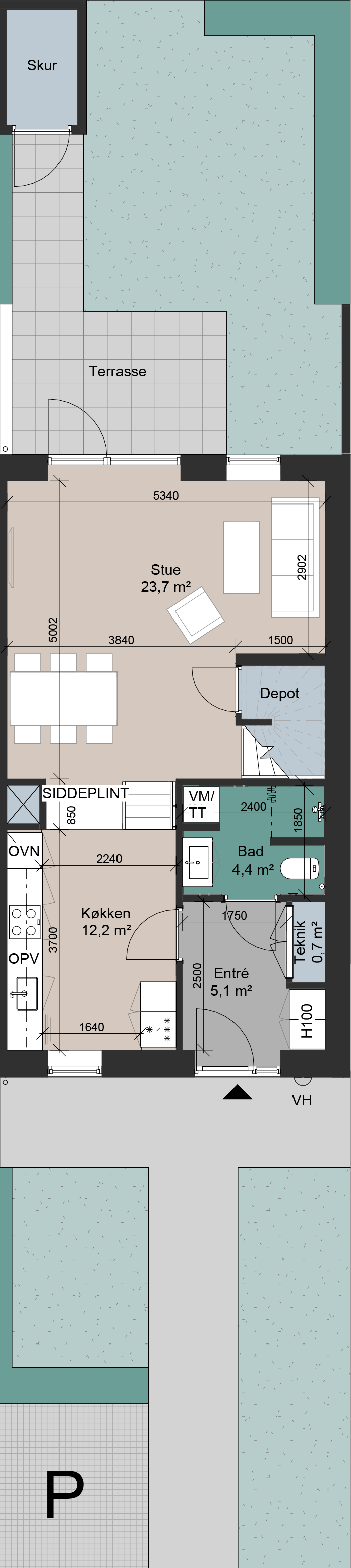 Til boligen hører til skønne uderum. Foran boligen er der et fint flisebelagt areal hvor der er god plads til en bænk, cafésæt og planter. Bag boligen og i forlængelse af stuen finder du en mindre terrasse og et hyggeligt lille græsareal. Boligen har privat parkering og eget skur. Obs. alle billeder og plantegninger er vejledende.