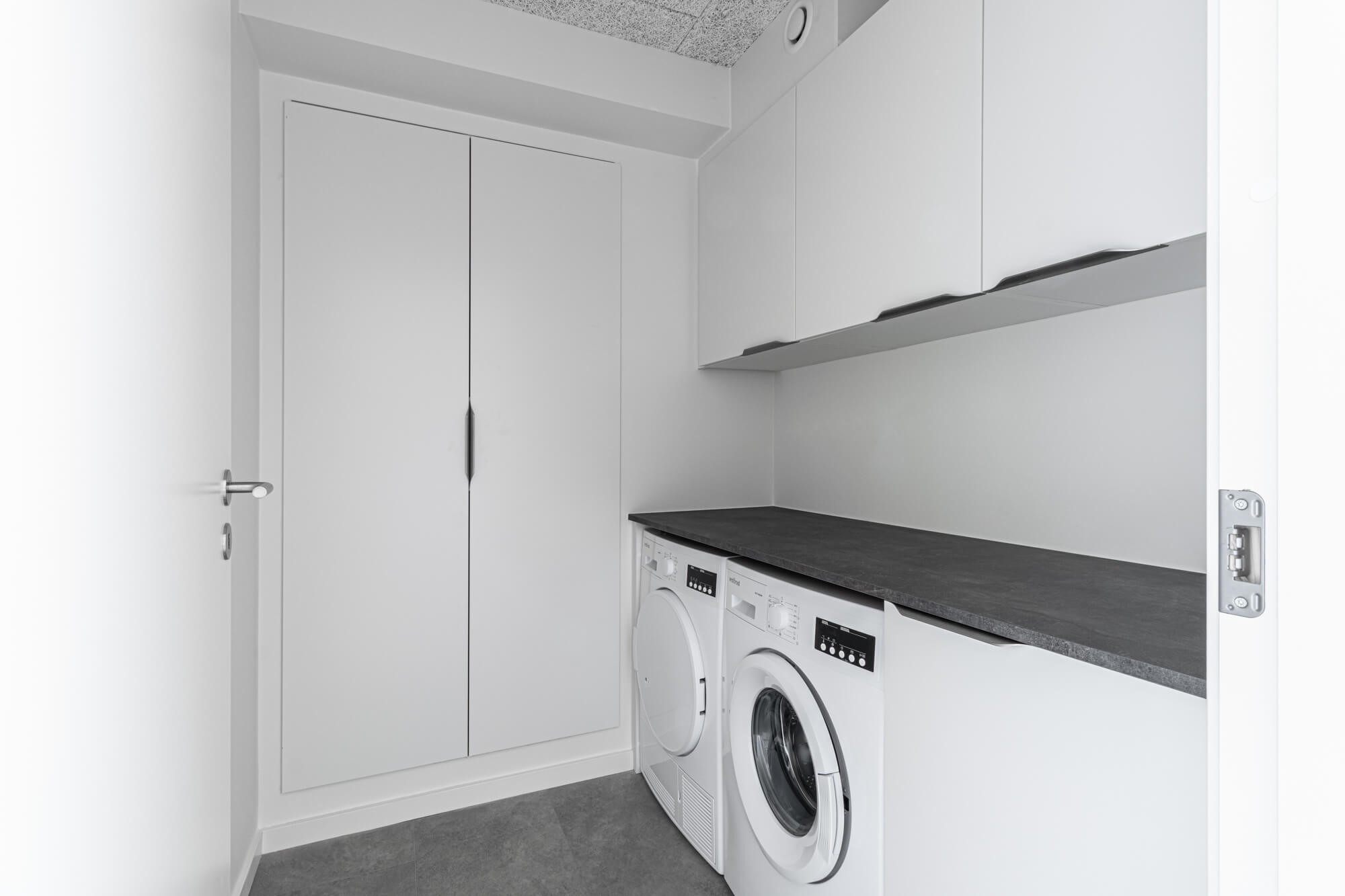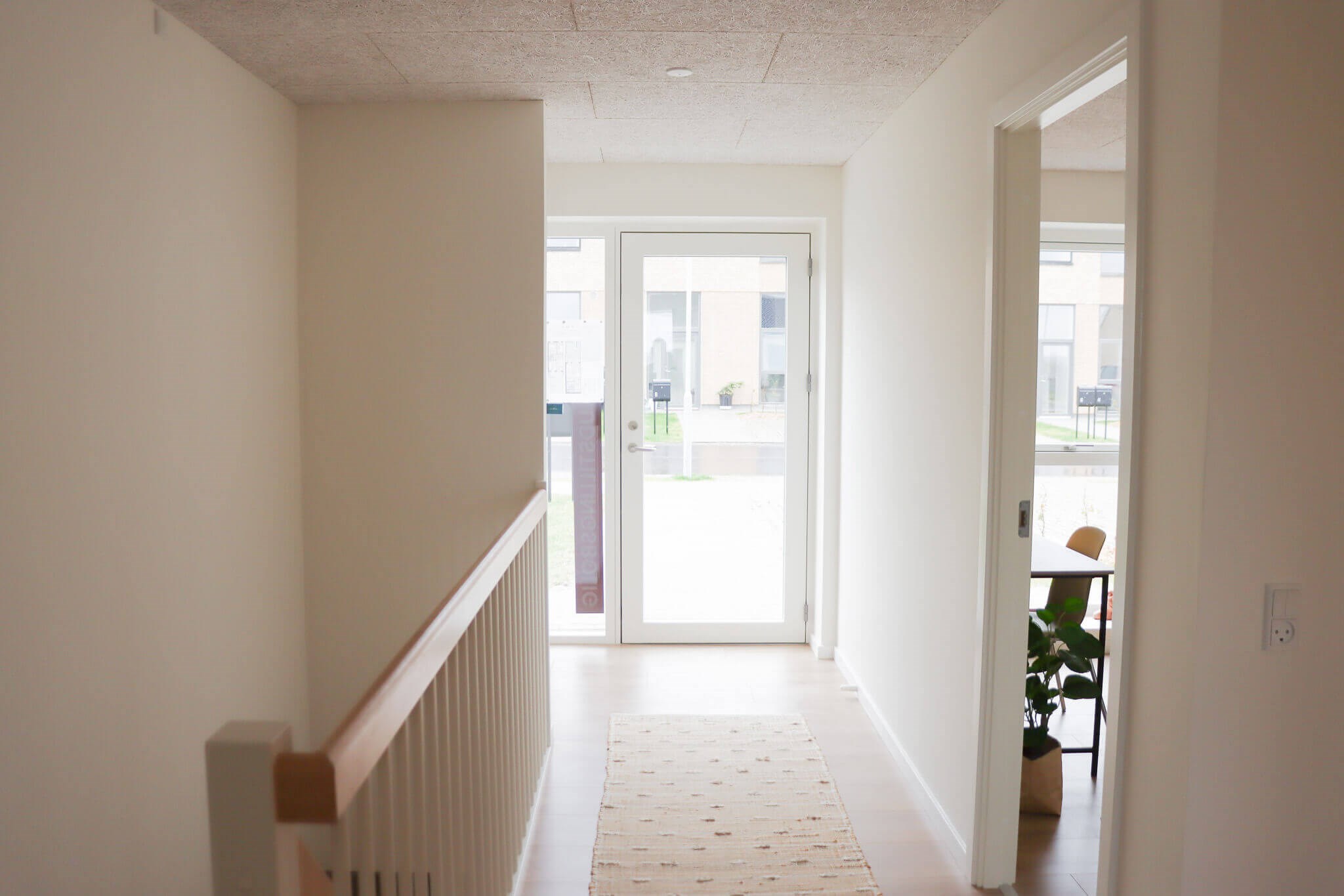 Boligens entré ligger på 1. sal. Når du træder ind i boligen, finder du højskabe placeret på venstre hånd. Disse er placeret langs trappen. På stueplan er der et skønt bryggers med bordplads og vaskemaskine samt tørretumbler.