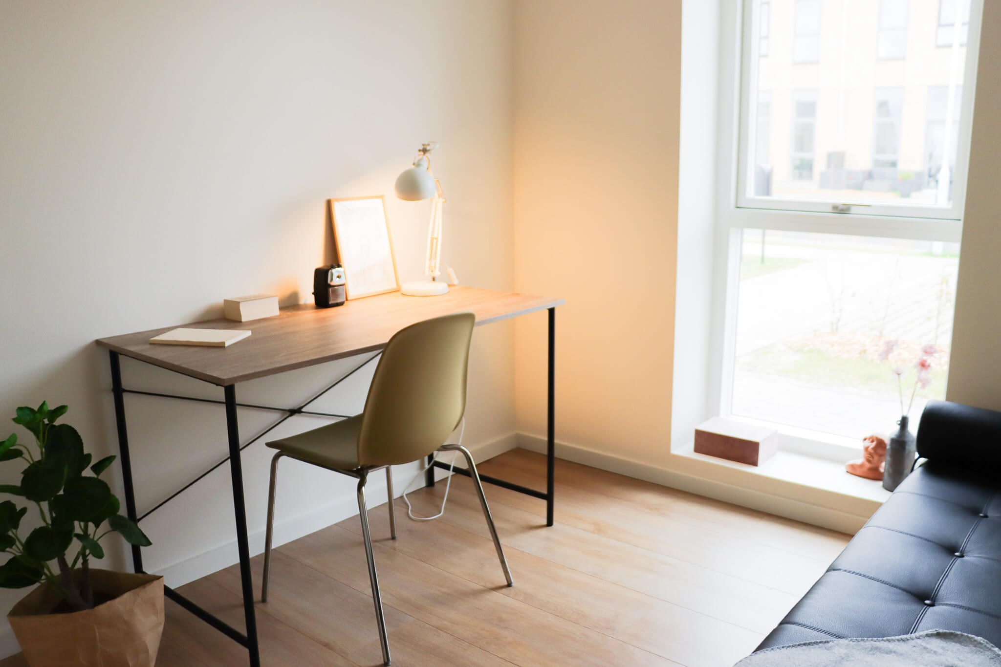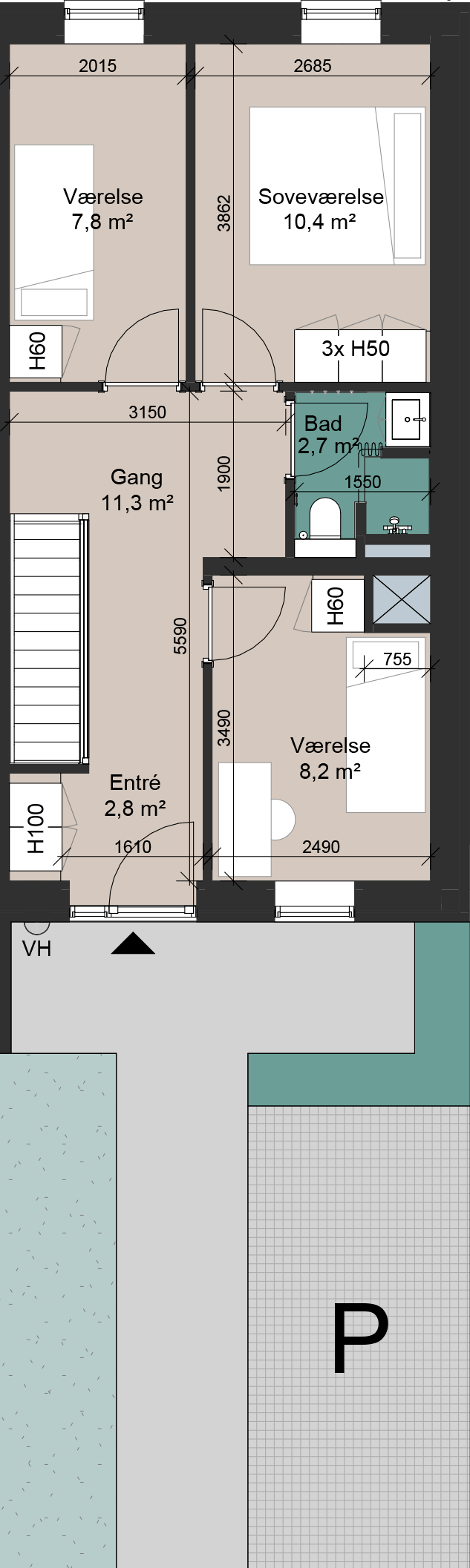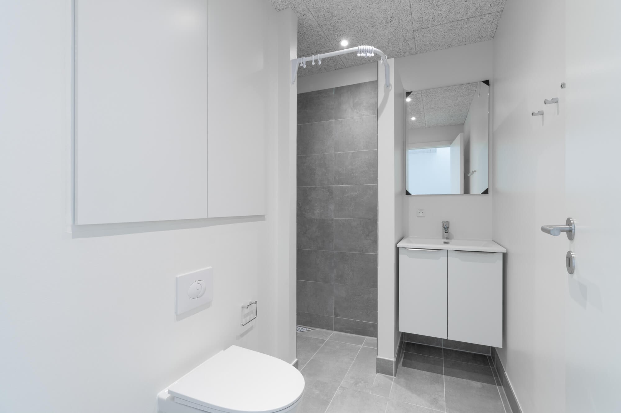På 1. sal er boligens tre værelser placeret, herunder et soveværelse og til ekstra værelser. Hvert værelse er udstyret med opbevaringsløsninger i form af fastmonterede højskabe.