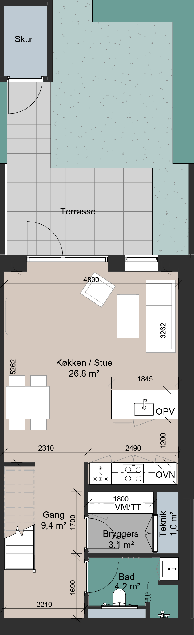 Fra boligens køkken-alrum er der udgang til en hyggelig terrasse og græsareal. På 1. sal er der ud fra boligens entré ligeledes et fint flisebelagt areal. Boligen har privat parkering og eget skur. Obs. alle billeder og plantegninger er vejledende.