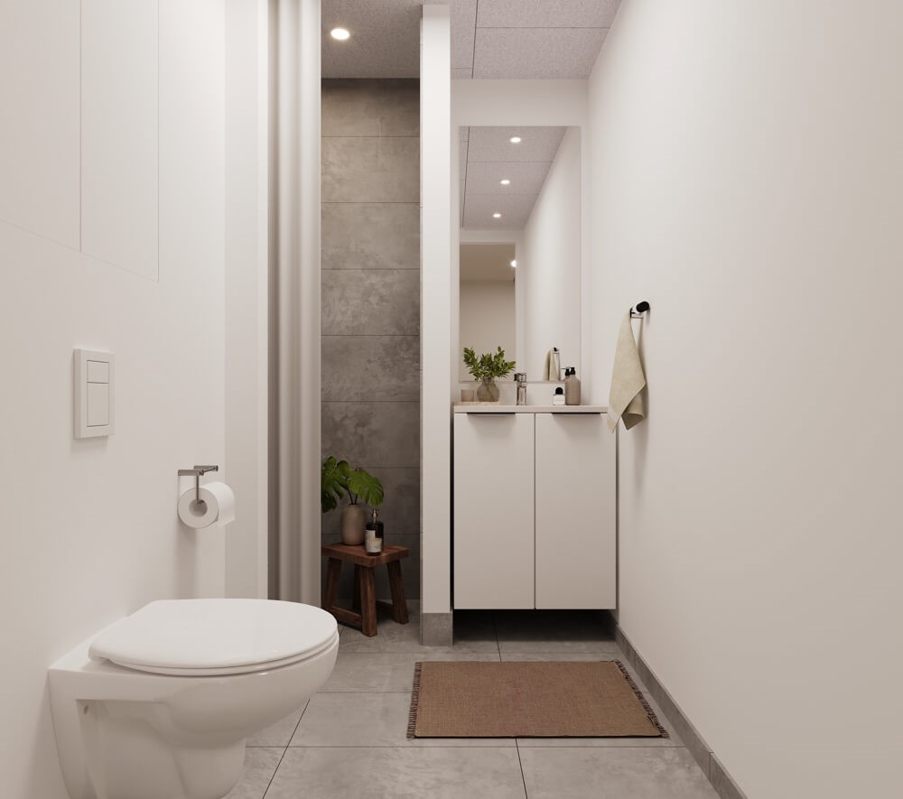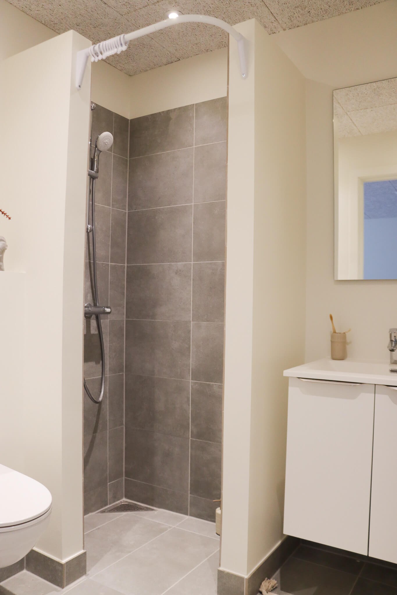 Denne fine bolig har til fuldt udstyrede badeværelser fordelt på de to etager. På stueetagen, i den ene ende, er det største badeværelse placeret i forlængelse af boligens bryggers. Centralt placeret på boligens 1. sal er det andet dårligt placeret, så der er let adgang fra de tre værelser. Hvert bad er udrustet med en moderne bruseniche, væghængt toilet og håndvask med opbevaring under.