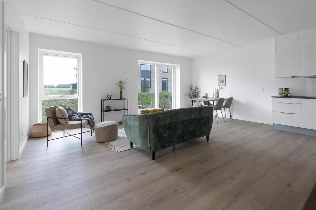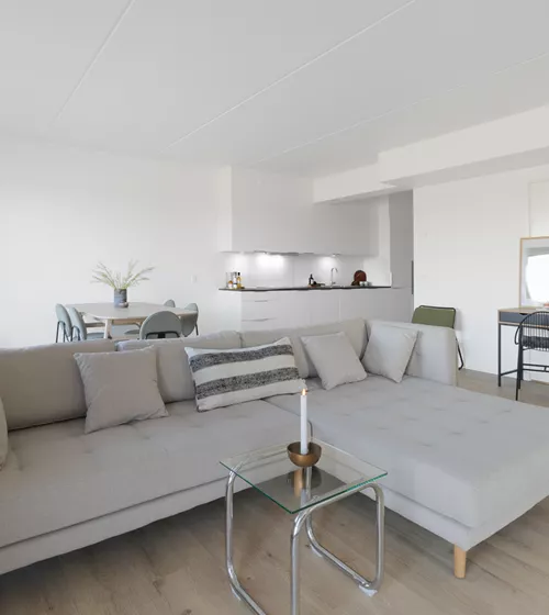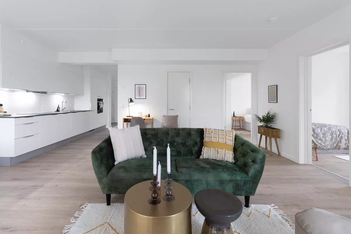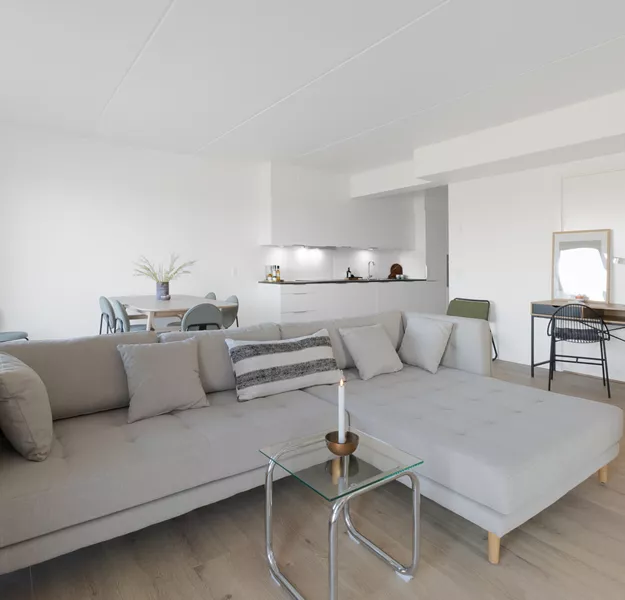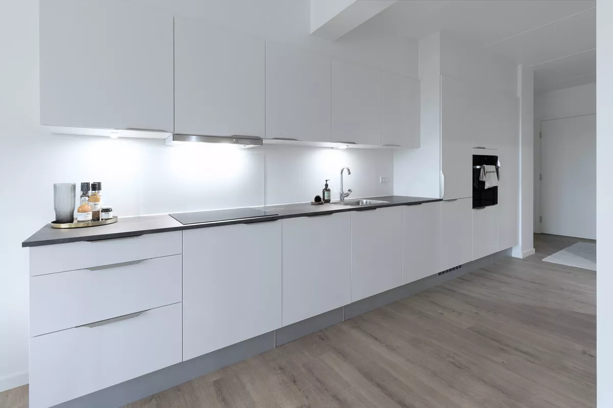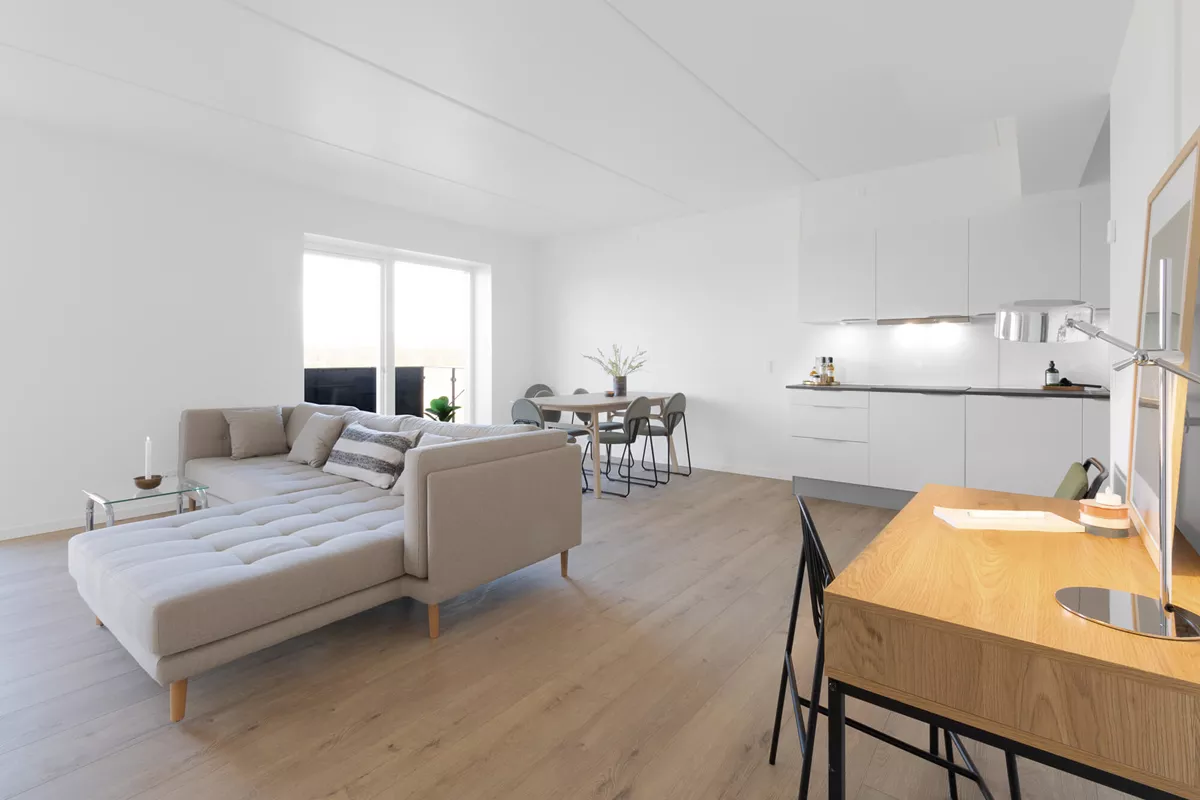 Lejlighedens hjerterum er det veludnyttede og lyse køkken-alrum, hvor det stilrene køkken er opført i hvide HTH-elementer og indeholder alt i hårde hvidevarer. I alrummet er der desuden god plads til både spisebord samt et stueområde med sofa.