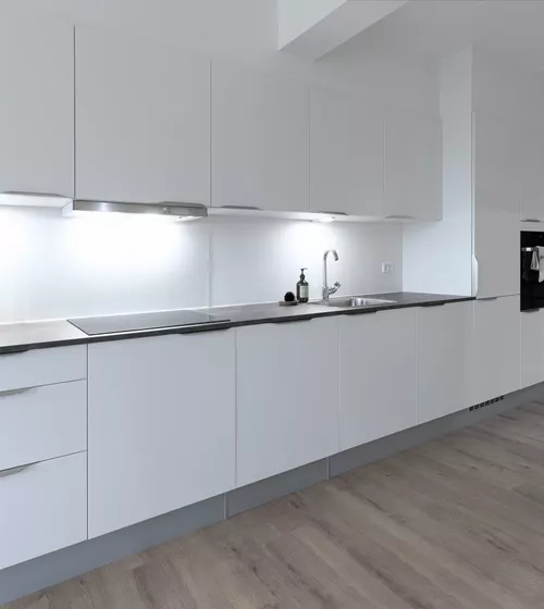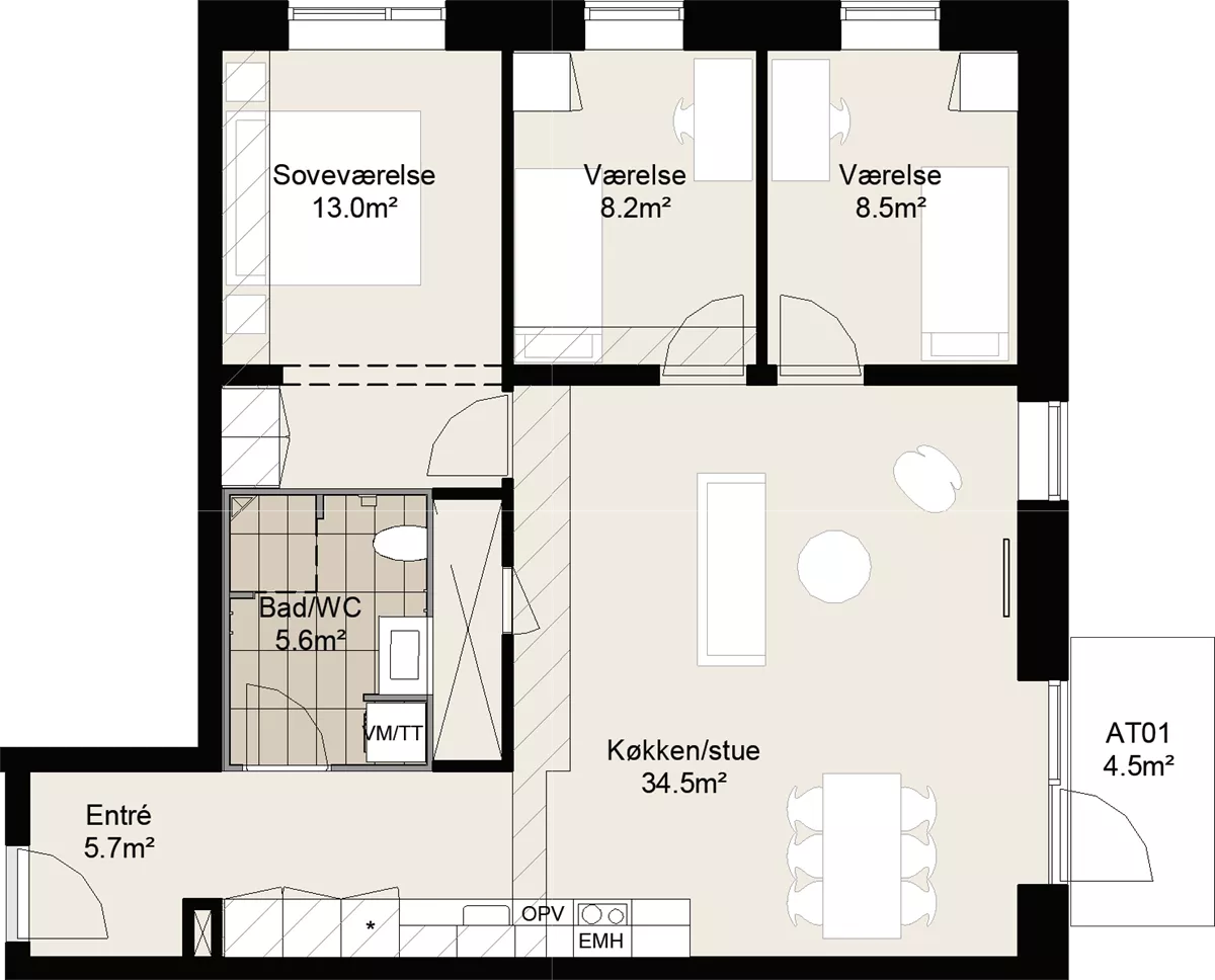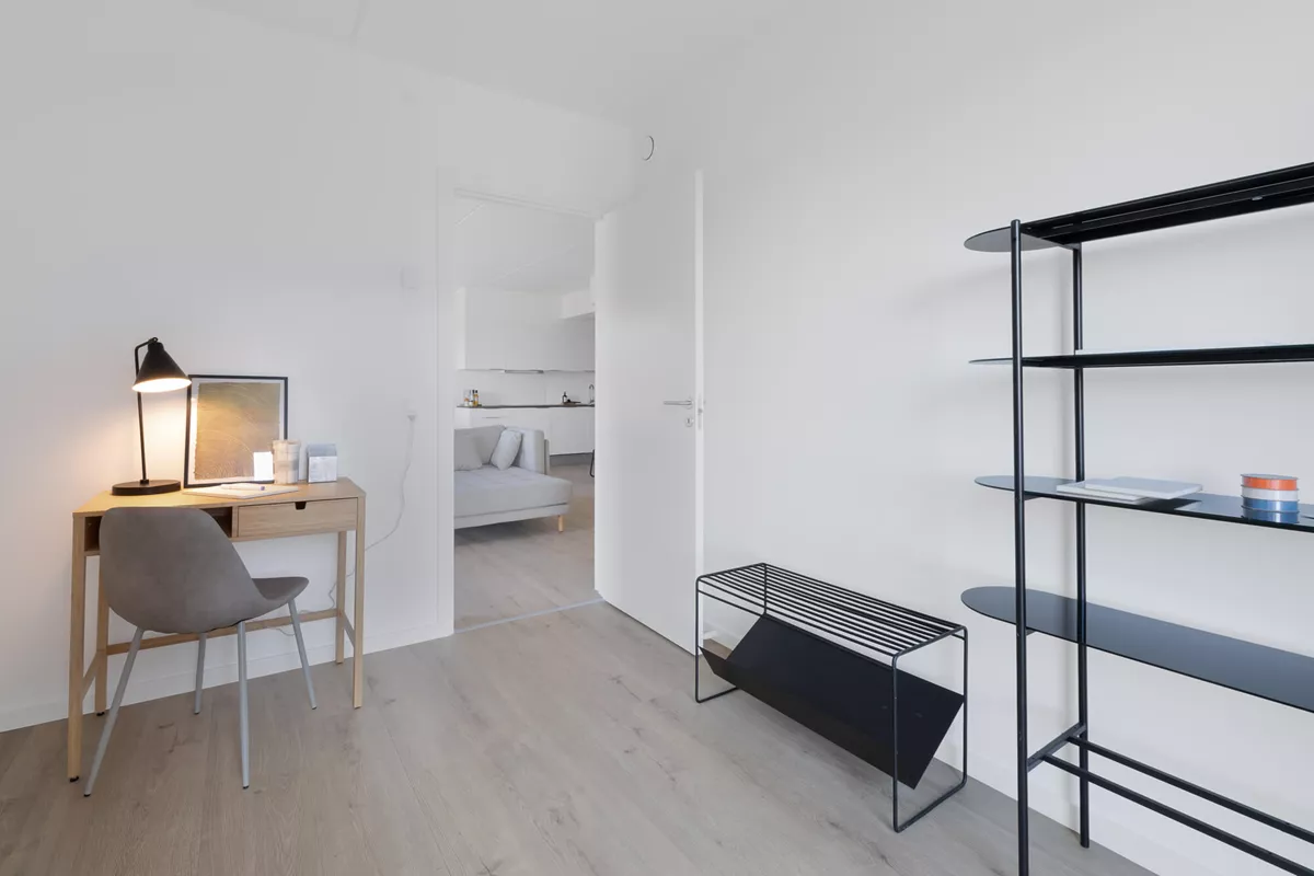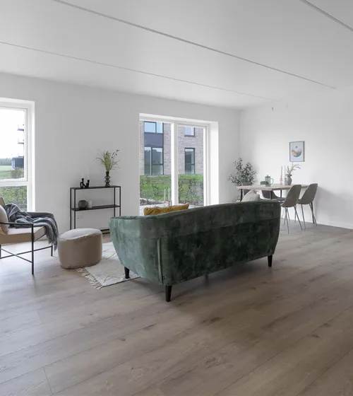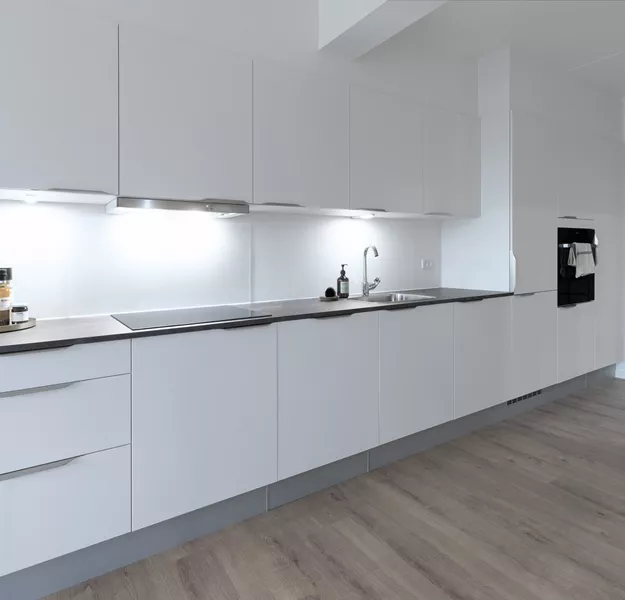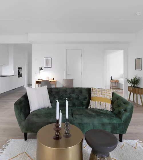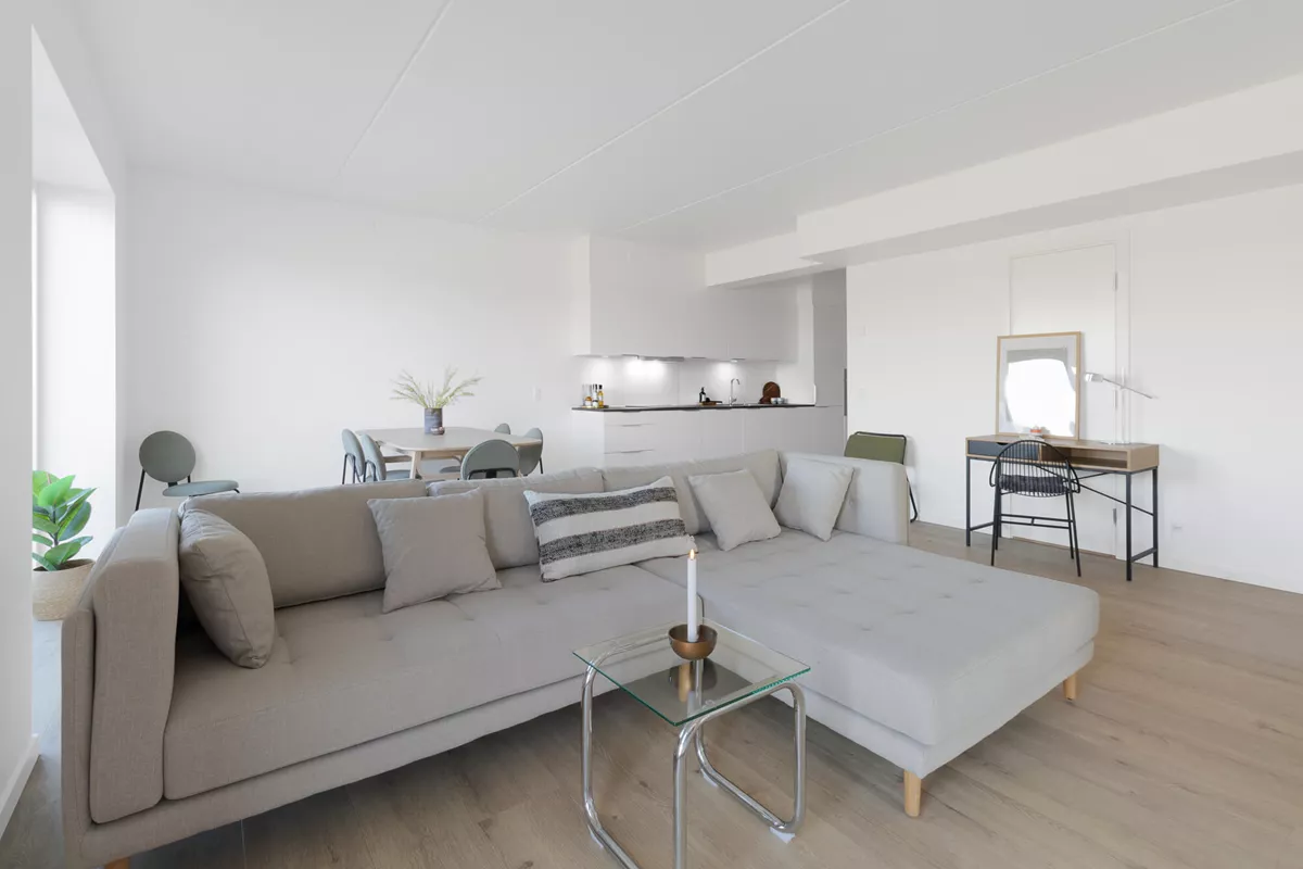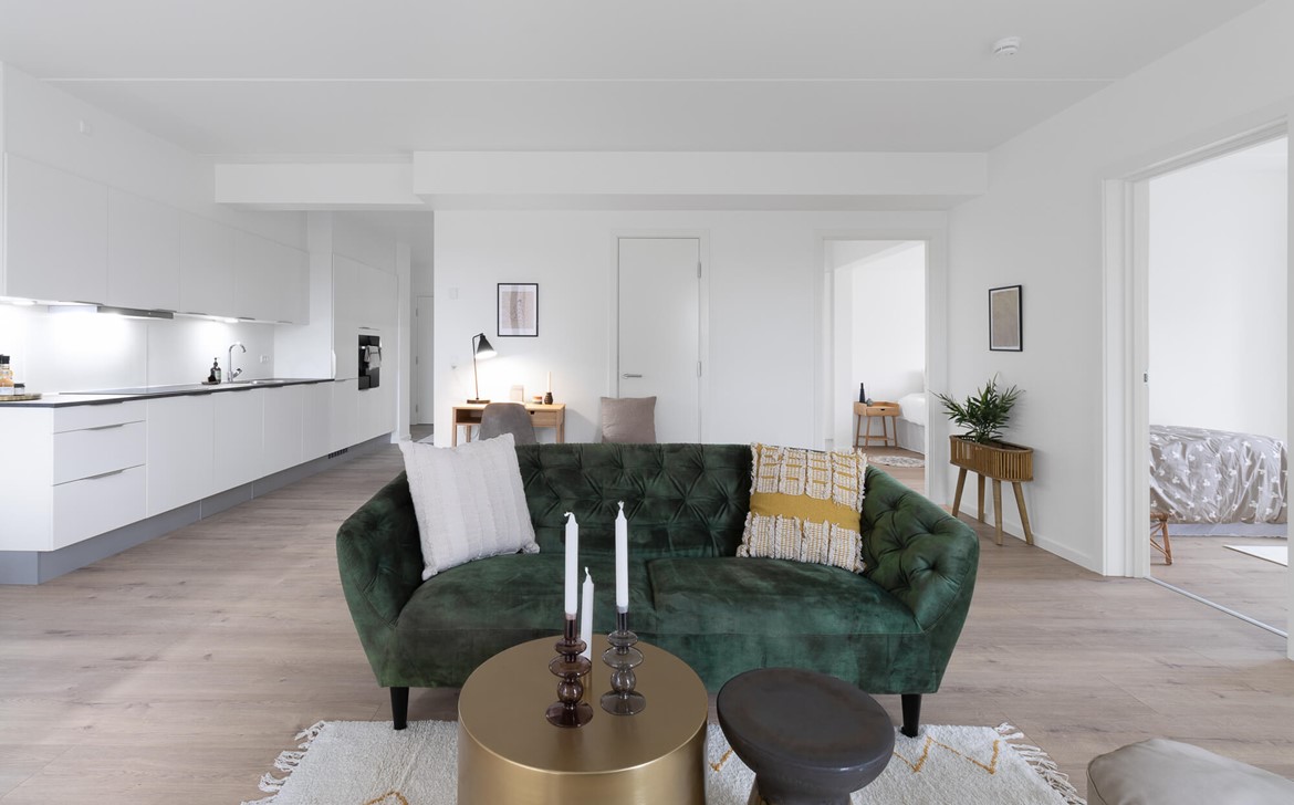 Lejlighedens hjerterum er det veludnyttede og lyse køkken-alrum, hvor det stilrene køkken er opført i hvide HTH-elementer og indeholder alt i hårde hvidevarer. I alrummet er der desuden god plads til både spisebord samt et stueområde med sofa.
