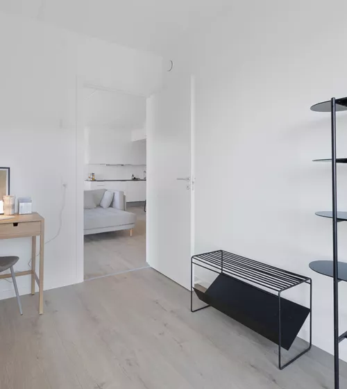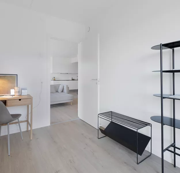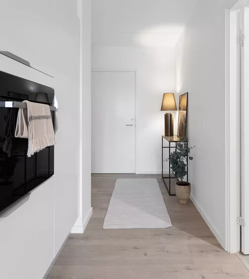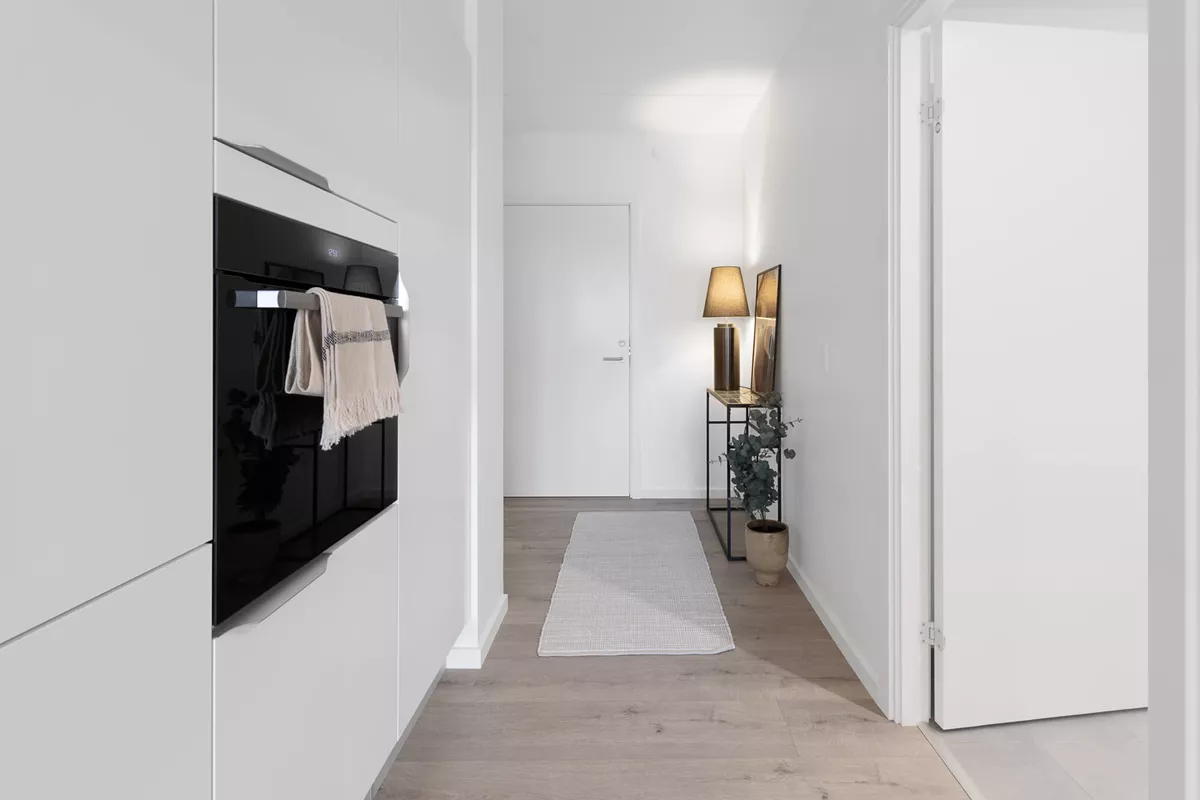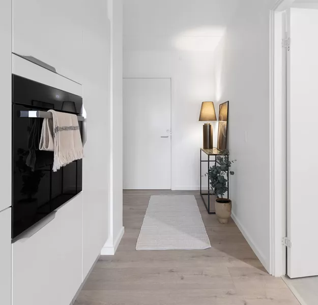 Lejligheden byder velkommen gennem en entré med et enkelt garderobeskab. Entréen har god plads til opbevaringsløsninger til både overtøj og fodtøj.