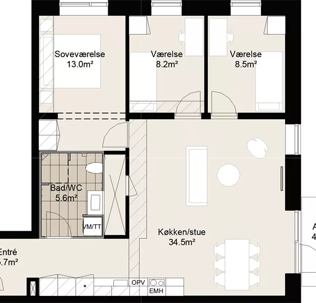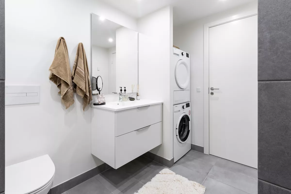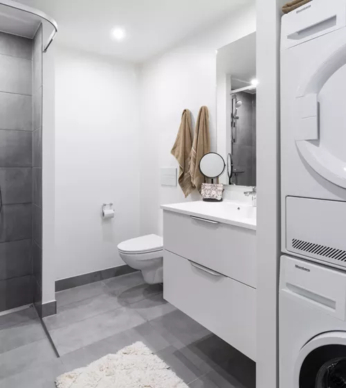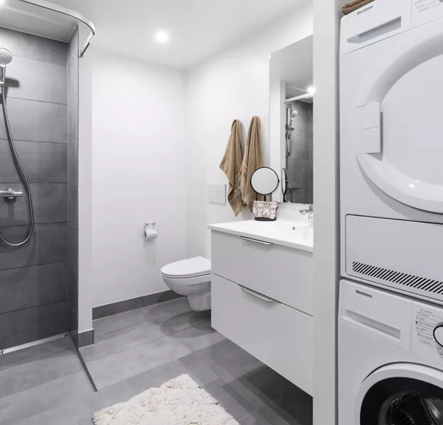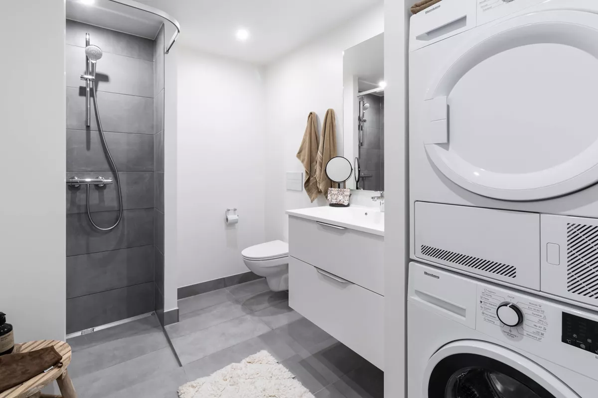 Fra lejlighedens entré er der adgang et stilrent badeværelse med bruseniche, toilet, håndvask samt opbevaring. Badeværelset indeholder desuden en vaskesøjle med vaskemaskine og tørretumbler.