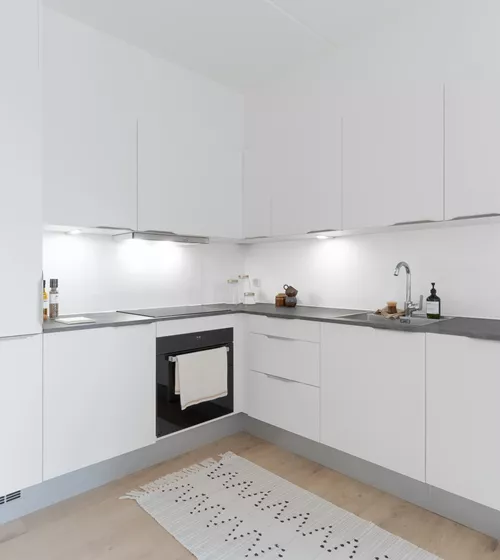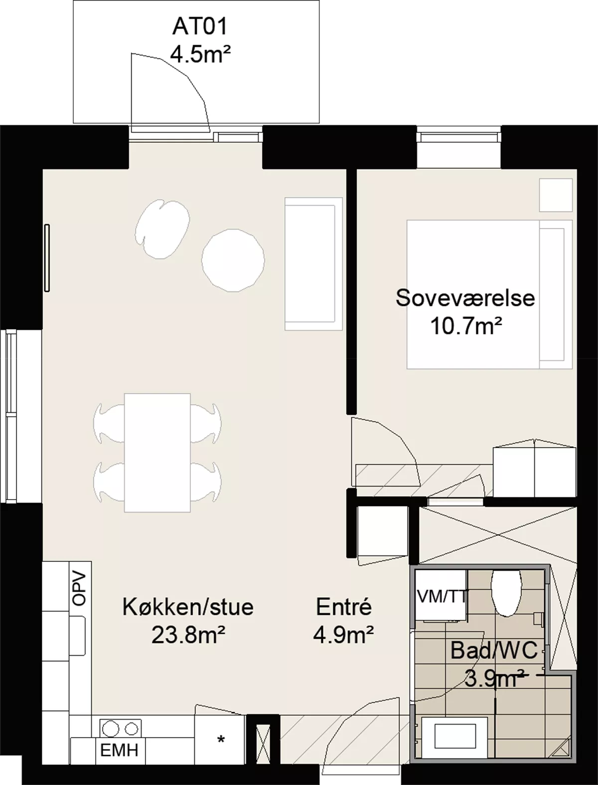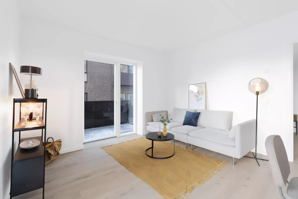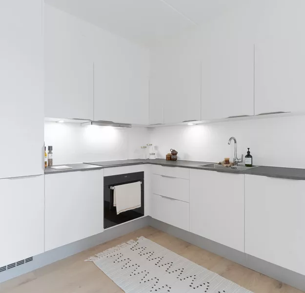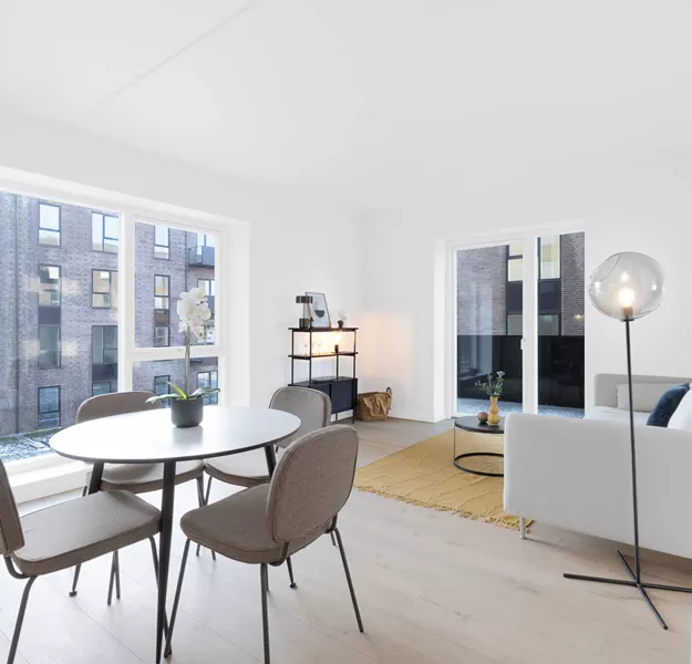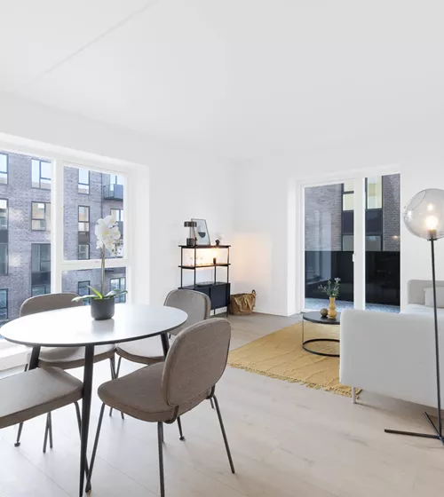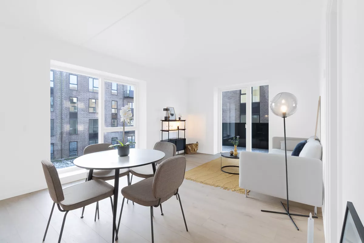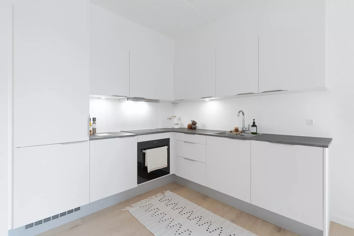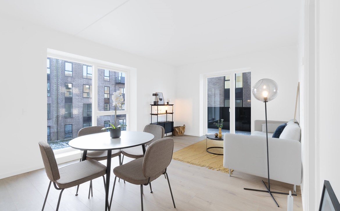 Lejligheden er opført med et lyst og rummeligt køkken-alrum, hvor det stilrene køkkenet indeholder alt i hårde hvidevarer.