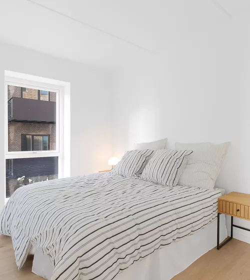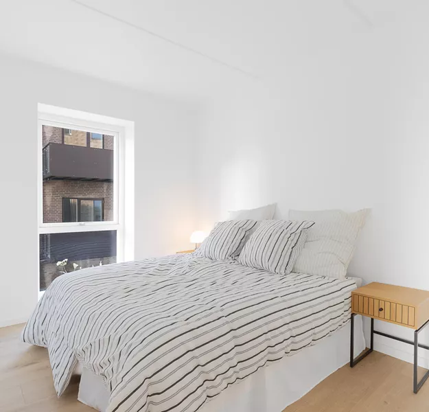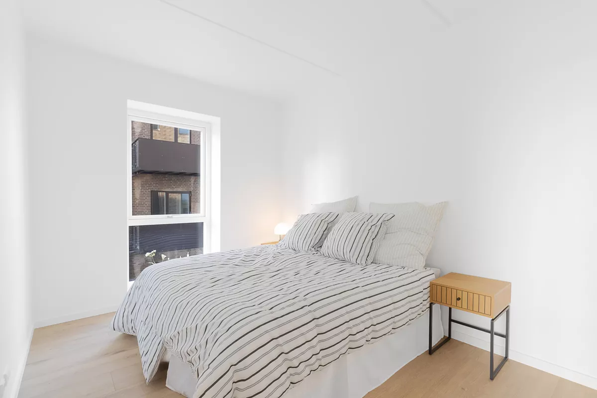 Lejlighedens soveværelse er lyst og rummeligt og indeholder to faste garderobeskabe samt plads til en dobbeltseng.