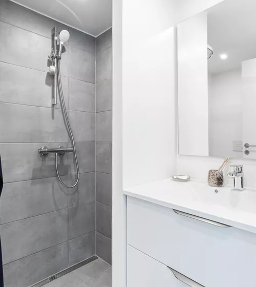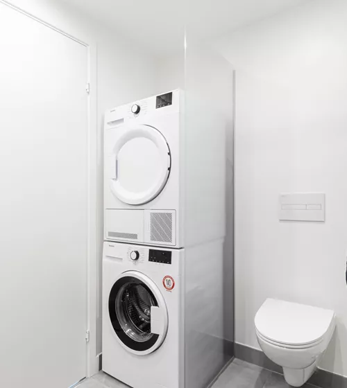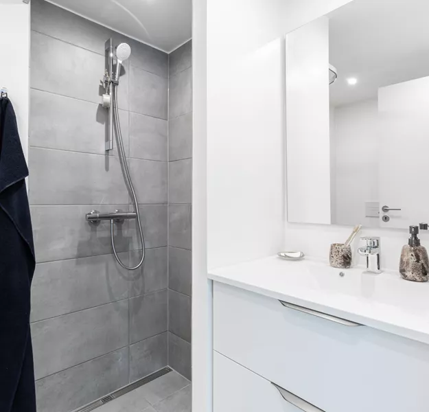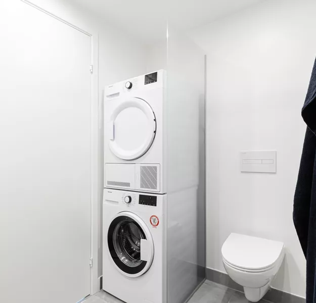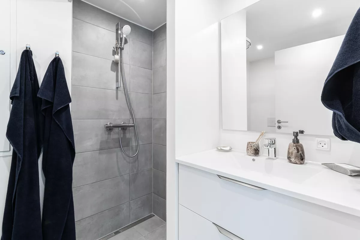 Det stilrene badeværelse indeholder bruseniche, toilet, håndvask samt skabsplads.Badeværelset indeholder desuden vaskesøjle med vaskemaskine og tørretumbler.