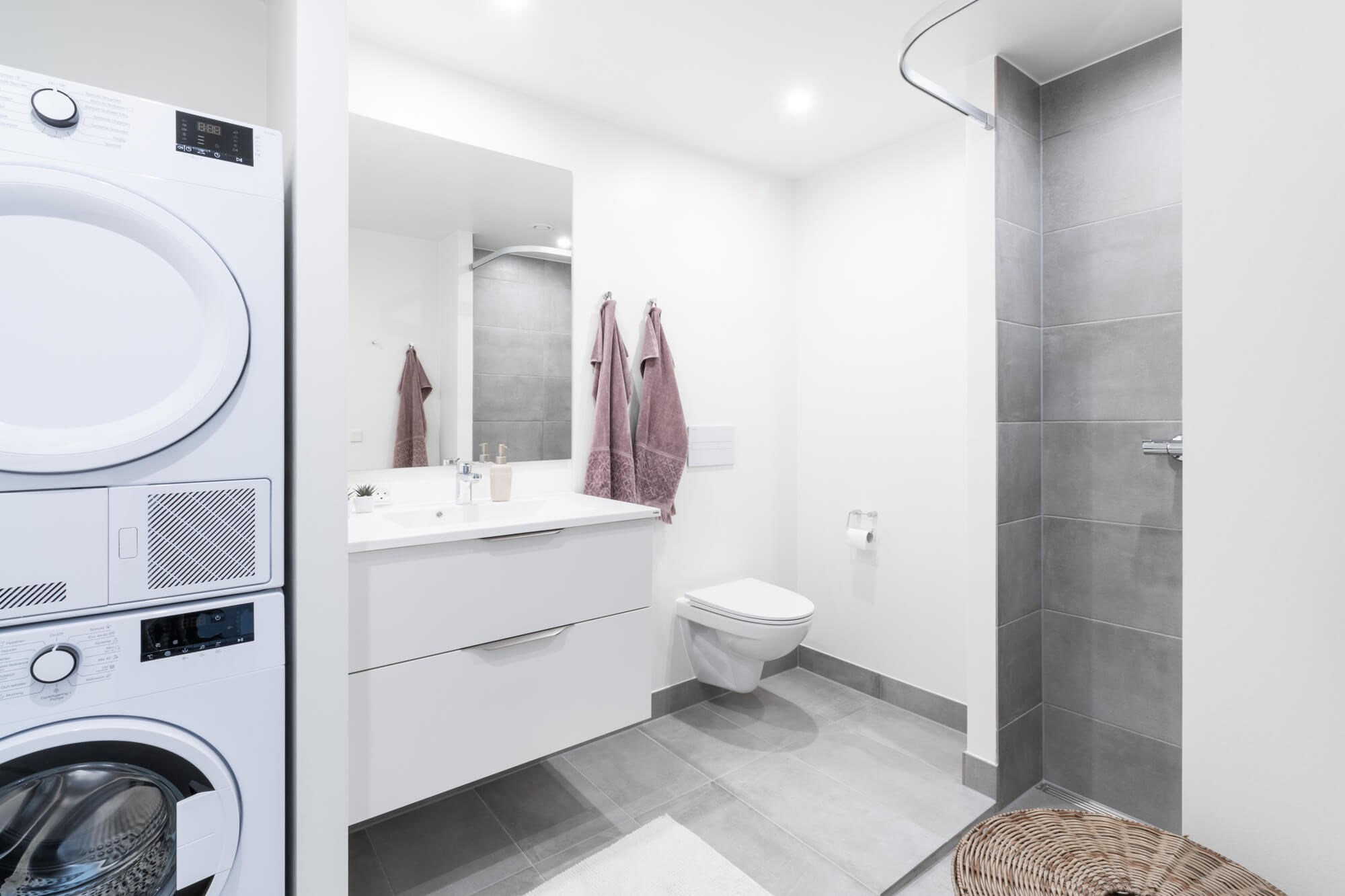 Fra lejlighedens entré er der adgang til et moderne badeværelse med bruseniche, toilet, håndvask samt opbevaring. Badeværelset indeholder desuden en vaskesøjle med vaskemaskine og tørretumbler.