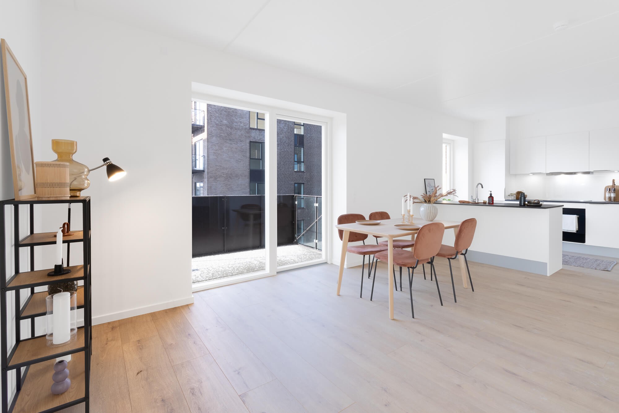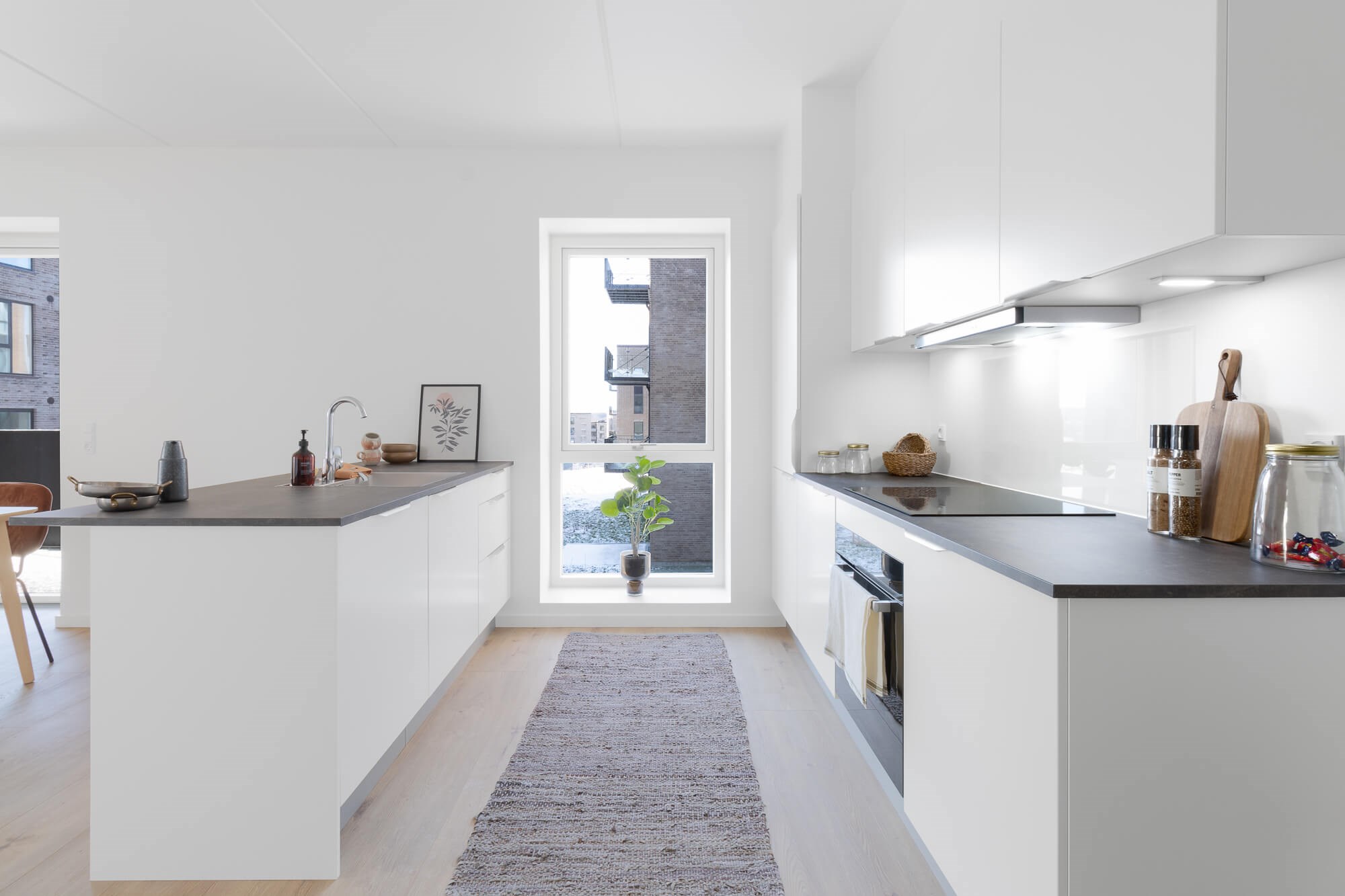 Lejligheden er opført med et stort og lyst køkken-alrum, hvor det stilrene køkken er opført i hvide HTH-elementer og indeholder alt i hårde hvidevarer. I alrummet er der desuden god plads til både spisebord samt et stueområde med sofa.