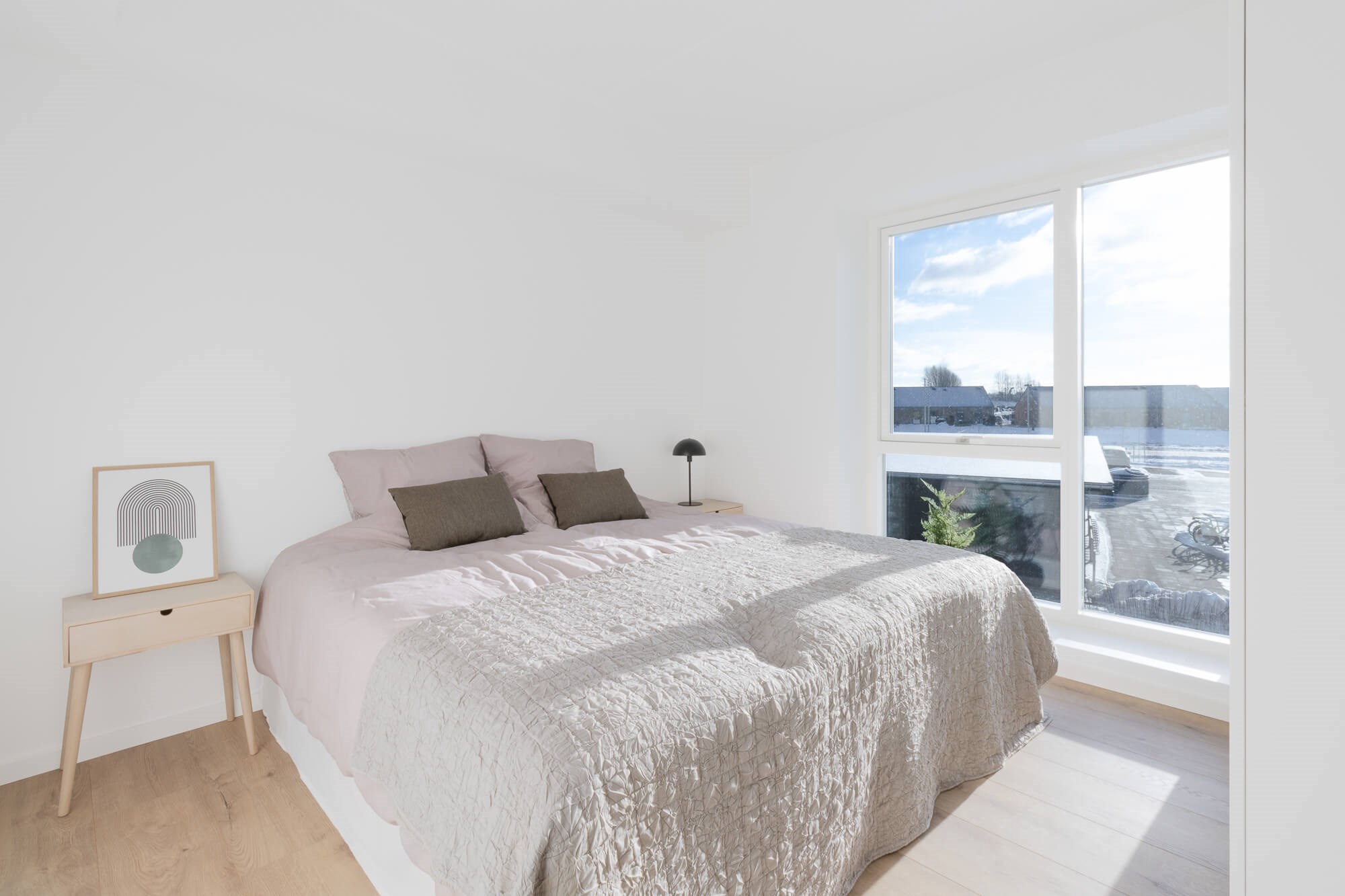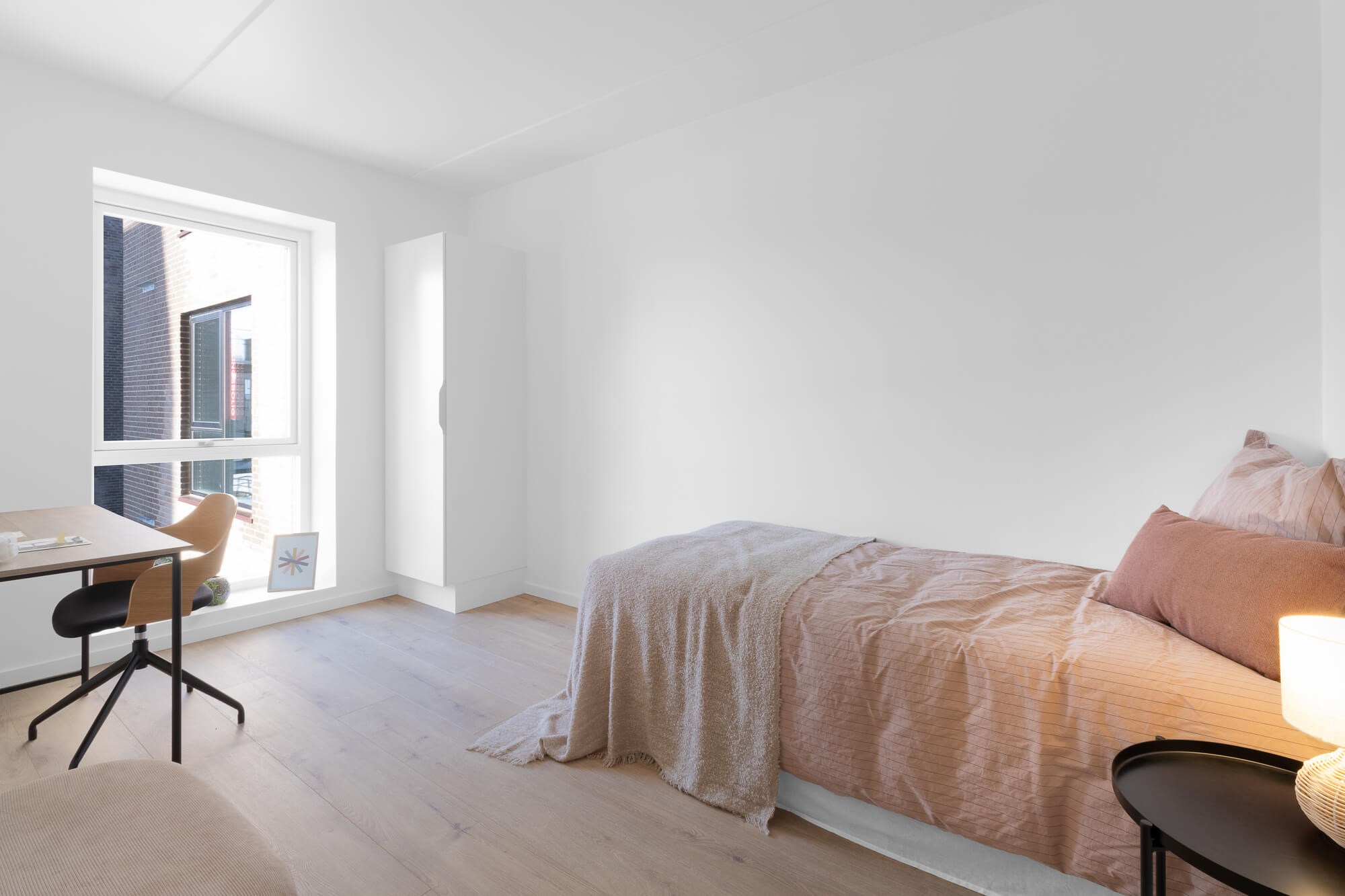 Fra alrummet er der adgang til boligens soveværelse, der er indrettet med tre faste skabe samt plads til dobbeltseng. Dertil har lejligheden to gode værelser hver med et fast skab. Begge værelser har god plads til både skrivebord, seng m.m.