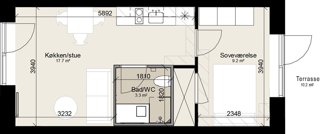 Fra stuen er der direkte adgang til en egen terrasse/altan, hvor du kan nyde frisk luft og udendørs øjeblikke.