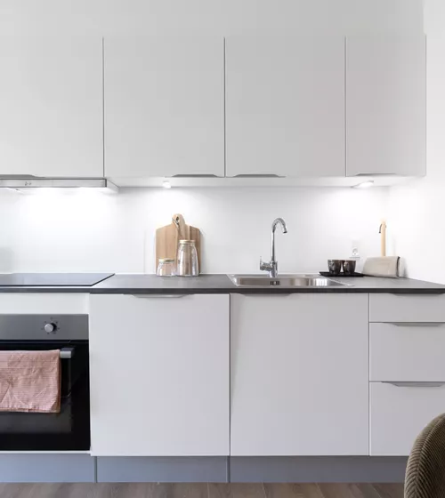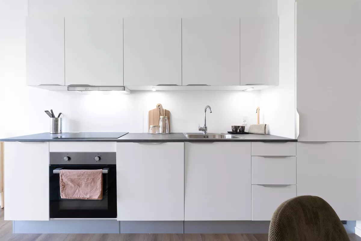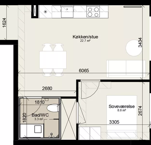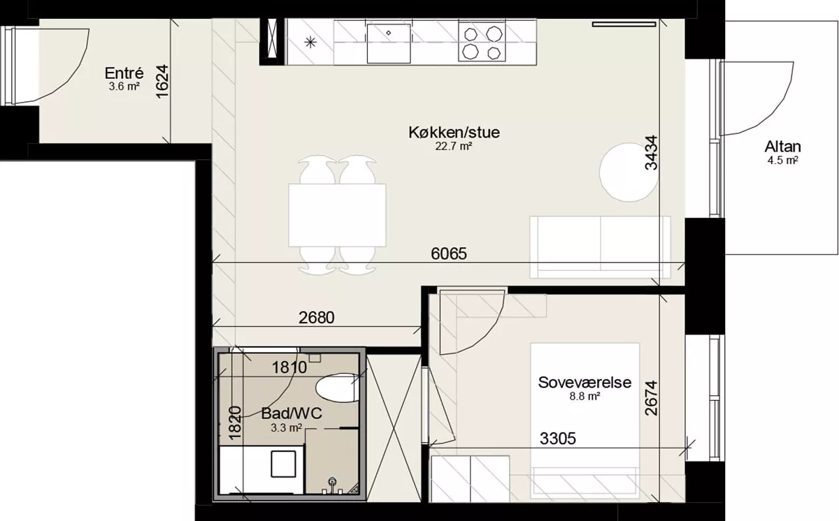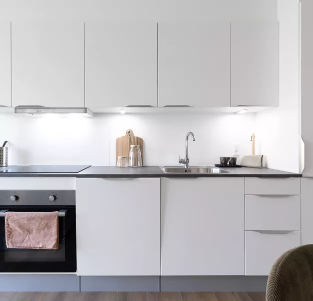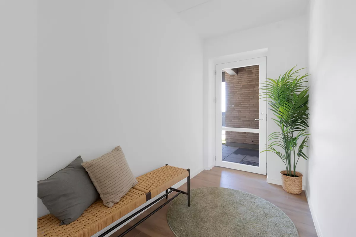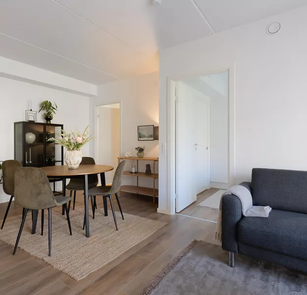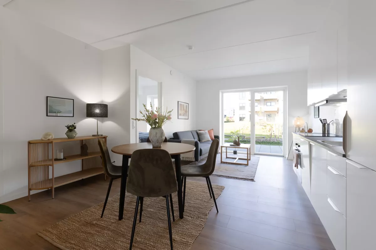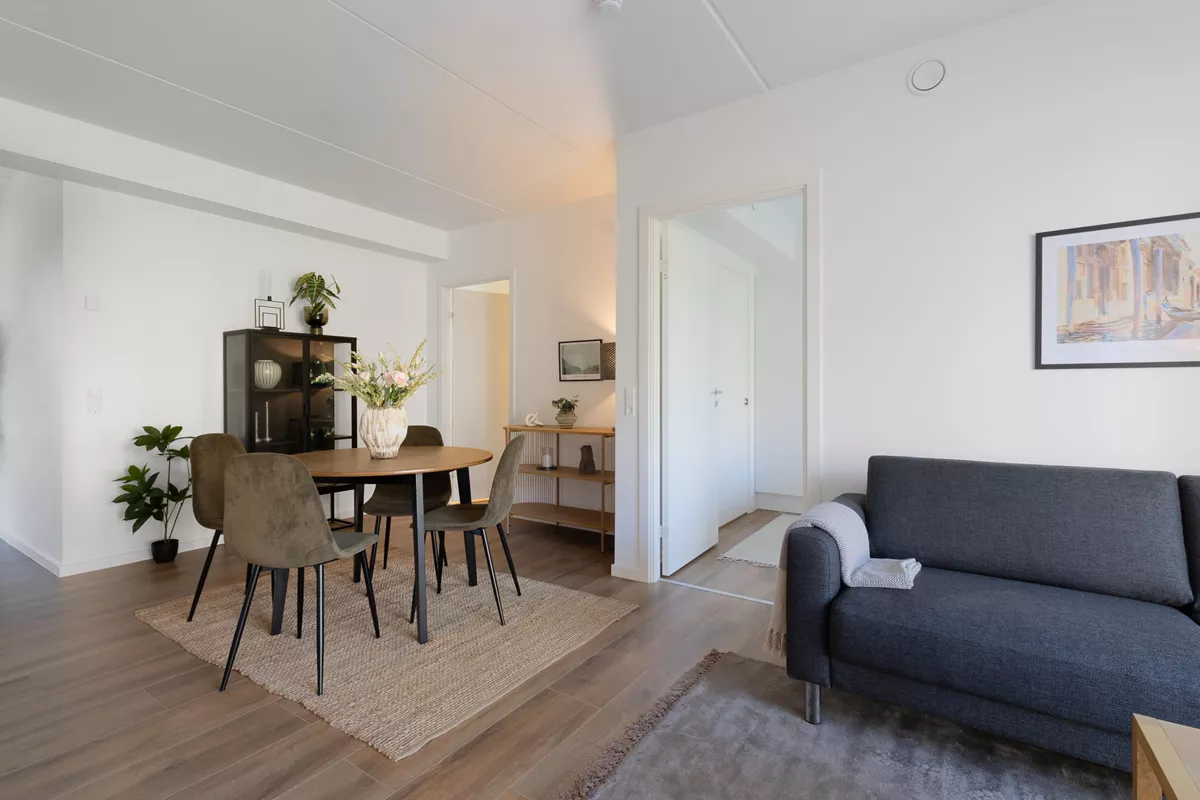 Denne toværelses lejlighed udstråler en smart indretning med åben planløsning, der forener køkken og stue. Det moderne køkken er opført i stilfulde materialer, inkluderer alle de nødvendige hårde hvidevarer og indbyder til hyggelige madaftener.