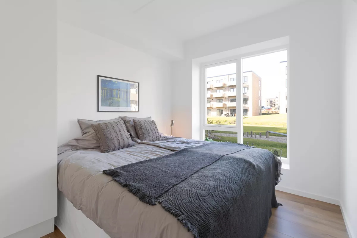Lejlighedens rummelige soveværelse er godt placeret for optimal privatliv og komfort. Det er rummeligt nok til at rumme en dobbeltseng og byder på praktisk opbevaringsplads takket være to fastmonterede garderobeskabe.