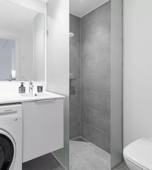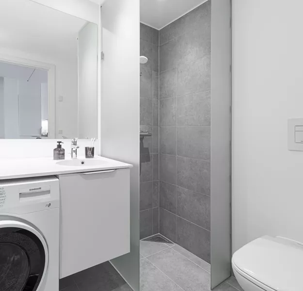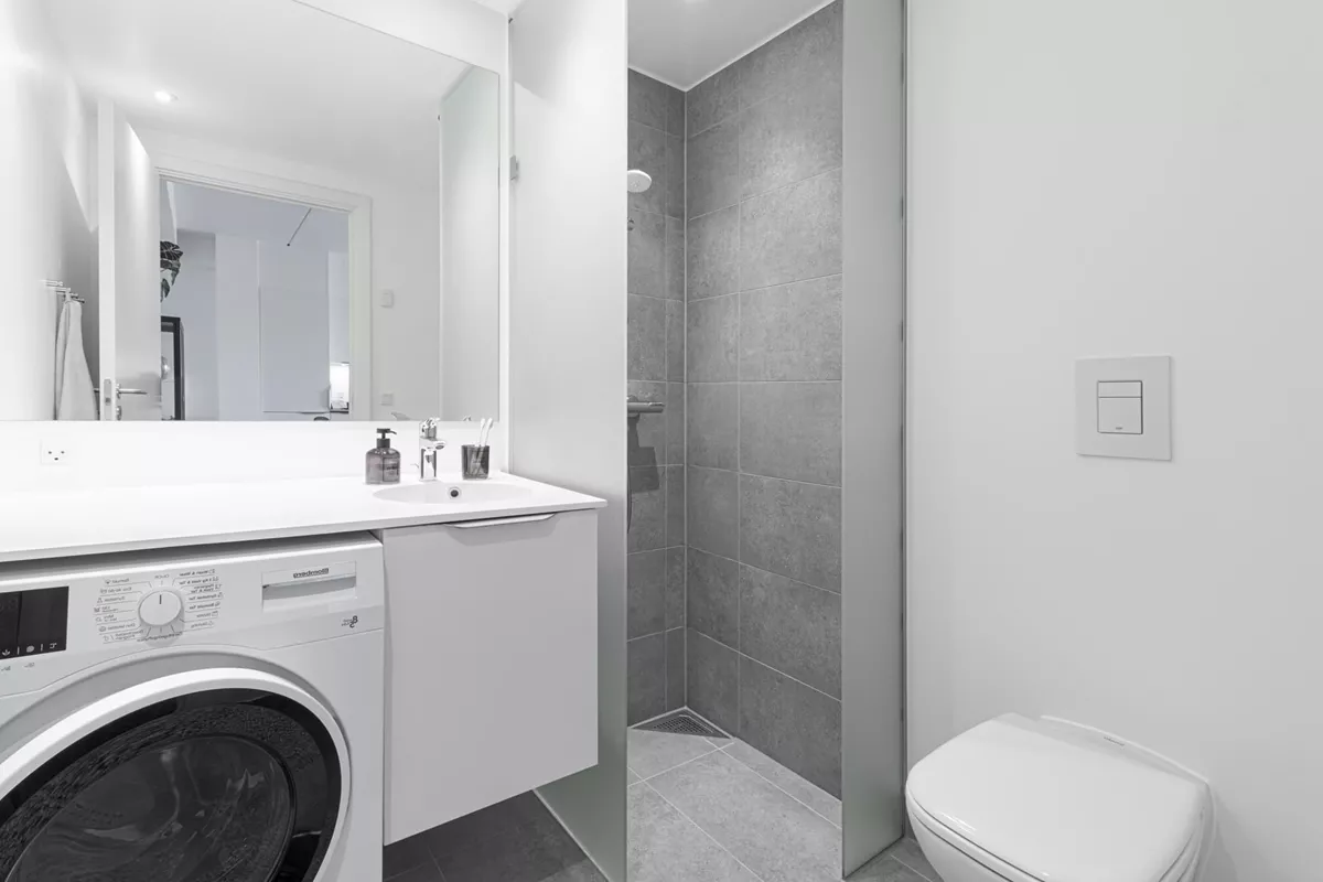 Badeværelset i denne lejlighed byder på enkel elegance med dets stilrene design. Det inkluderer en bruseniche, toilet, håndvask samt kombi vaskemaskine/tørretumbler.