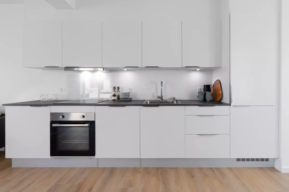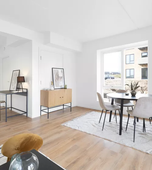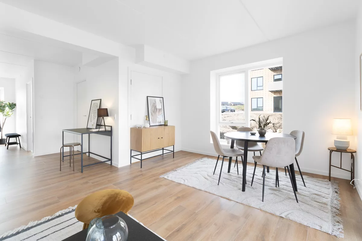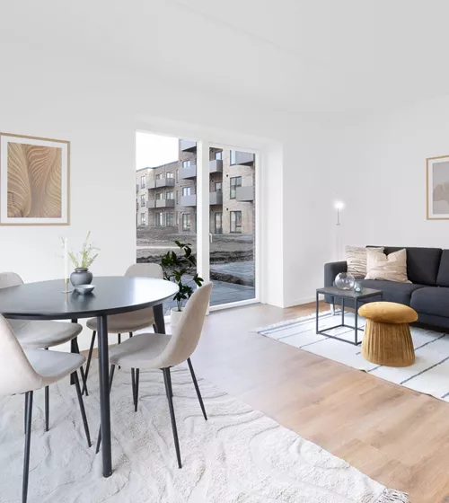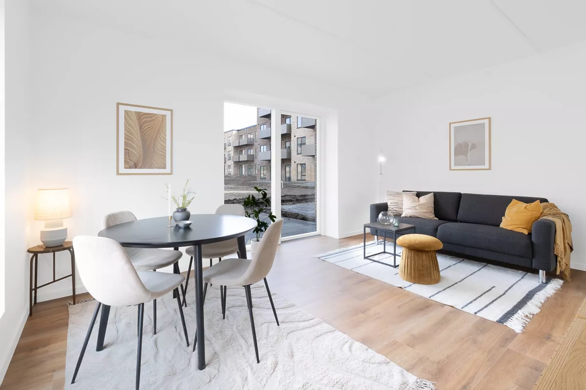 Træd ind i denne lyse og indbydende toværelses lejlighed, hvor et moderne køkken smelter sammen med stuen i en åben og harmonisk forbindelse. Køkkenet er udført med stilrene elementer og inkluderer alt i moderne hårde hvidevarer. Stuen er rummelig og lader dig skabe et behageligt sofaområde.