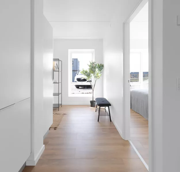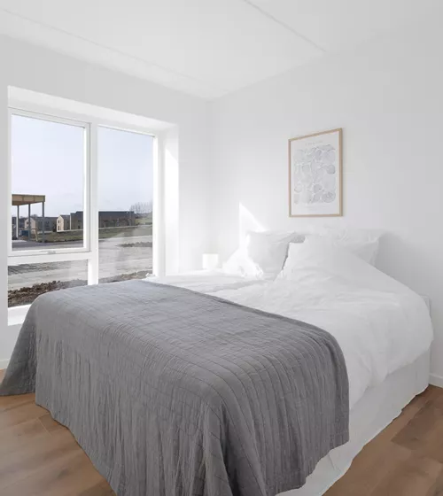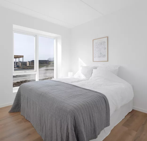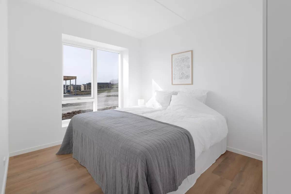 Lejlighedens soveværelse er rummeligt og byder på tre faste garderobeskabe samt rig plads til en komfortabel dobbeltseng.