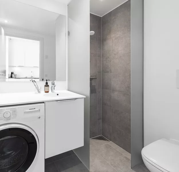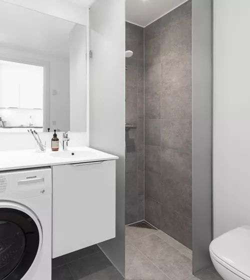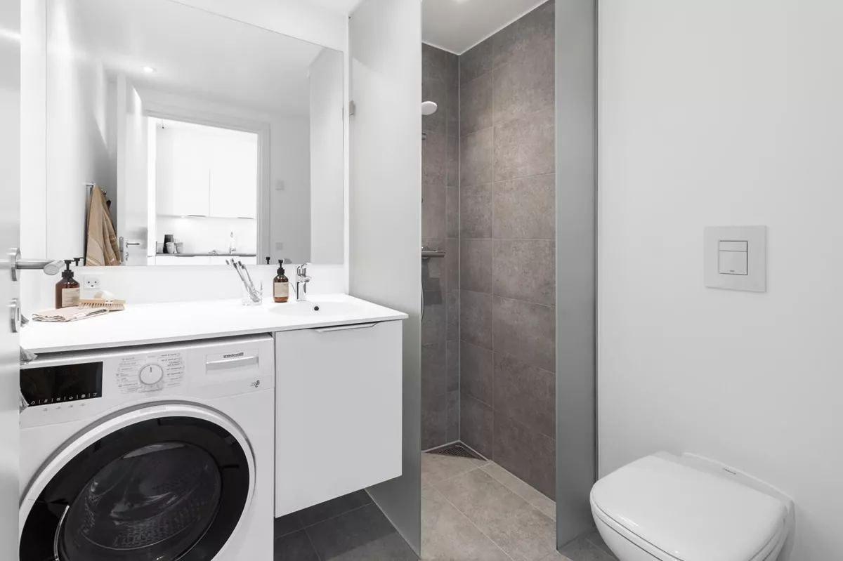 Det stilrene badeværelse præsenterer en moderne atmosfære med bruseniche, toilet samt håndvask med praktiske opbevaring. Badeværelset inkluderer også en vaskesøjle med vaskemaskine og tørretumbler.