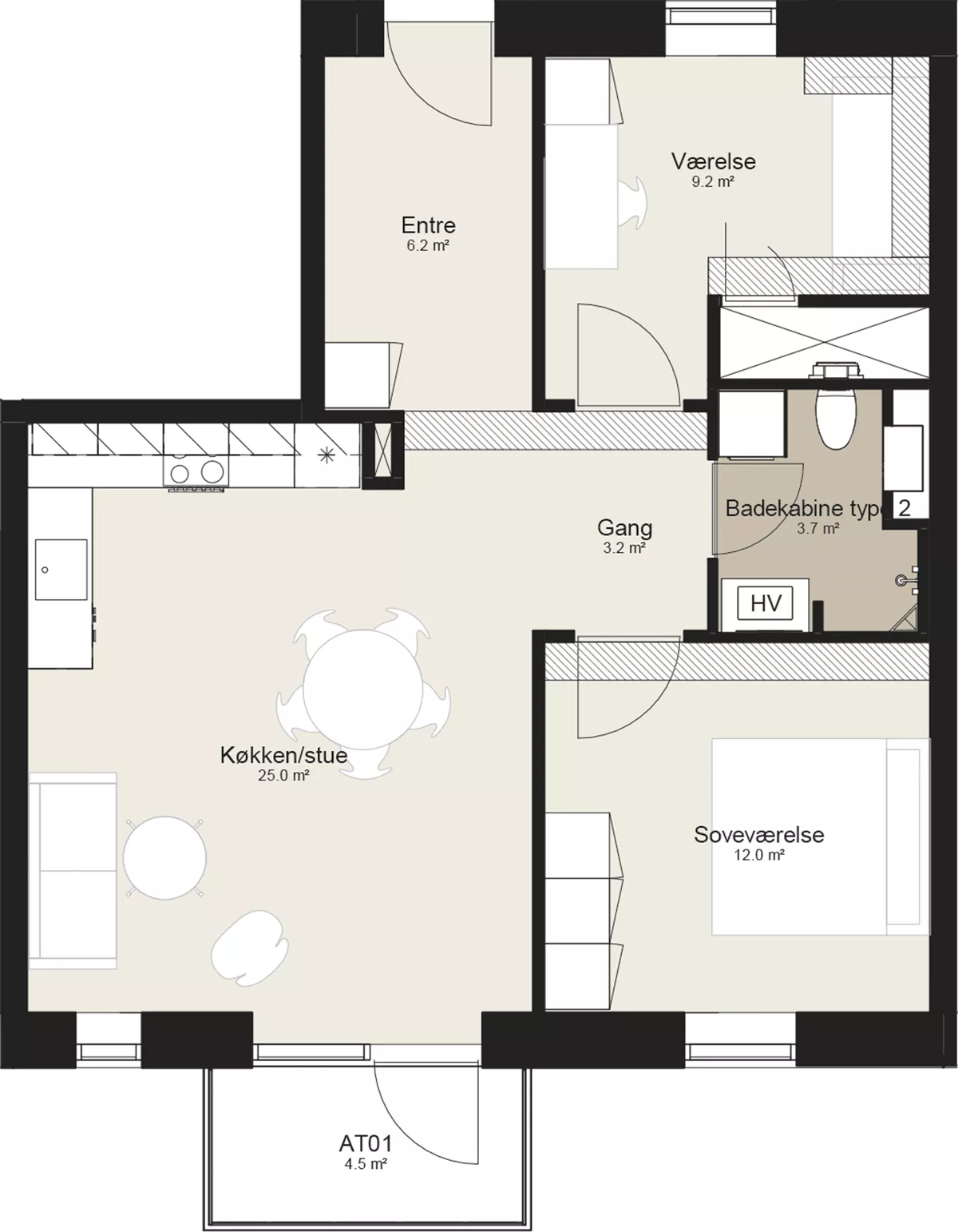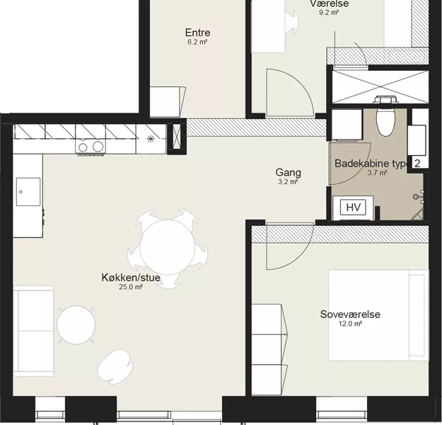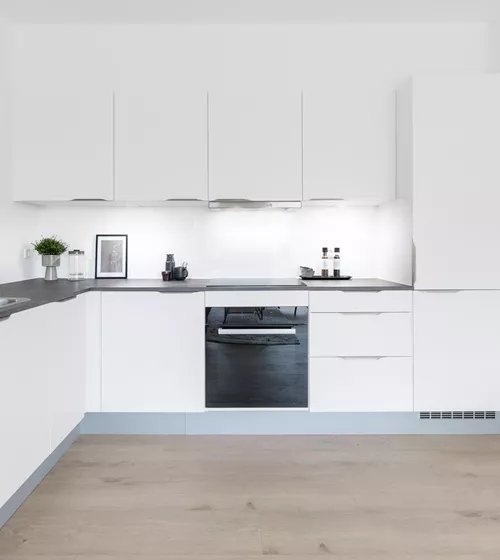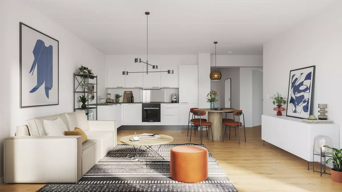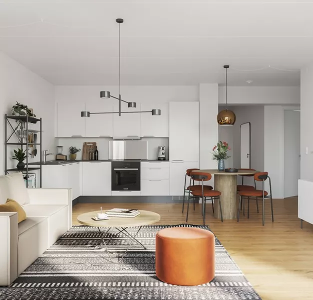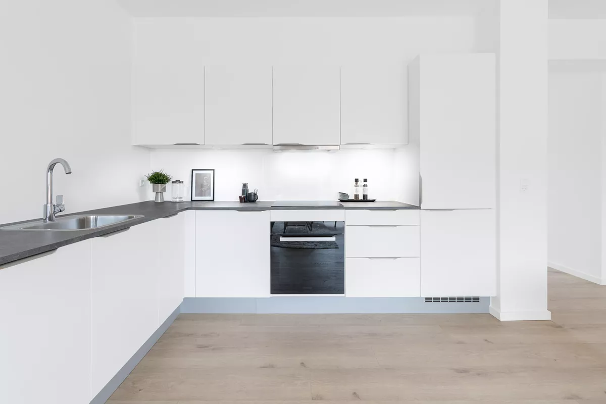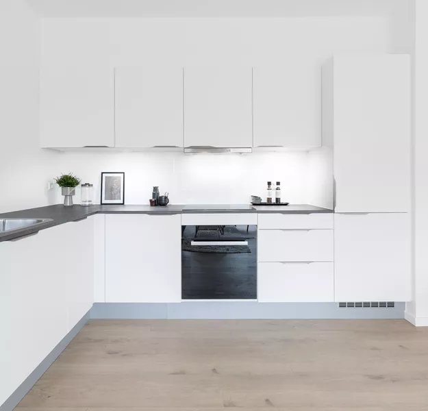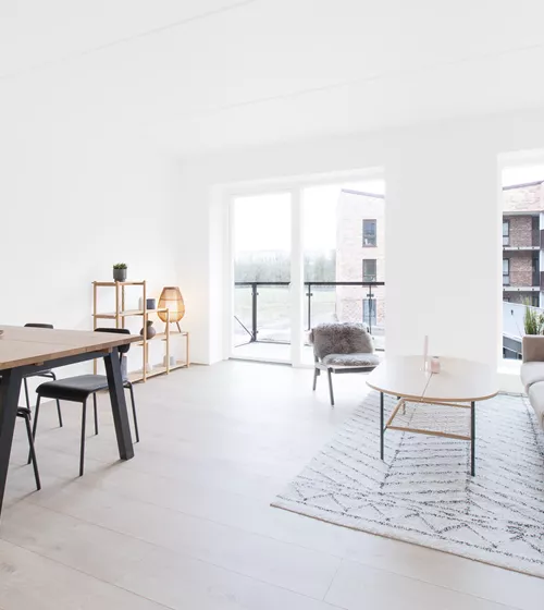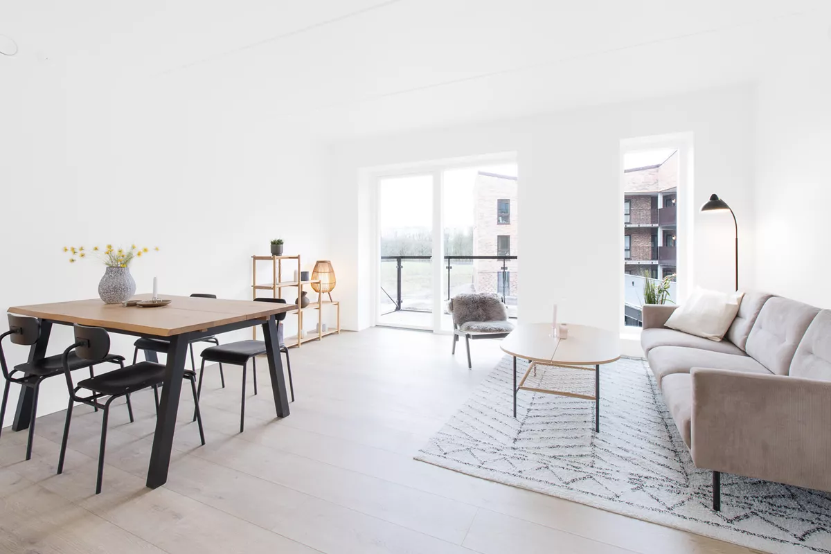 Rummelig og lækker treværelses lejlighed med et stort og indbydende leverum, der forener både køkken, spiseplads og stue. Køkkenet er placeret i en vinkel, der åbner op mod resten af rummet.