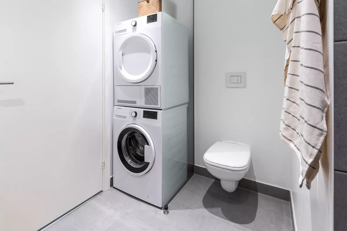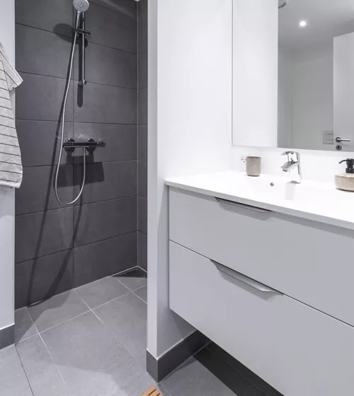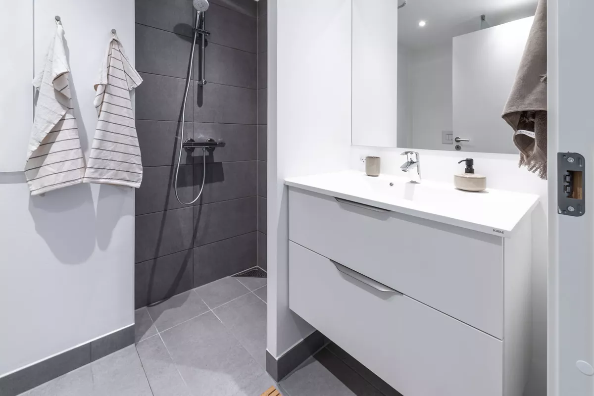 Lejlighedens badeværelse tilgås via alrummet, og det stilrene rum er opført med bruseniche, toilet, håndvask og opbevaring.