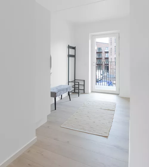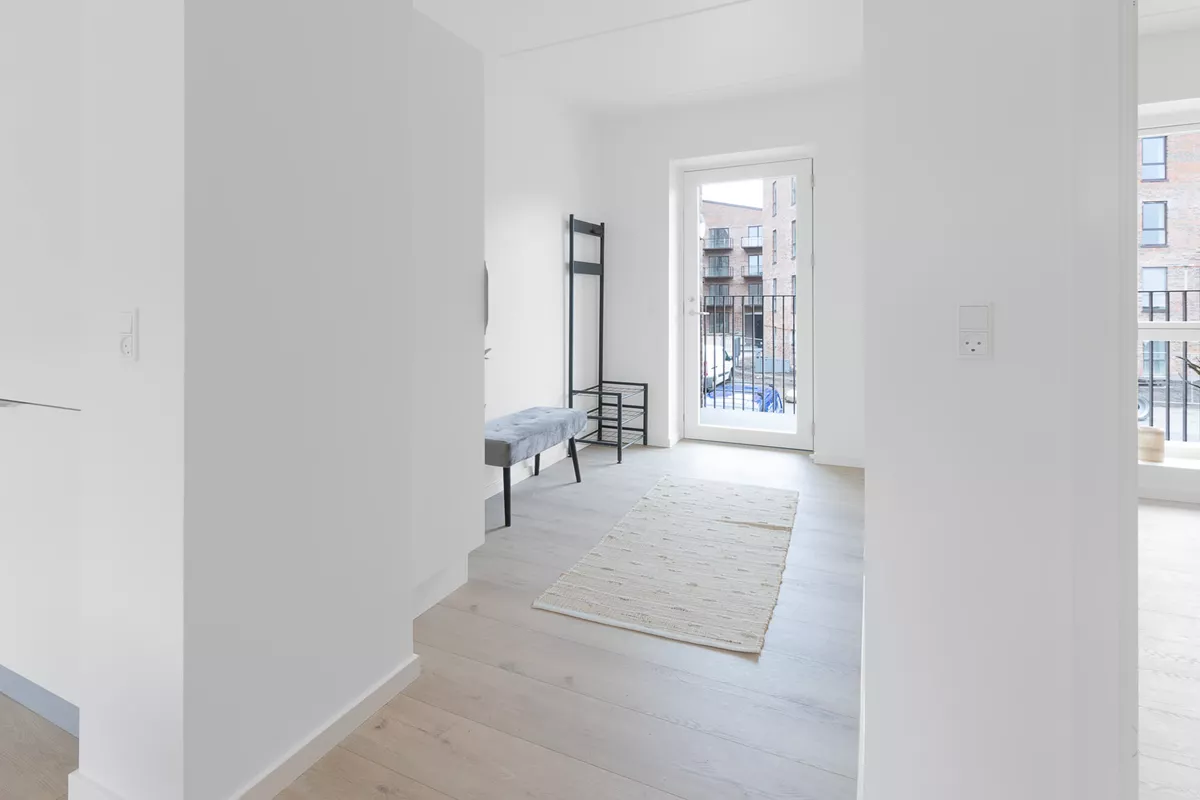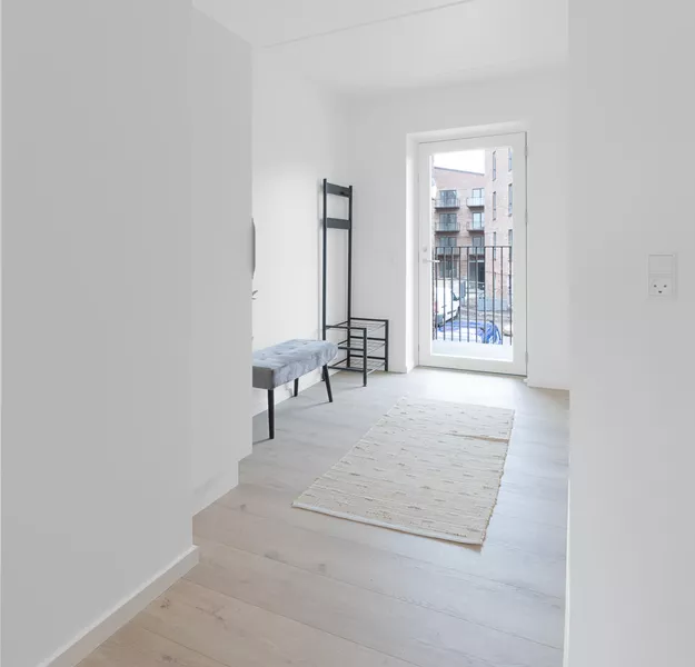 Lejligheden byder velkommen via en rummelig entré med fast skab samt god plads til at indrette rummet med eksempelvis en bænk og knagerække.