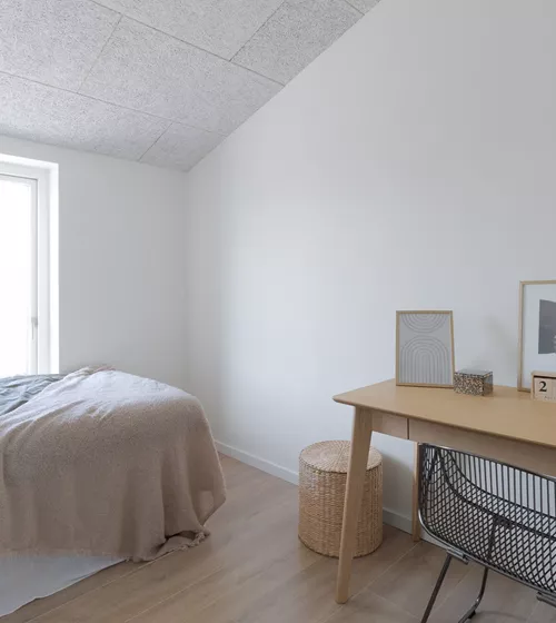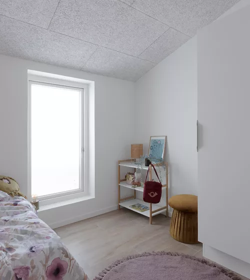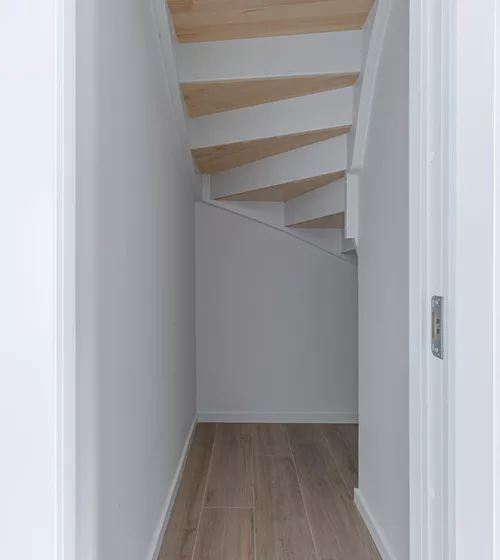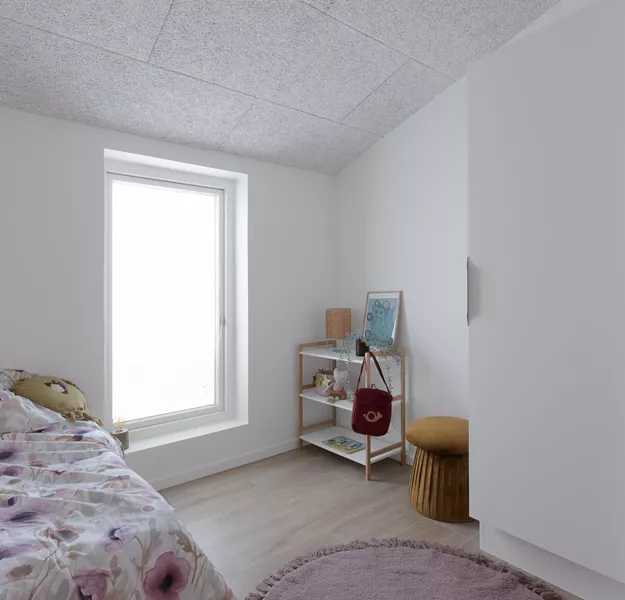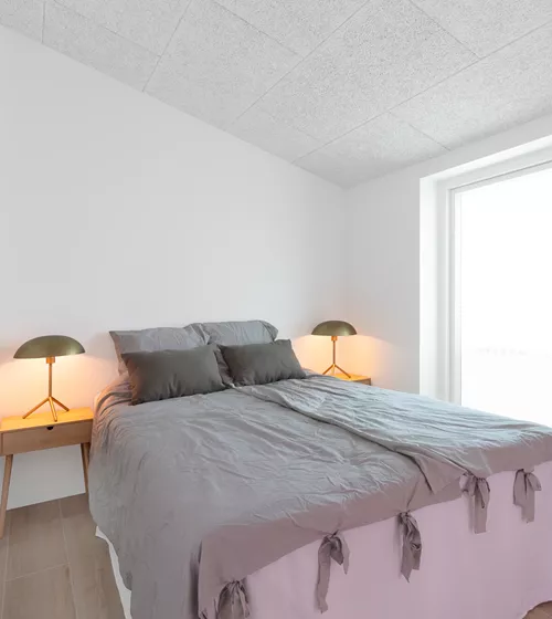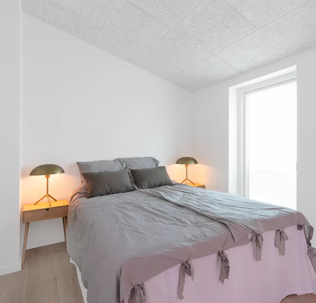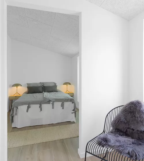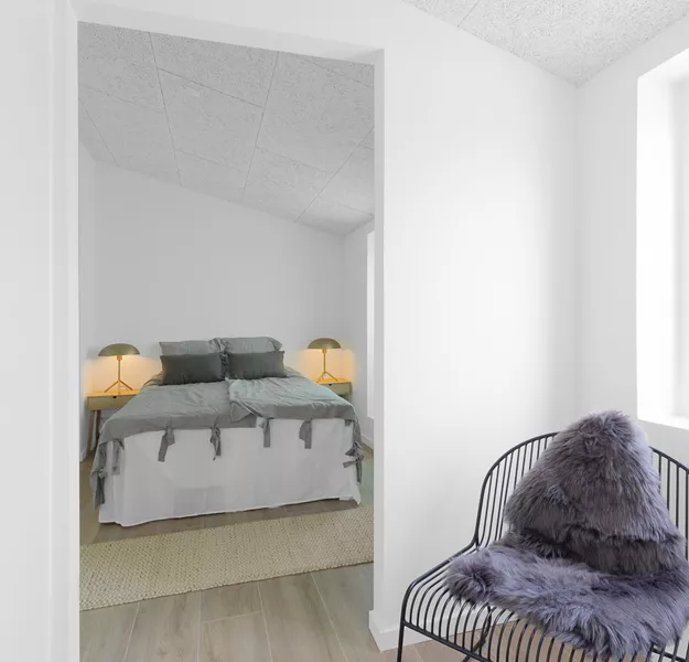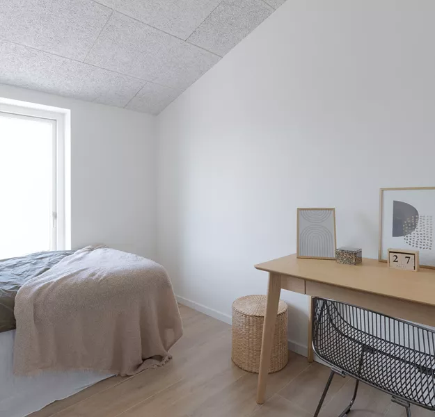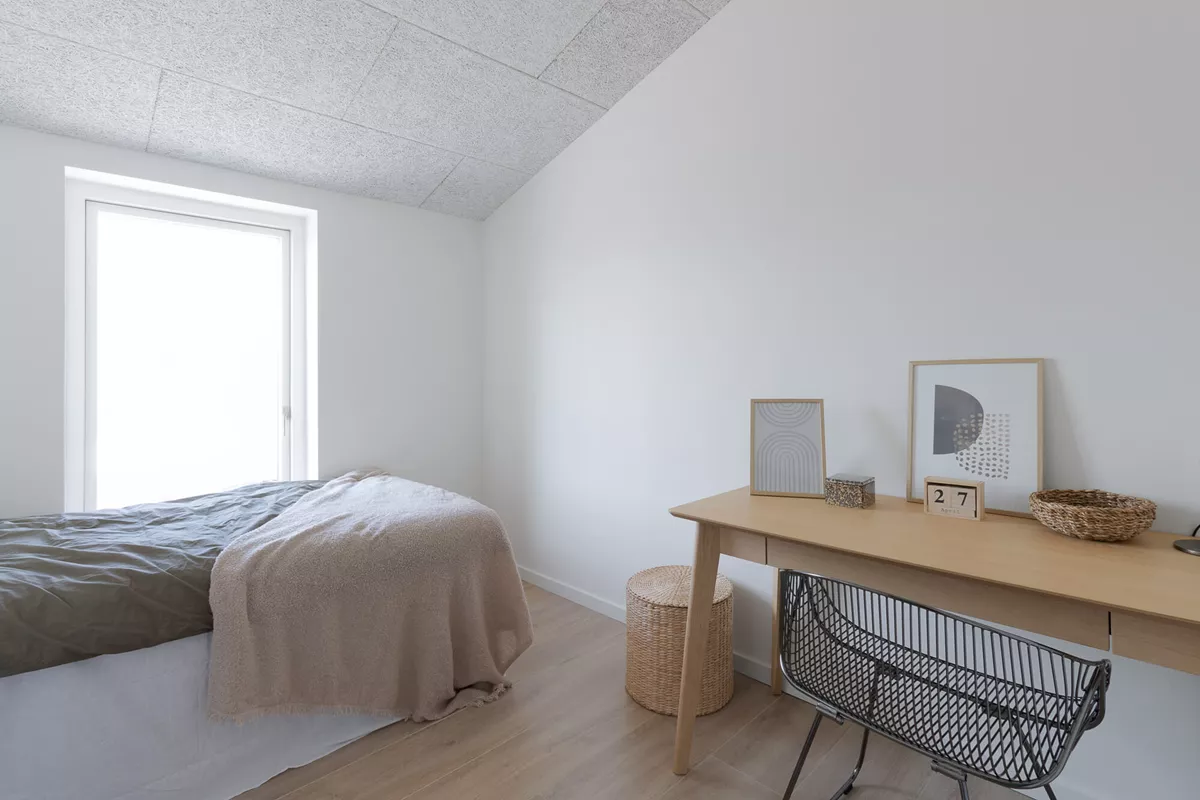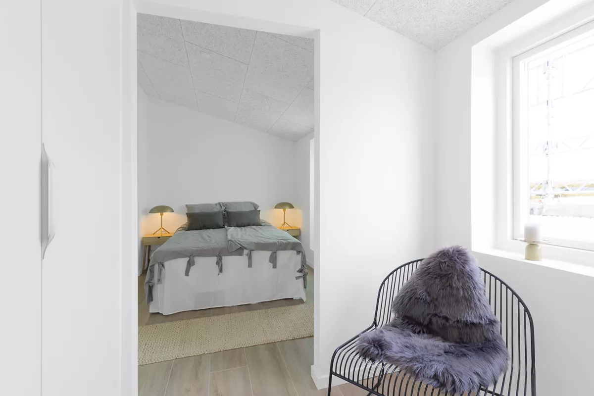 På 1. sal finder du boligens tre værelser. Soveværelset fylder den ene ende af etagen og har plads til en stor dobbeltseng samt ekstra møbler. Fra soveværelset er der adgang til et ekstra rum på ca. 5 m2, som er indrettet med tre fastmonterede skabe og kan bruges som walk-in-closet eller kontor. De to øvrige værelser har også opbevaringsskabe og er velegnede til brug som børneværelser, kontor eller hobbyrum, med plads til seng og andre møbler.