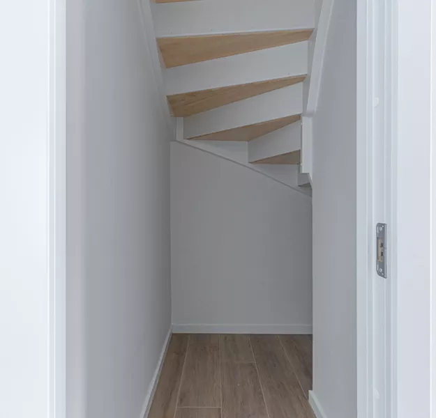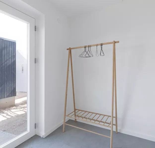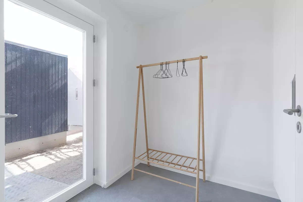 Entréen ligger i stueetagen og har tre fastmonterede garderobeskabe. Her er der god plads til at opsætte en skohylde og knagerække for at skabe en praktisk garderobeløsning.