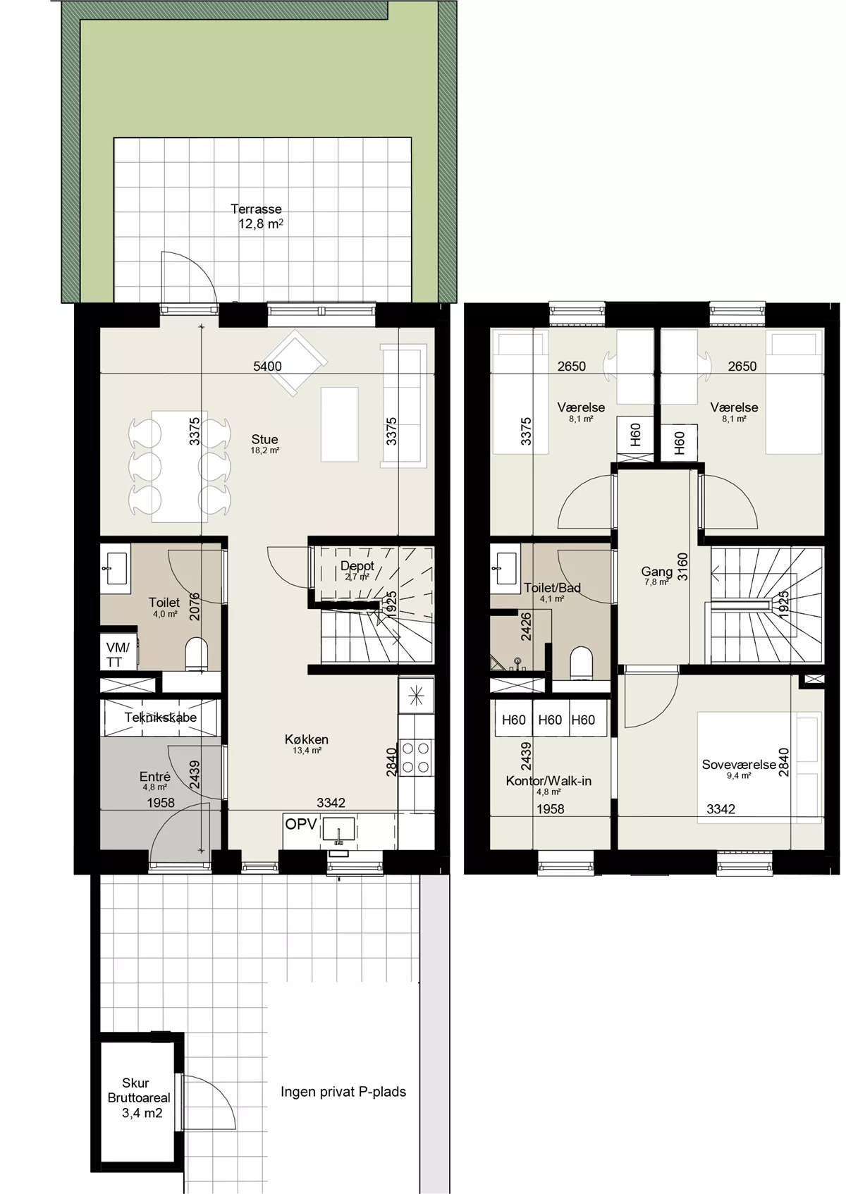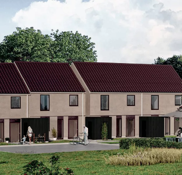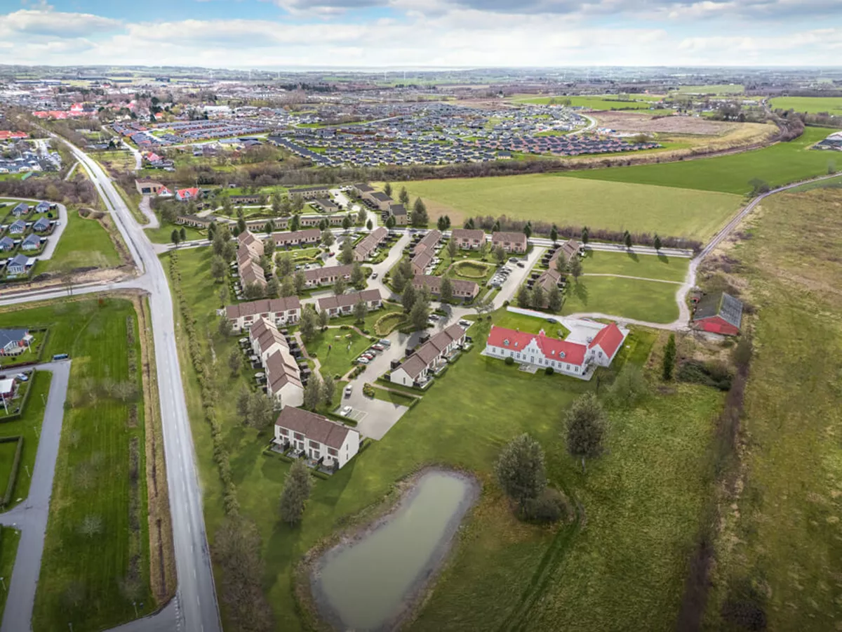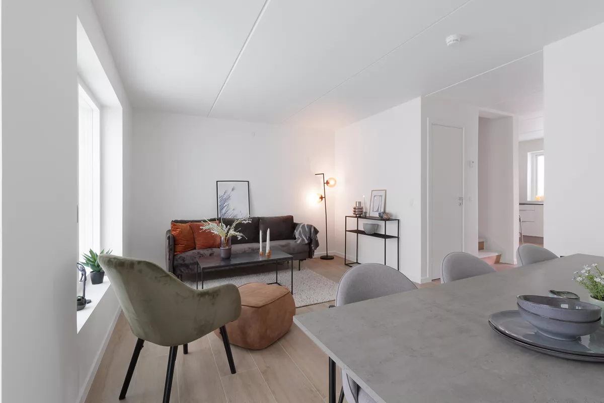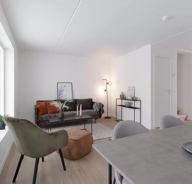 Boligen har dejlige udendørsarealer både foran og bagved. Foran er der et flisebelagt område, hvor du finder dit skur. Bagved findes en terrasse og et mindre græsareal. Bemærk, at alle billeder og plantegninger er vejledende.