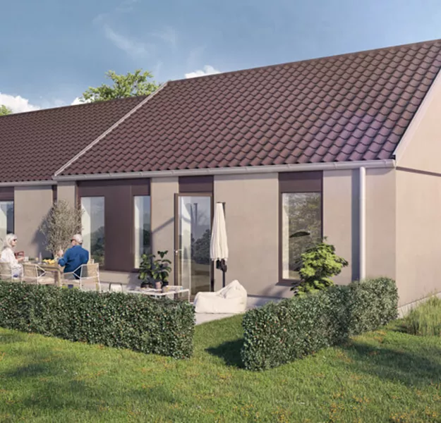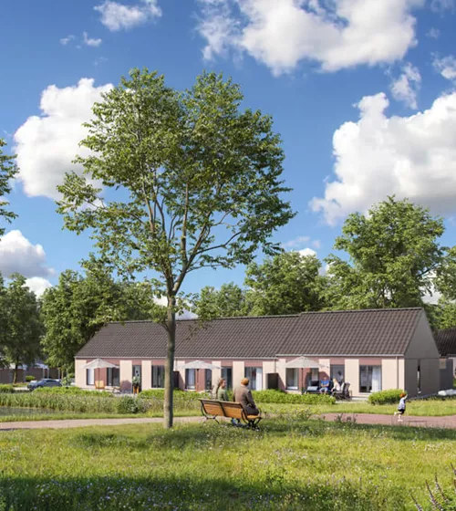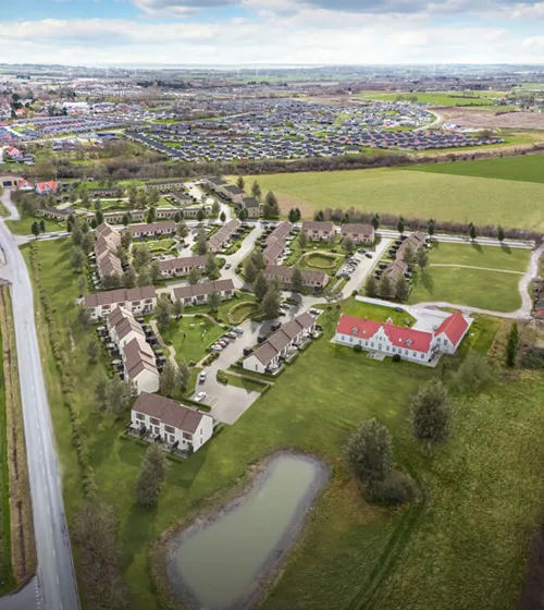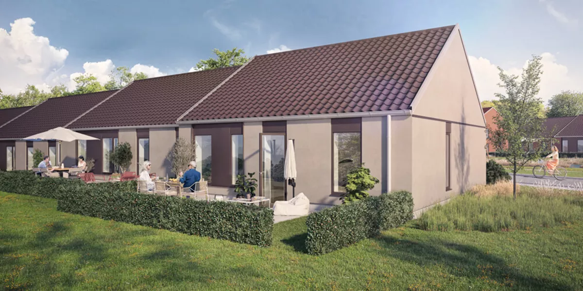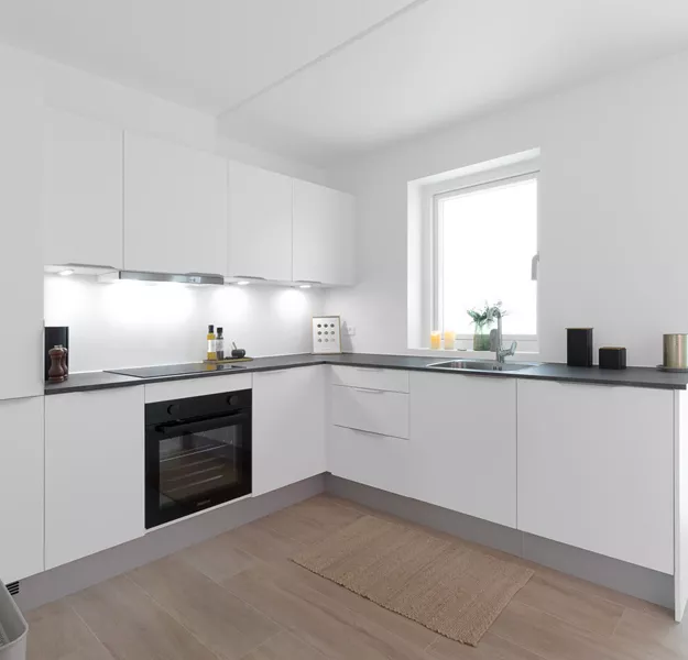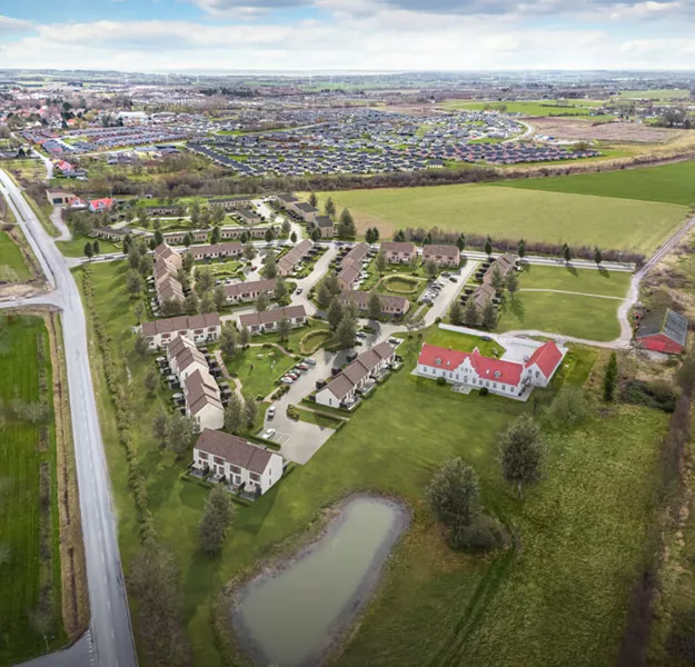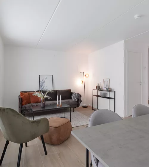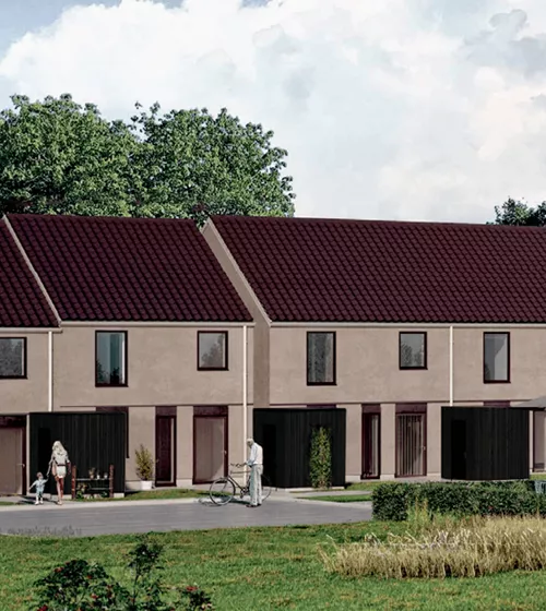 Boligen har dejlige udendørsarealer både foran og bagved. Foran er der et flisebelagt område, hvor du finder dit skur. Bagved findes en terrasse og et mindre græsareal. Bemærk, at alle billeder og plantegninger er vejledende.