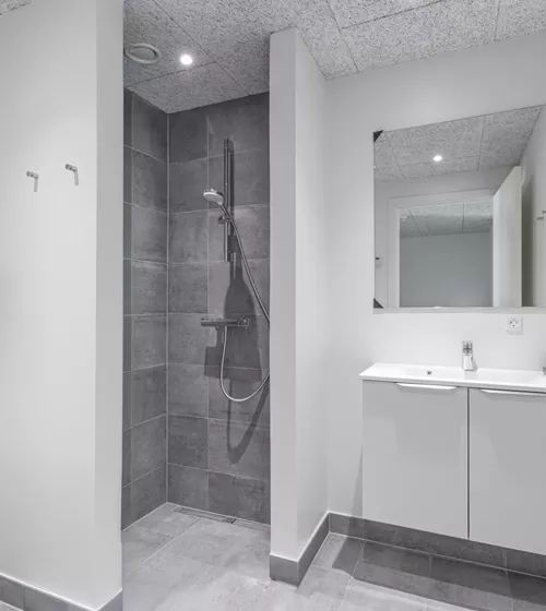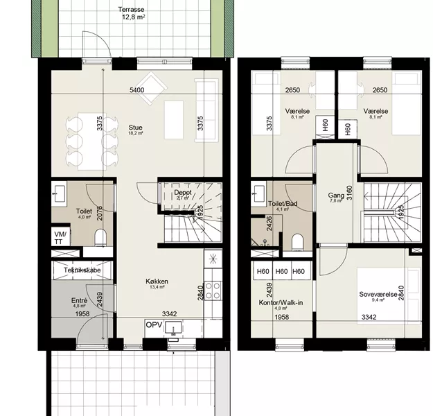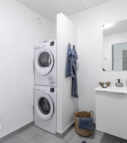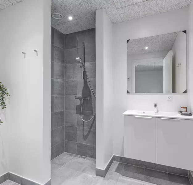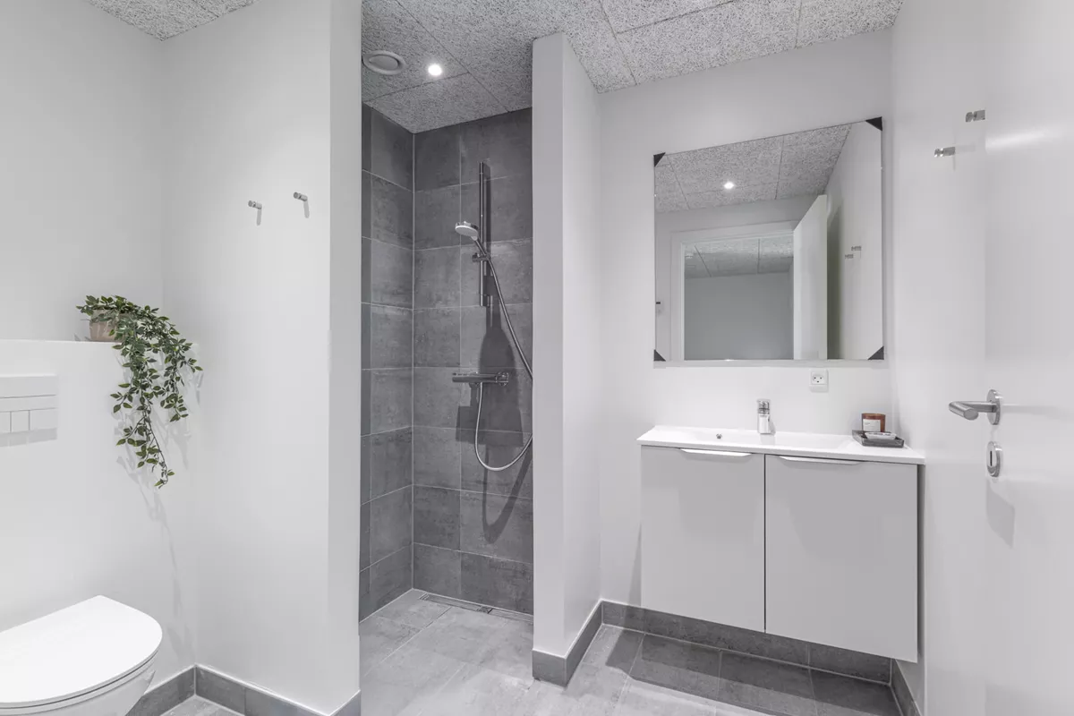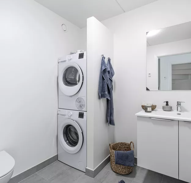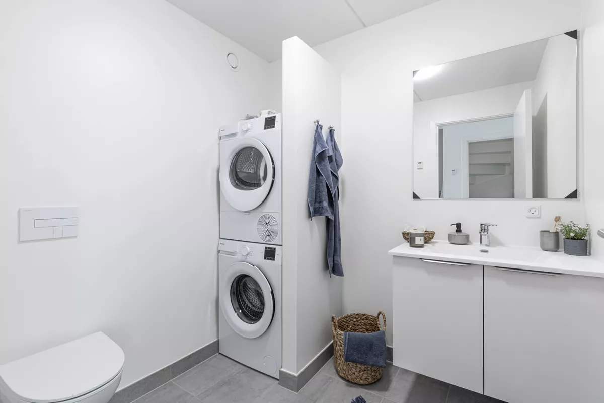 Boligen har et badeværelse på 1. sal samt et toilet med vaskemaskine og tørretumbler i stueetagen.