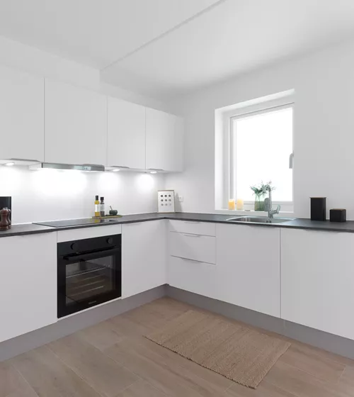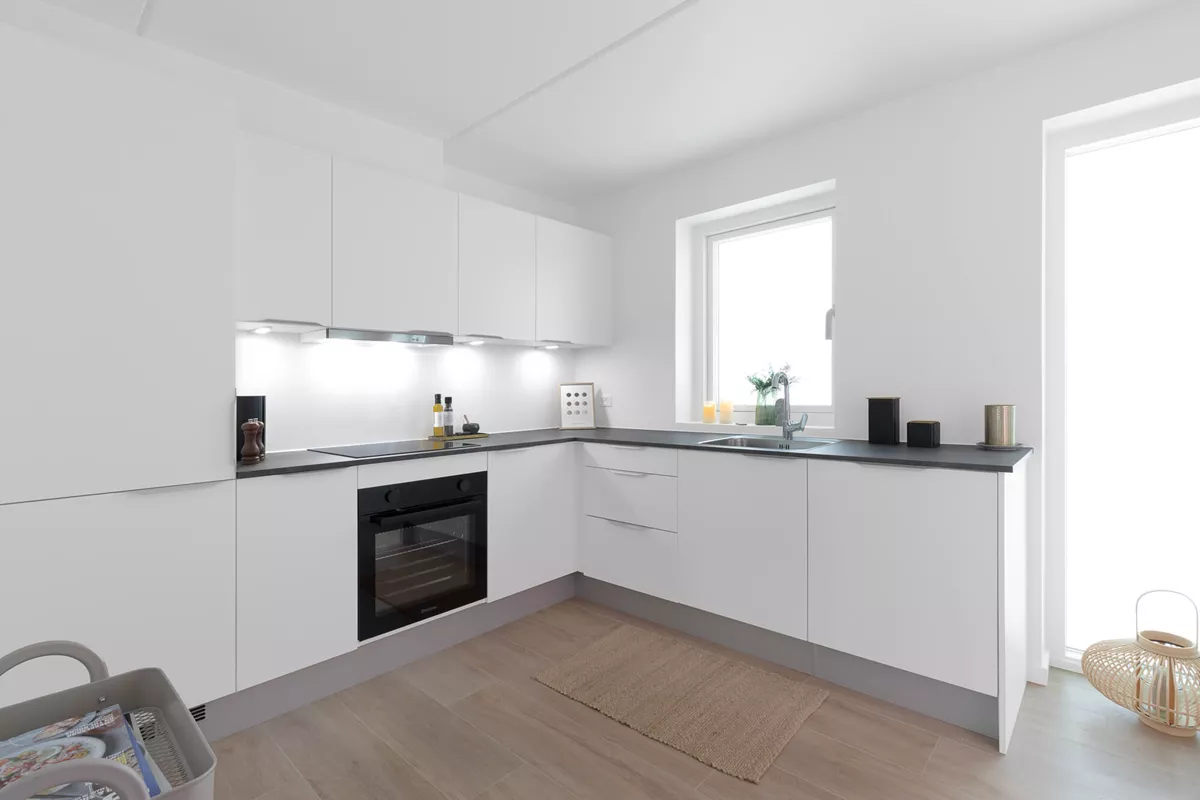 Dette rummelige rækkehus i to plan byder på et hyggeligt køkken-alrum, hvor køkken og stue naturligt opdeles af trappen. Køkkenet er praktisk placeret i en vinkel og er udstyret med moderne hårde hvidevarer. Spiseområdet og stuen ligger i forlængelse af køkkenet, og herfra er der direkte adgang til boligens udendørsareal.
