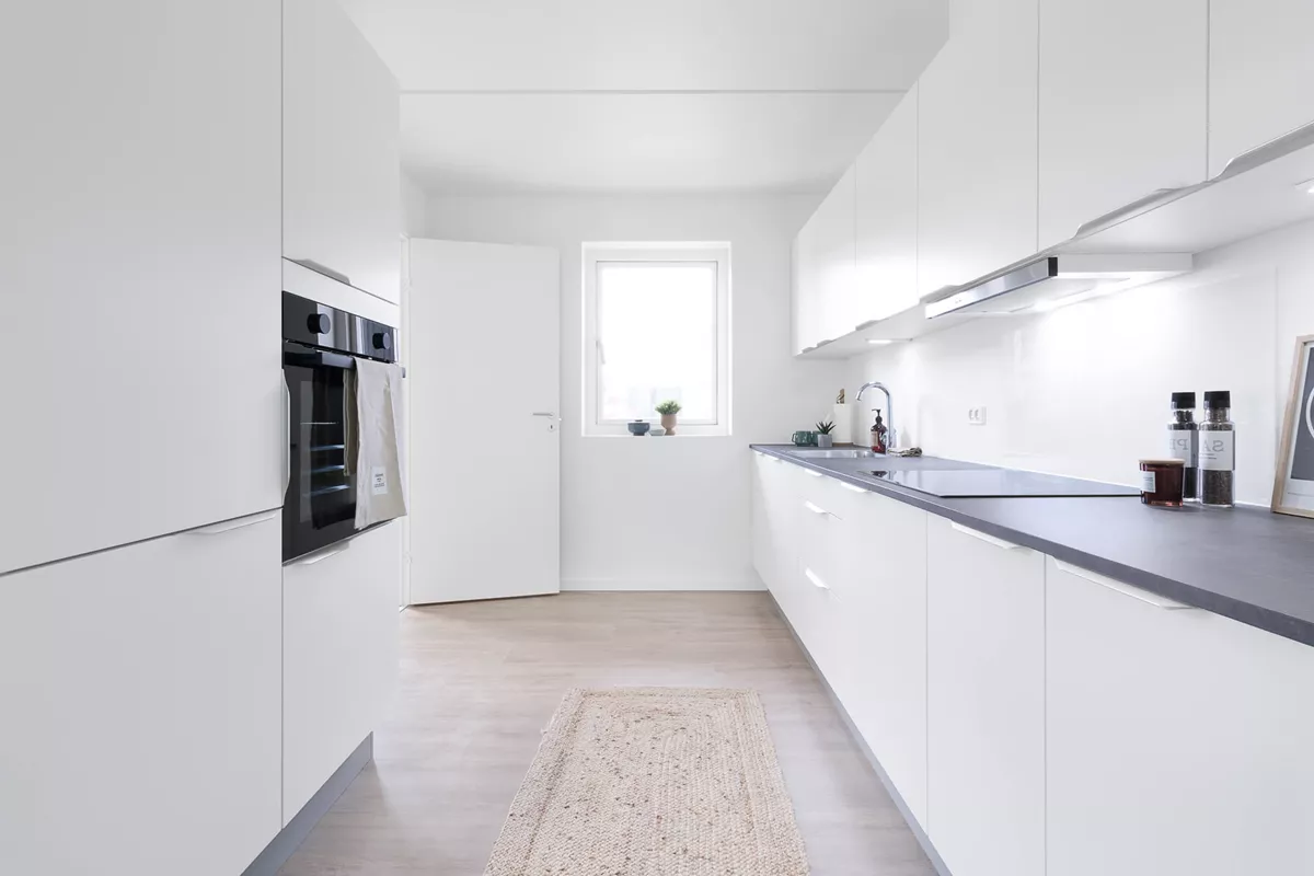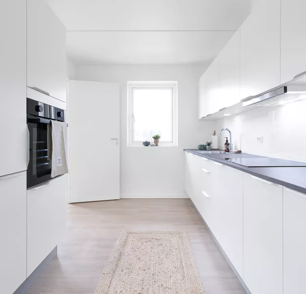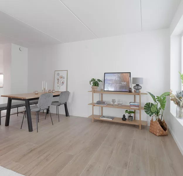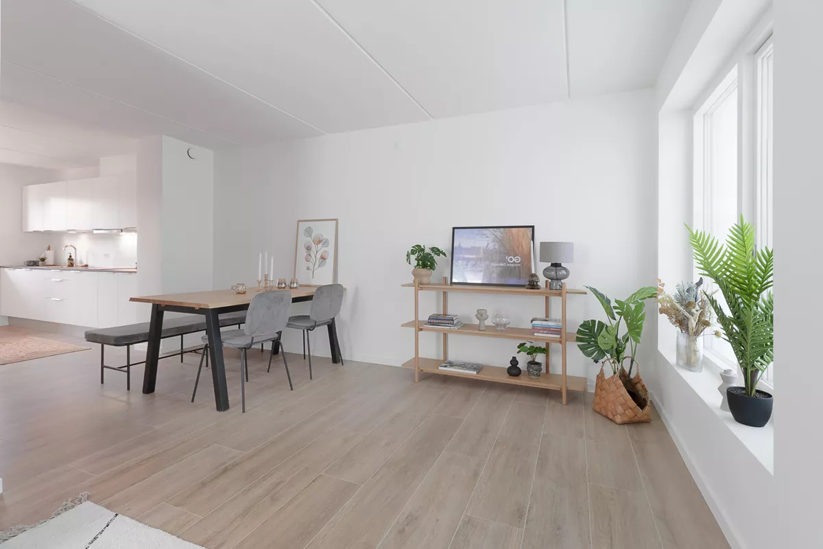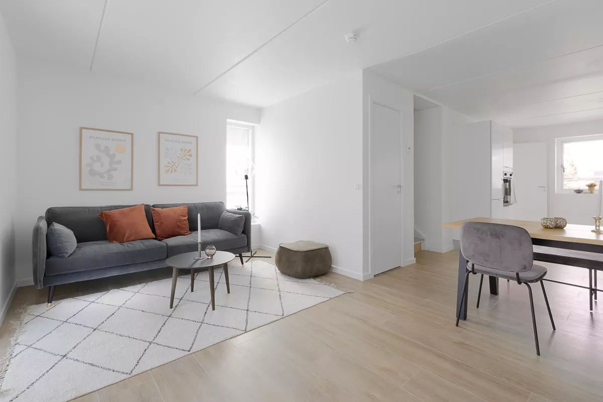 Hvis du drømmer om et stort 3-værelses rækkehus, så er du kommet til det rette sted. Her får du et rummeligt køkken-alrum, hvor køkkenet er placeret i den ene ende og giver god plads til spisebord og stuemøbler.
