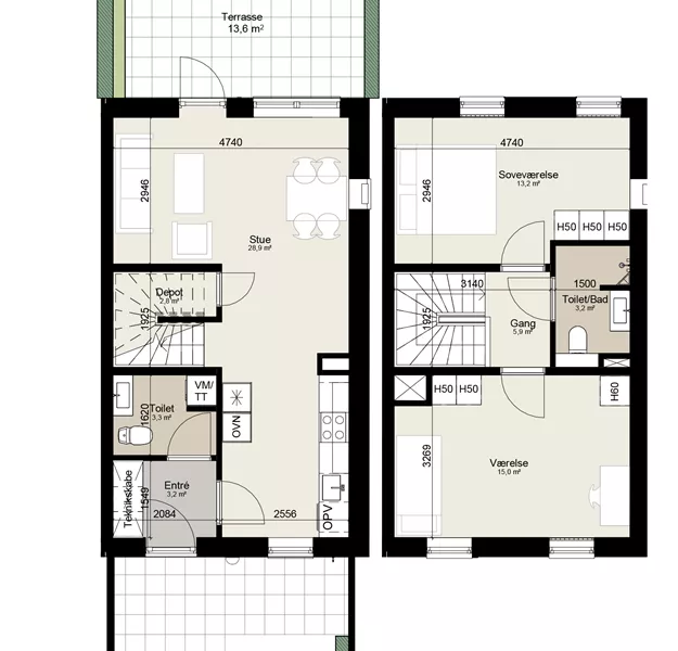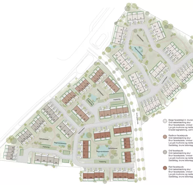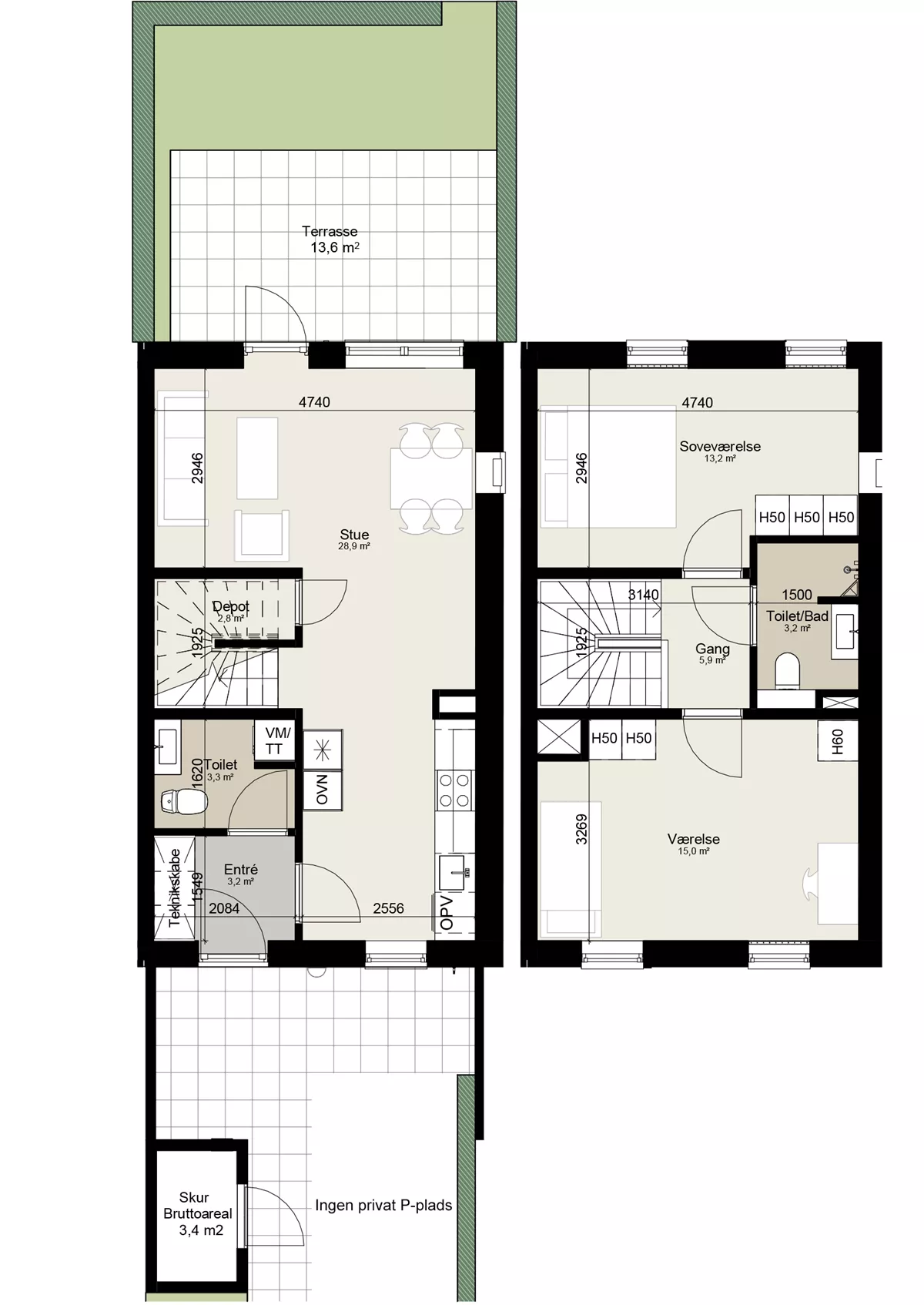 Fra rækkehusets stue er der direkte adgang til den hyggelige terrasse og dit grønne område. Foran boligen finder du også et flisebelagt område og dit opbevaringsskur. Obs. alle billeder og plantegninger er vejledende.