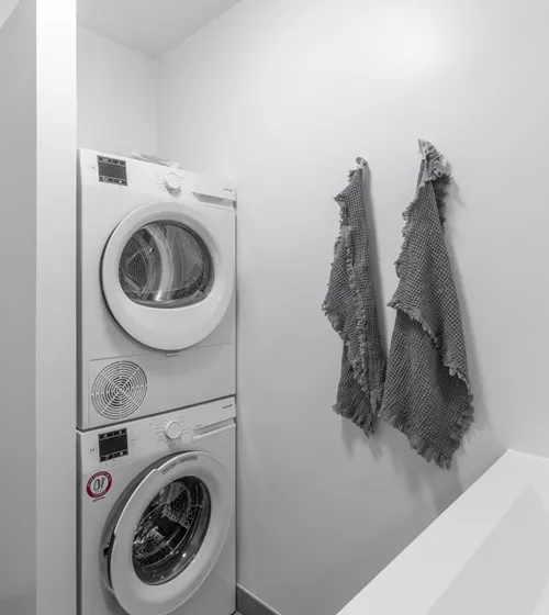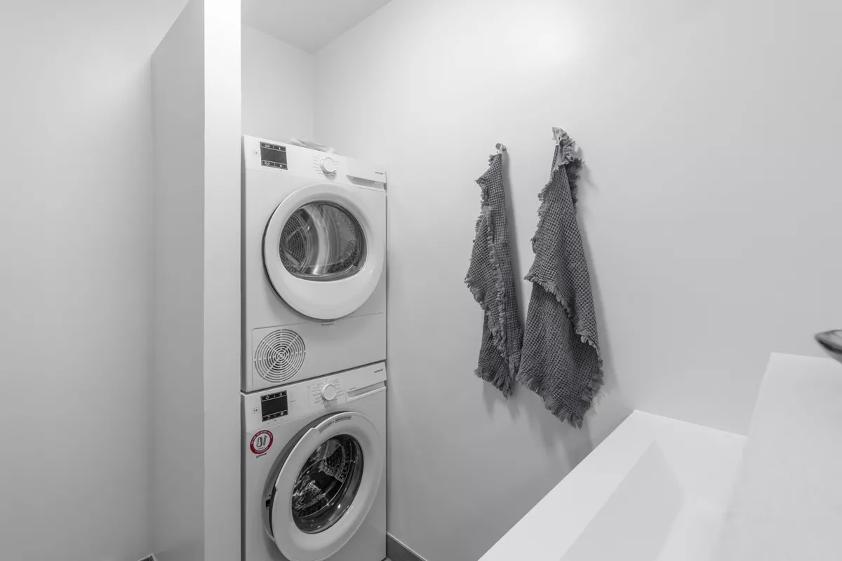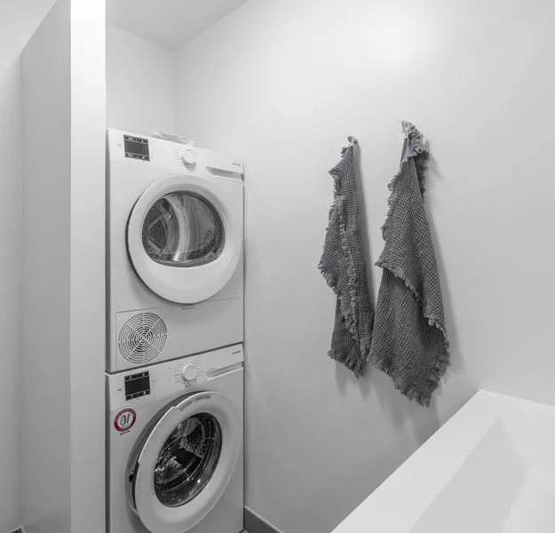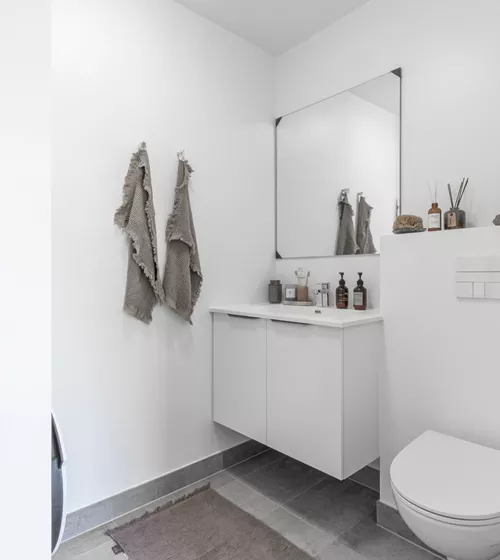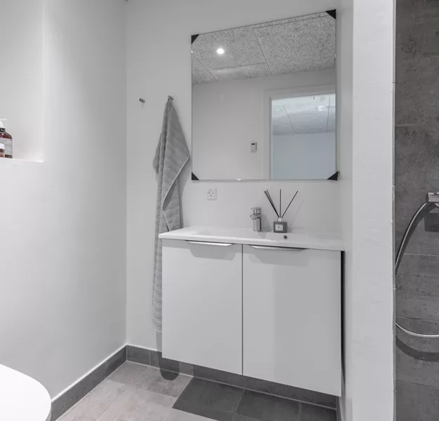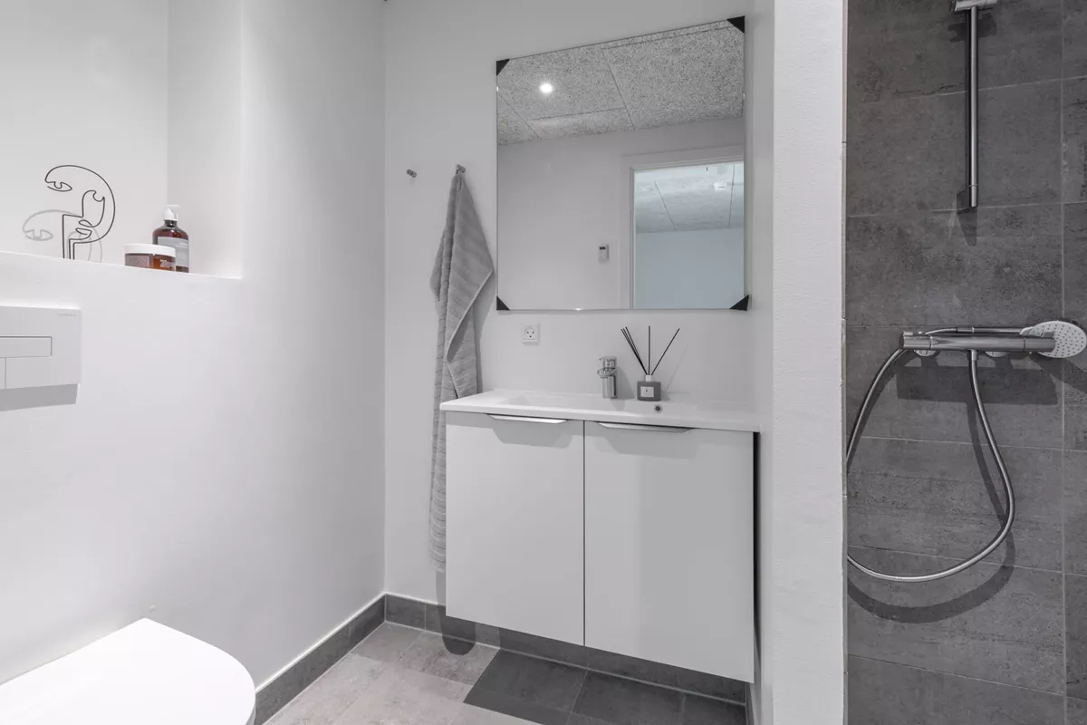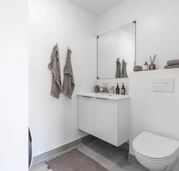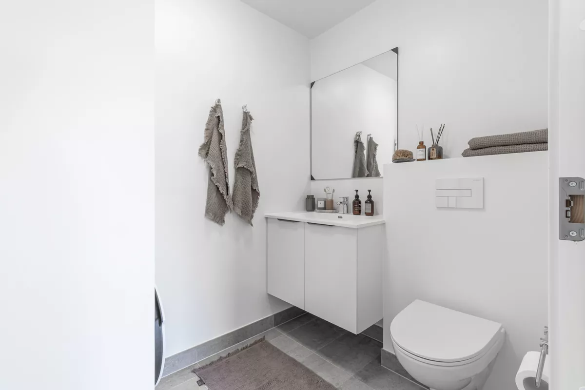 Boligen har et badeværelse og et ekstra toilet. Badeværelset er placeret på 1.sal og toilettet er i stueetagen. Det er også her din vaskemaskine/tørretumbler er placeret.