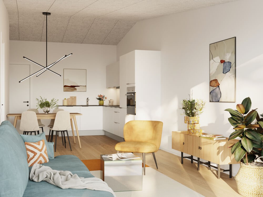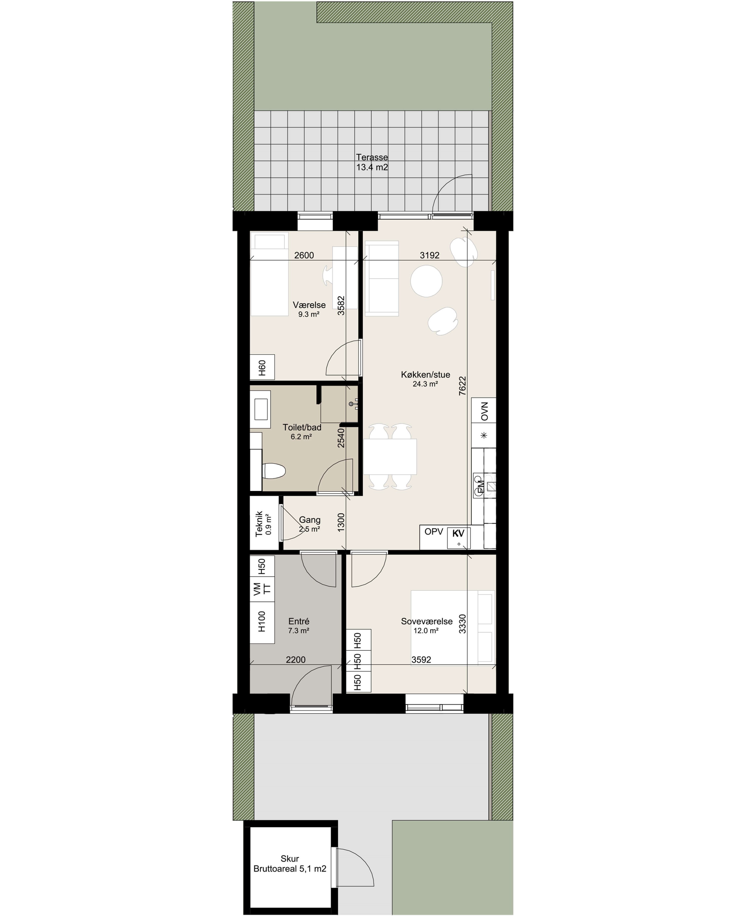 Bag boligen har du en terrasse med fin plads til havemøbler samt et grønt område til blomster eller plantekasser. Foran boligen ligger dit private skur og et flisebelagt område, hvor du kan have et fint cafébord. Obs. alle billeder og plantegninger er vejledende.