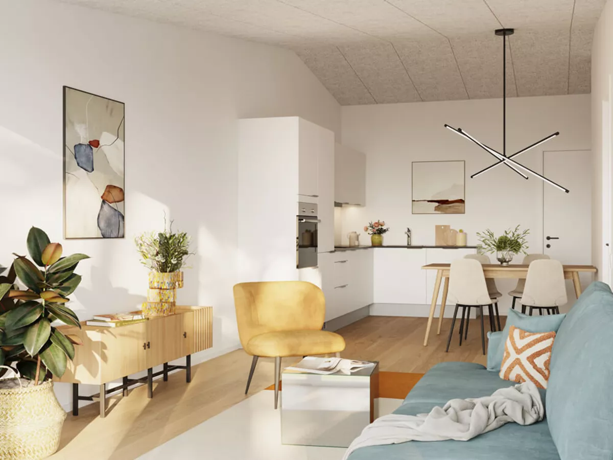 I dette indbydende 3-værelses rækkehus ligger køkkenet og stuen i forlængelse af hinanden. Køkkenet er placeret i en vinkel, så du har god plads til et spisebord. Forlængelsen af rummet skaber et hyggeligt hjørne til sofa og TV. Fra stuen er der direkte udgang til terrassen.