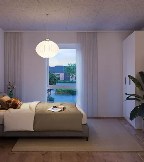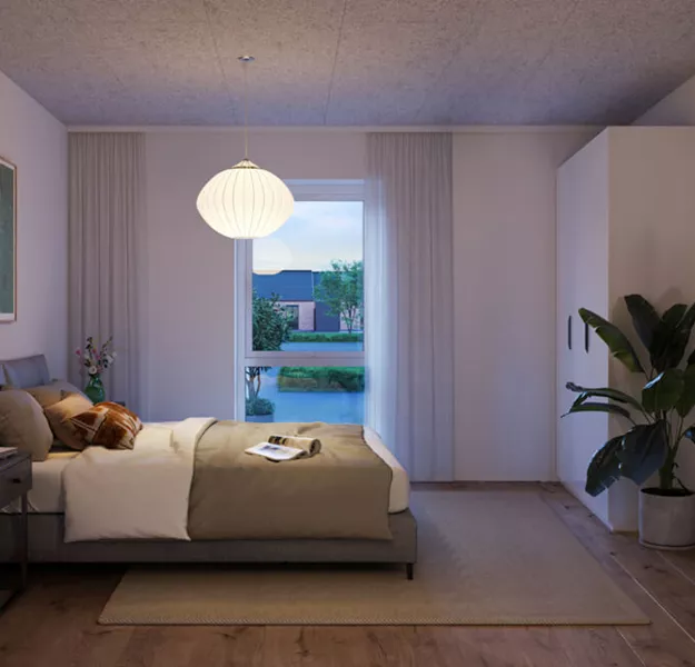 Boligens soveværelse er rummeligt med plads til dobbeltseng, sengeborde og ekstra opbevaring. Tre indbyggede højskabe følger med. Det andet værelse ligger ud mod terrassen og kan anvendes til fx børneværelse eller kontor.