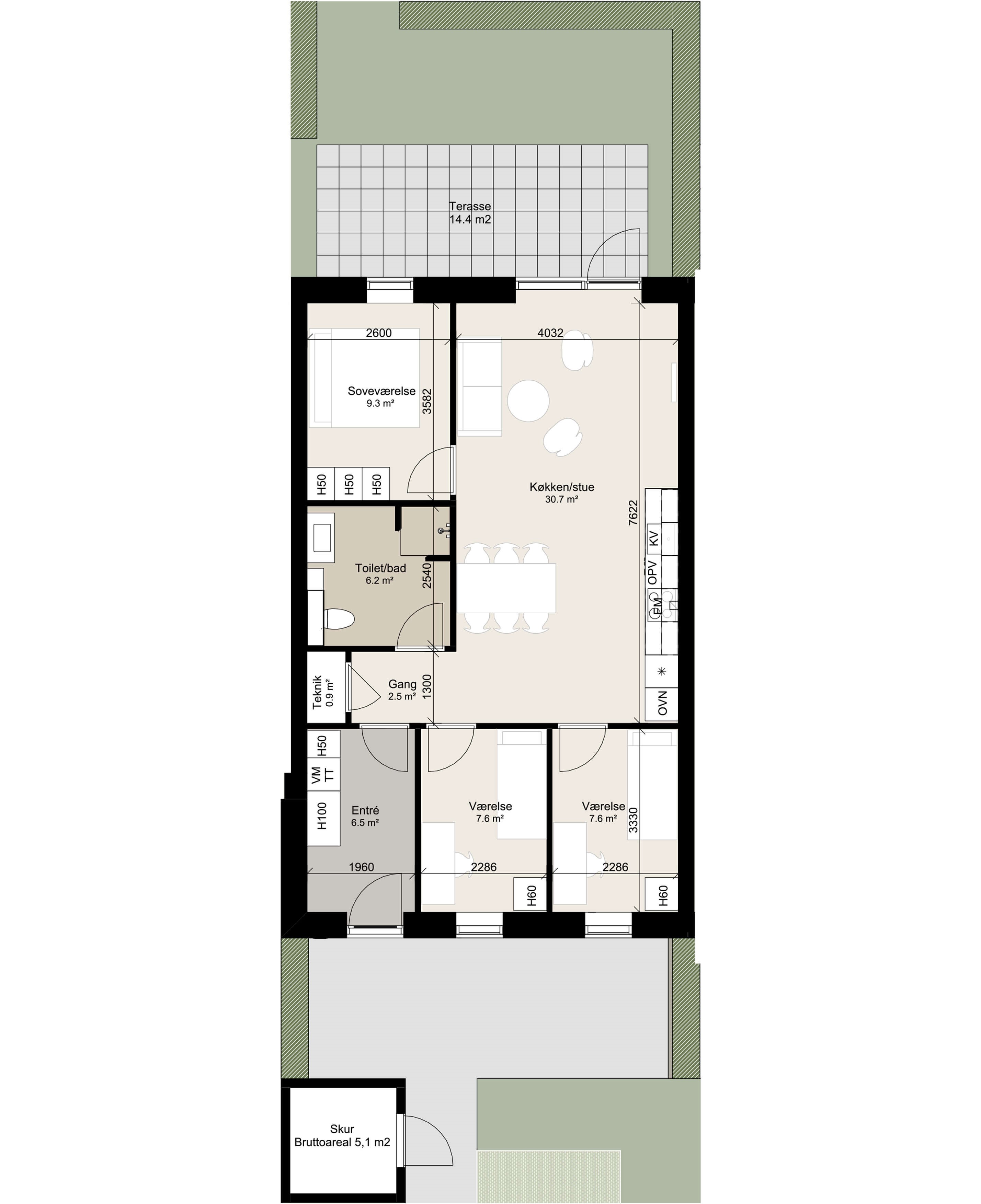 Boligen har egen terrasse, hvor du kan stille havemøbler, krukker eller en grill. Obs. alle billeder og plantegninger er vejledende.