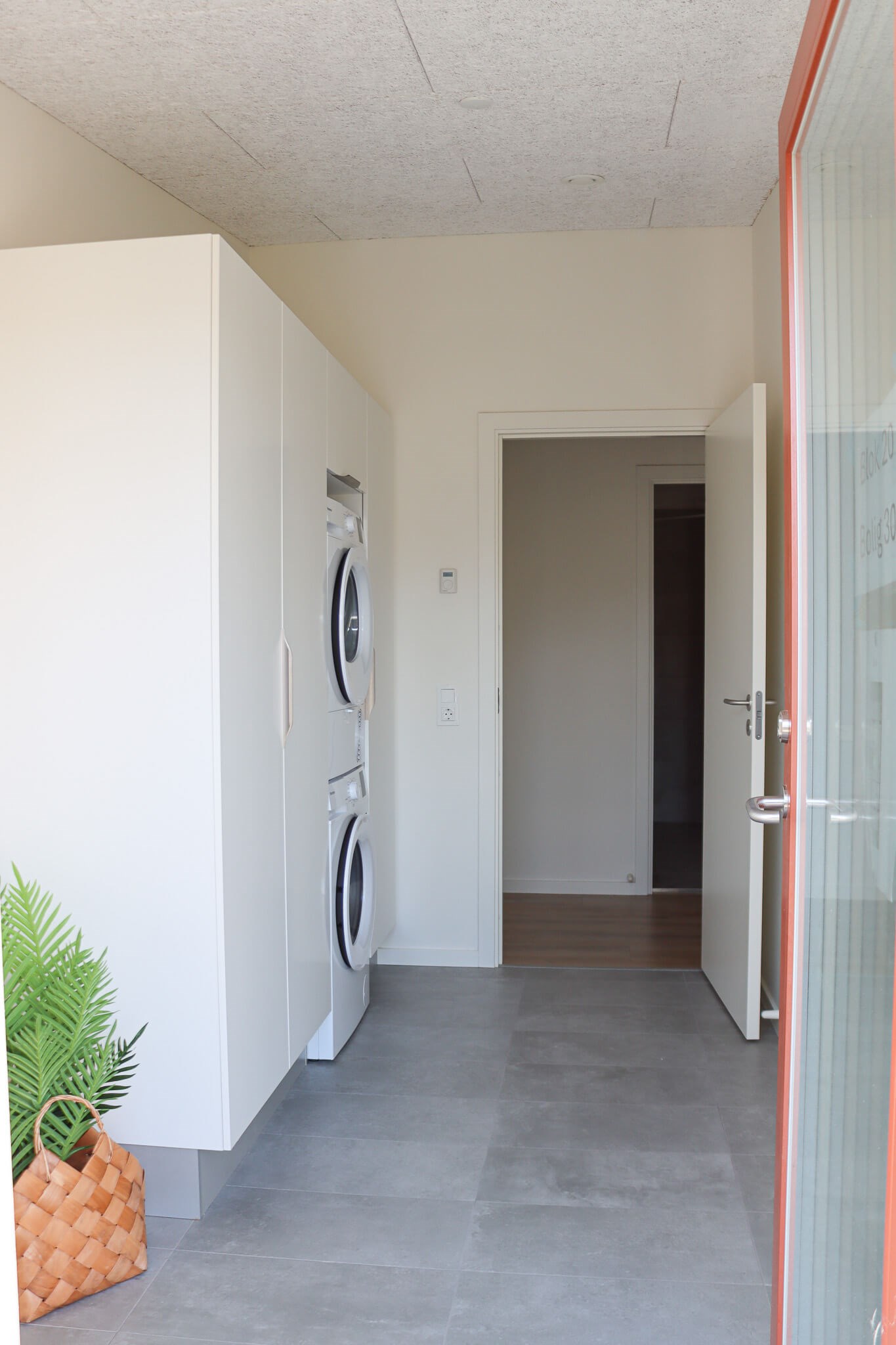 I boligens entré finder du store opbevaringsskabe. Det er også her din vaskemaskine/tørretumbler er. Der er i øvrigt god plads til yderligere at indrette med ekstra opbevaring eller blot pynte med en bænk og planter.
