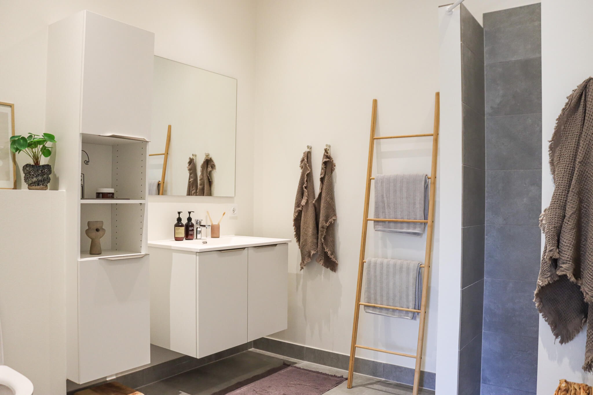Badeværelset tilgås via den lille gang, der også forbinder køkken og entré. Badeværelset opføres i materialer og farver, der passer til resten af boligen. Det indeholder toilet, håndvask samt en bruseniche.