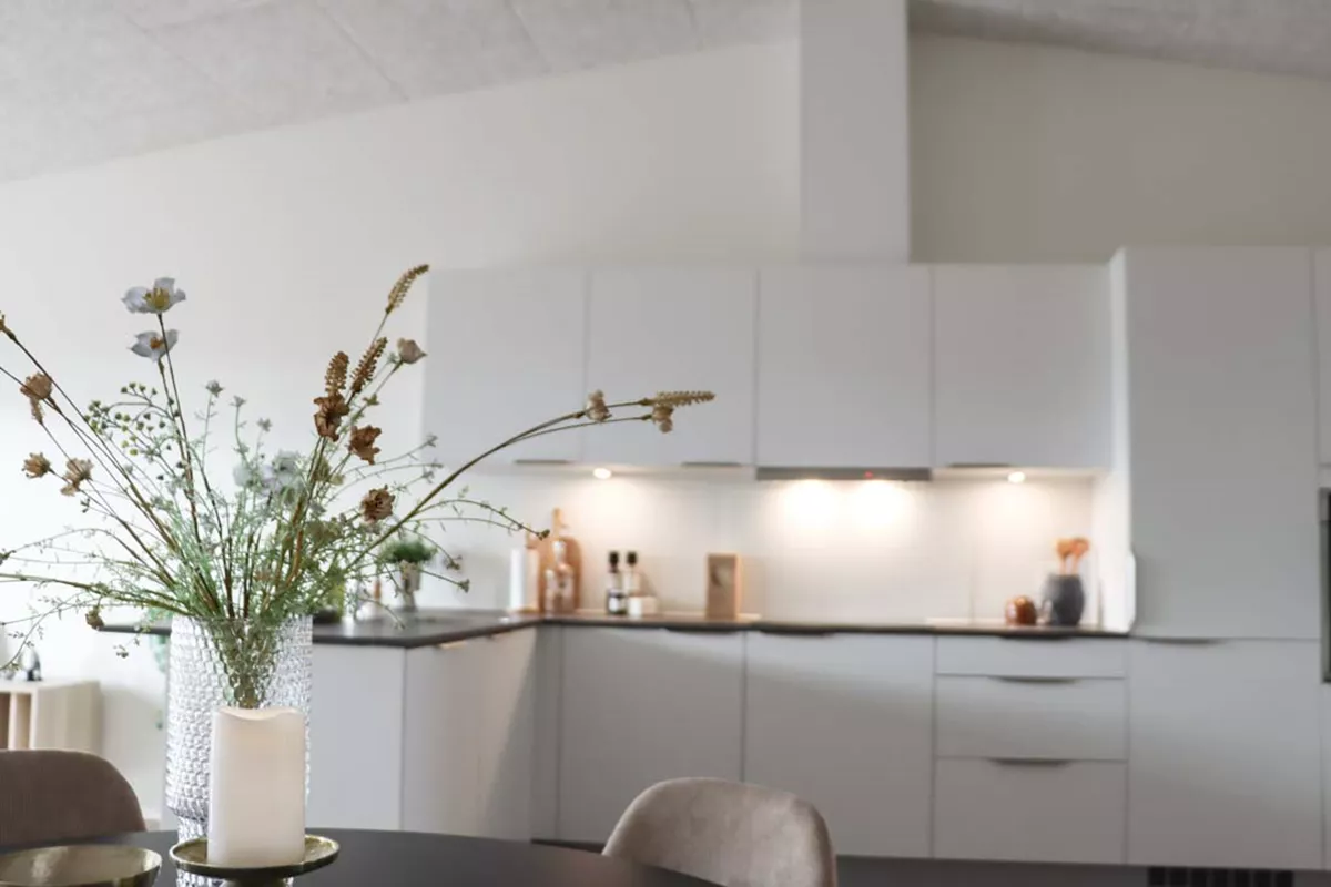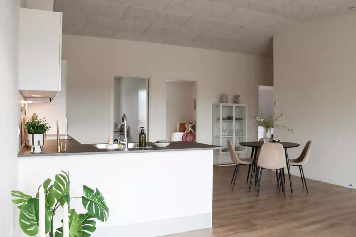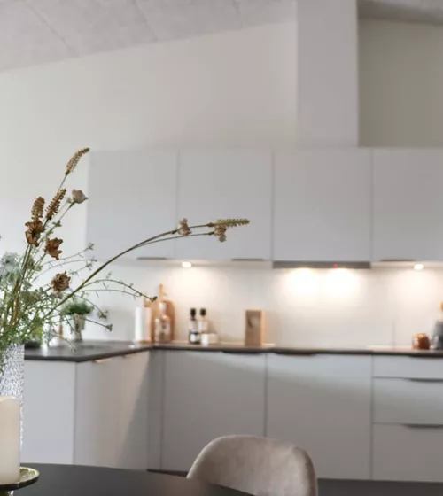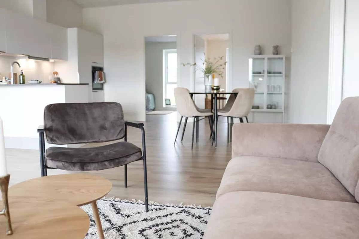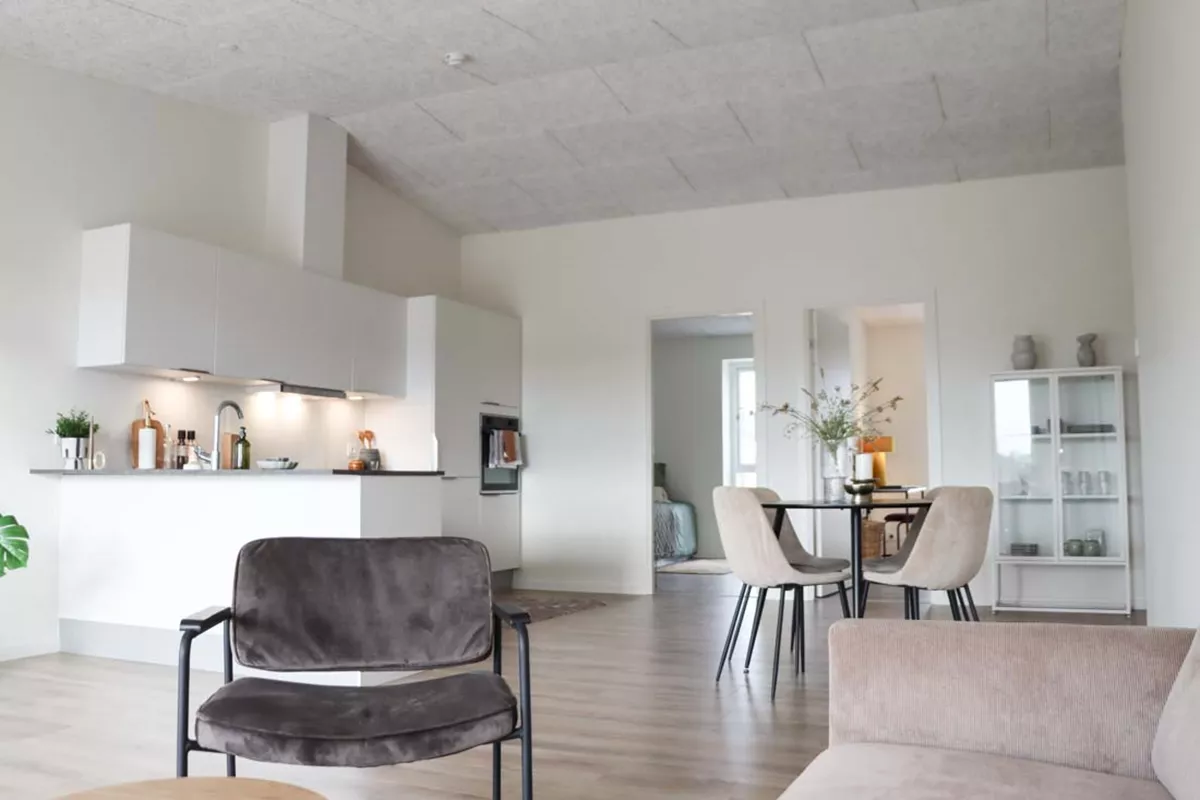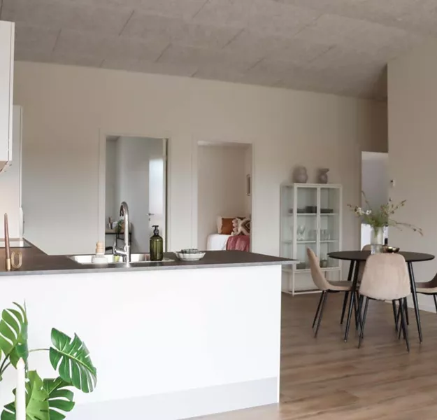 Her har du et stort og lækkert køkken-alrum, der naturligt opdeles med det vinklede køkken. I køkkenområdet er der plads til er stort spisebord og i resten af alrummet har du plads til en stor sofa og tv-område.