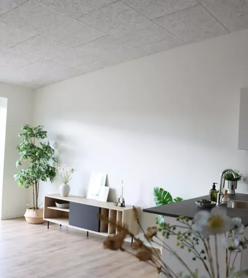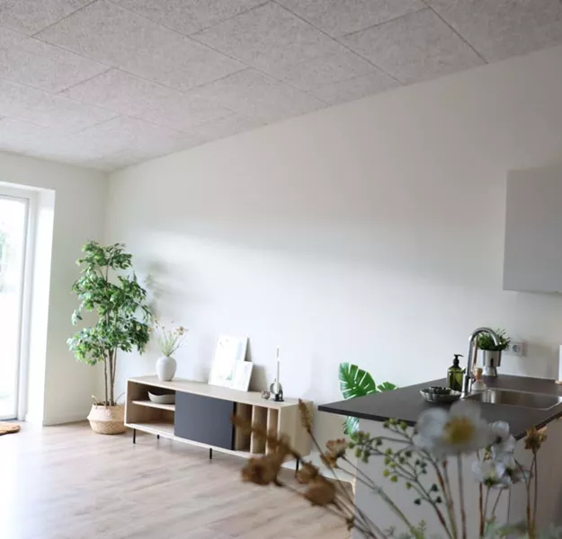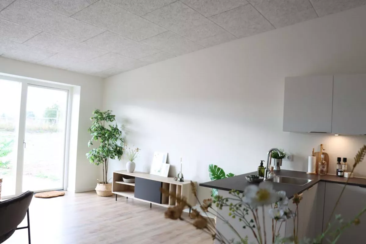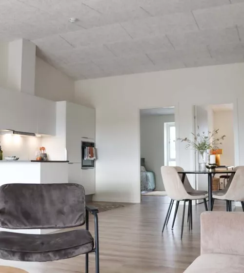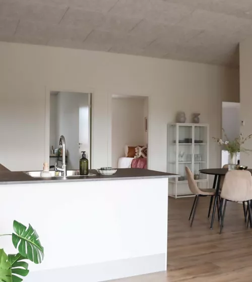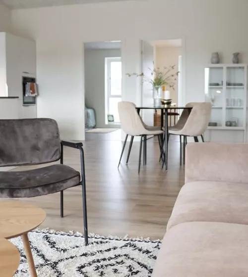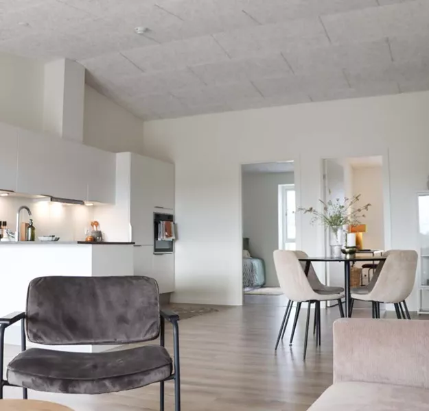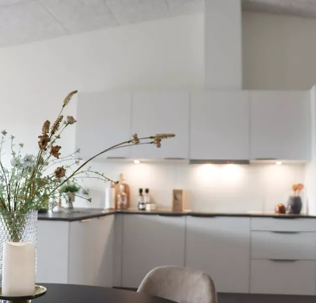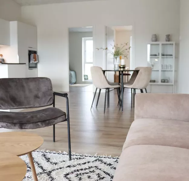 Her har du et stort og lækkert køkken-alrum, der naturligt opdeles med det vinklede køkken. I køkkenområdet er der plads til er stort spisebord og i resten af alrummet har du plads til en stor sofa og tv-område.