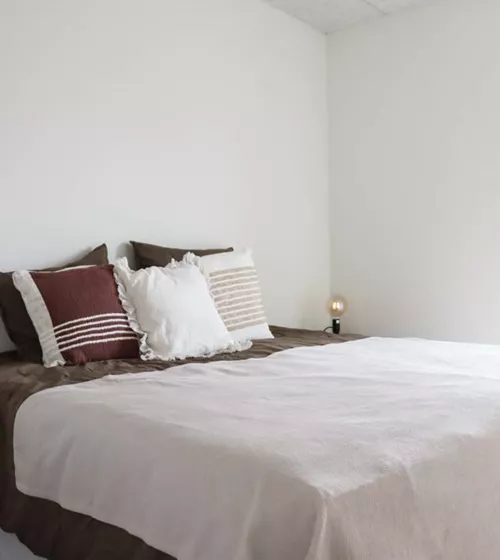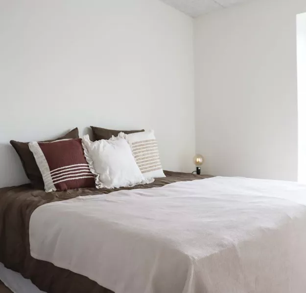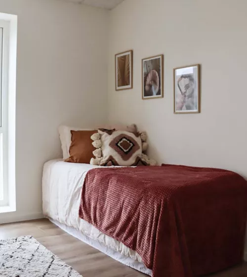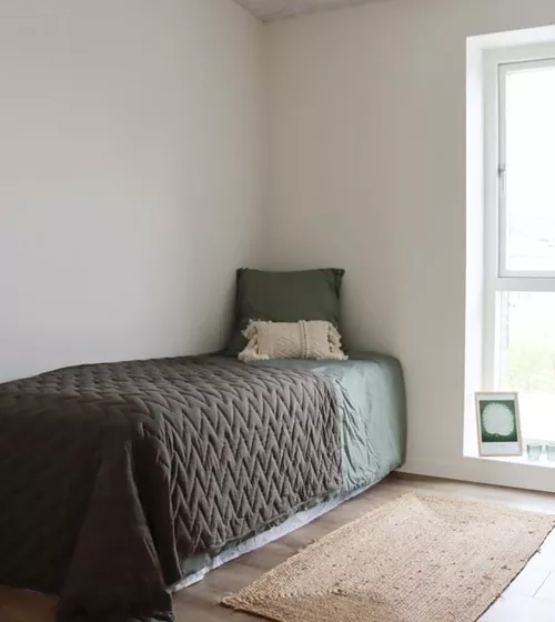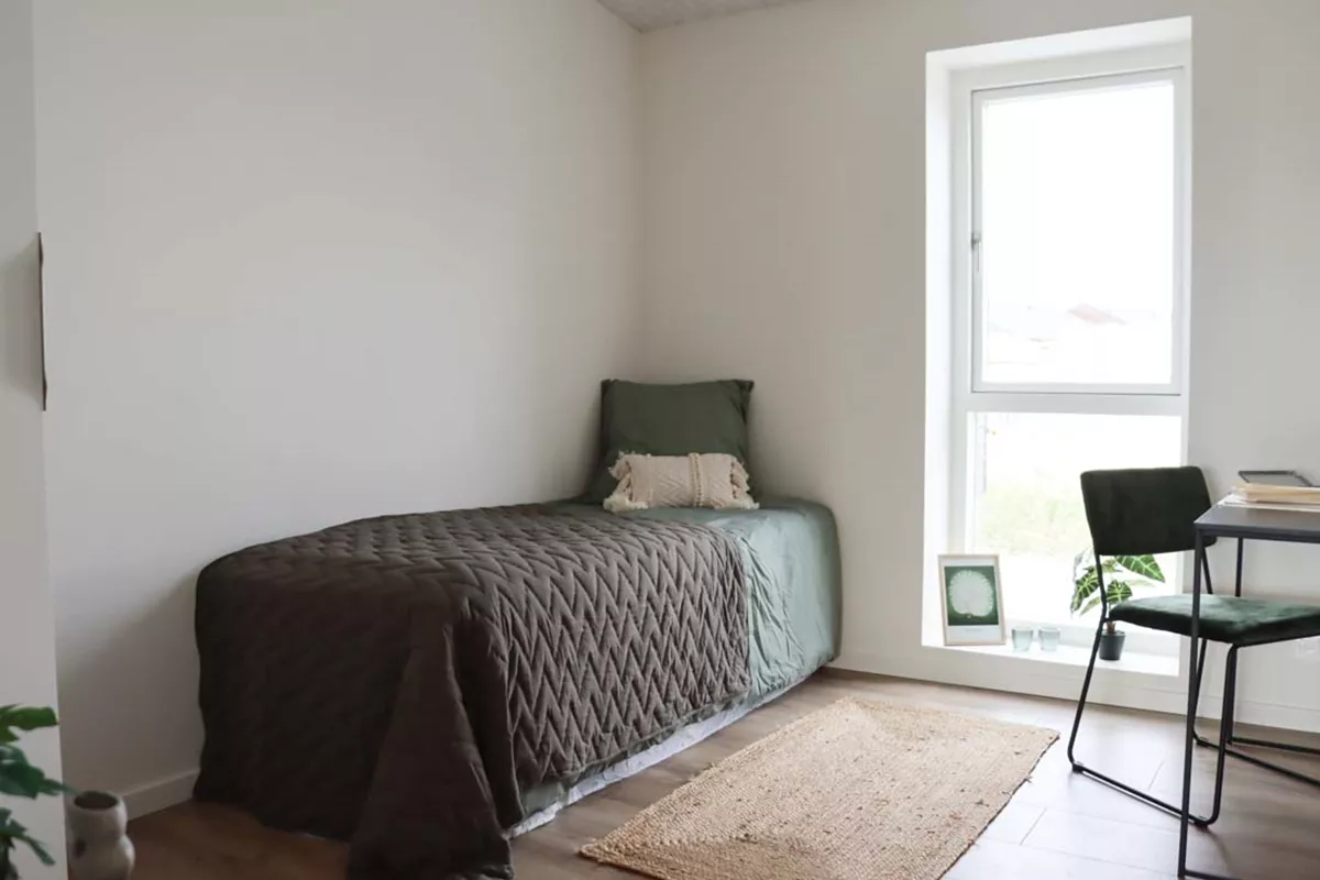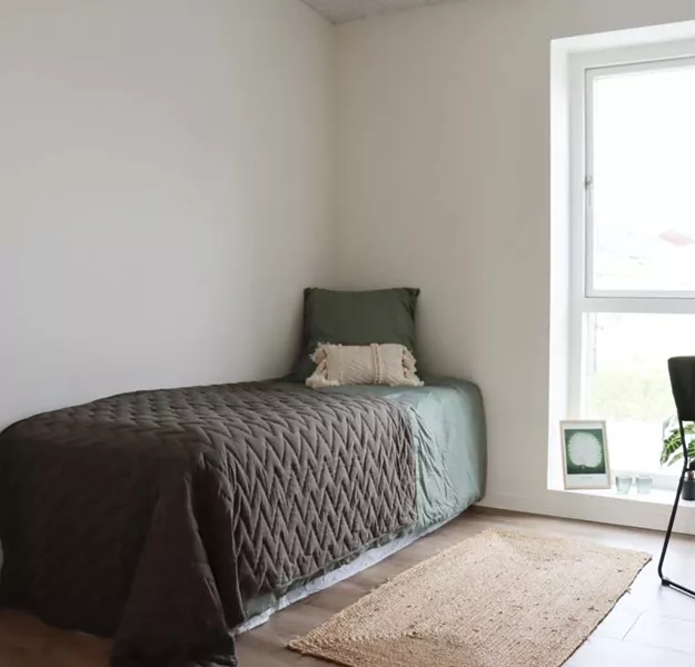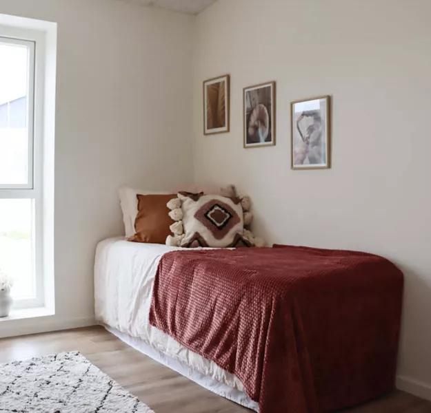 Boligen indeholder i alt tre værelser. Soveværelset er placeret i den ene ende med udgang til stuen. Rummet opføres med tre fastmonterede opbevaringsskabe og har fint plads til en stor seng og ekstra indretning. De resterende værelser ligger i modsatte ende. Værelserne er optimale som børneværelse, gæsteværelse eller kontor.