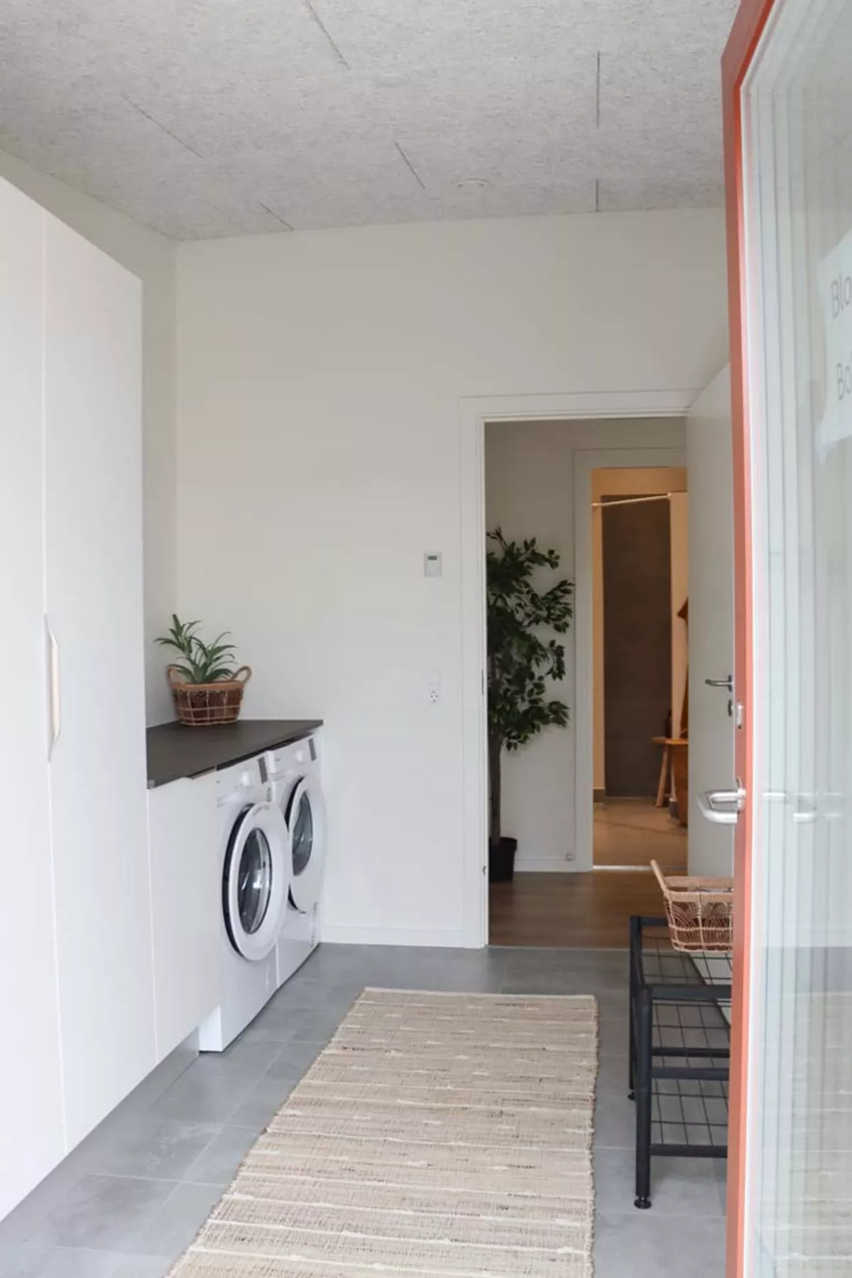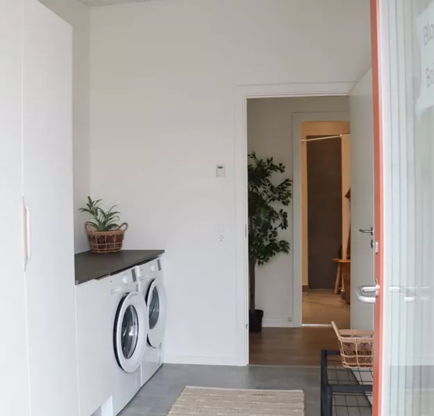 Når du træder ind i boliger, bliver du mødt af den fine entré. Her er der gjort god plads til opbevaring via rummelige højskabe. Det er desuden også her din vaskemaskine og tørretumbler er placeret.