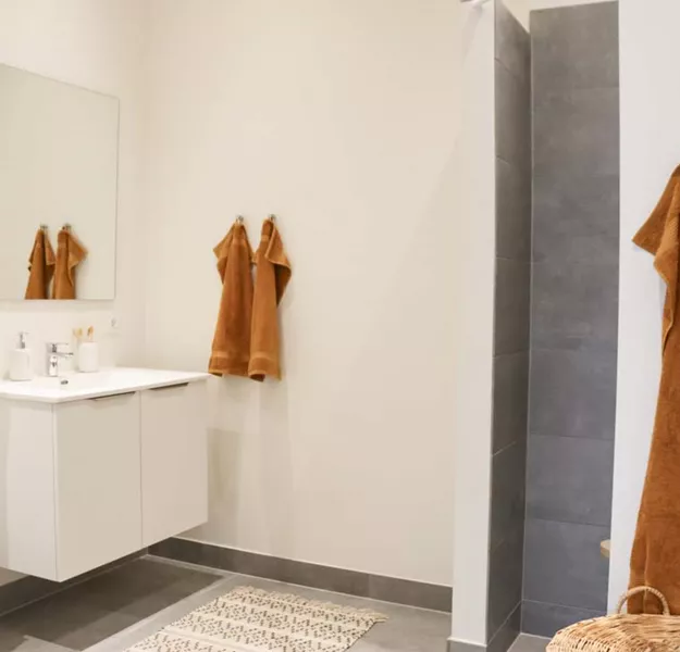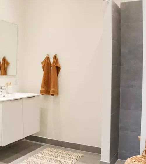 Badeværelset opføres i flotte materialer, der passer til resten af boligen og indeholder bruseniche, toilet og håndvask.